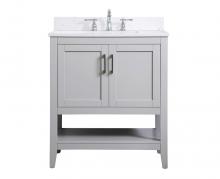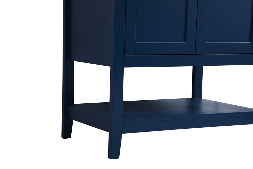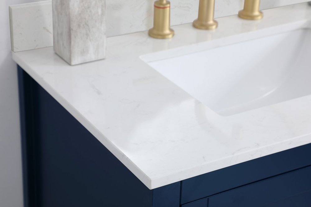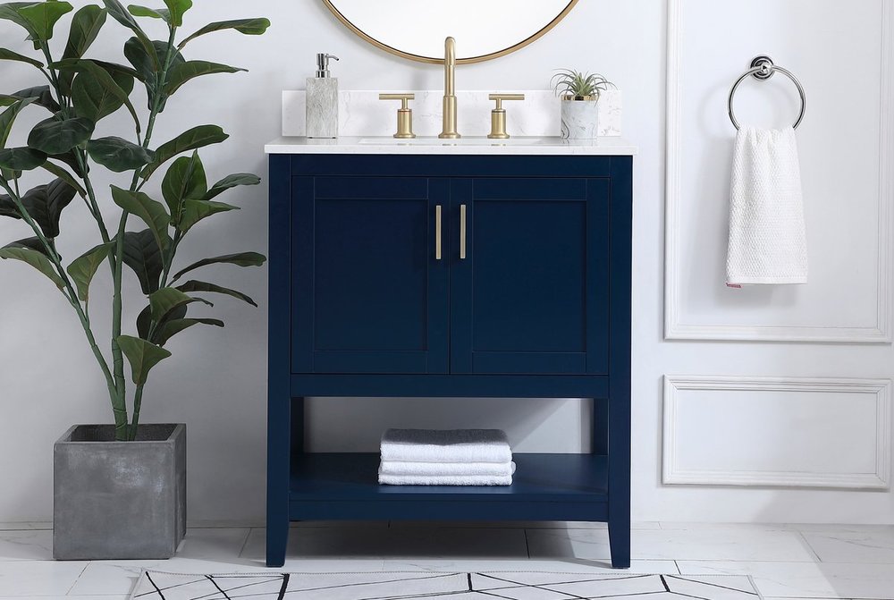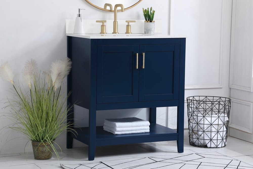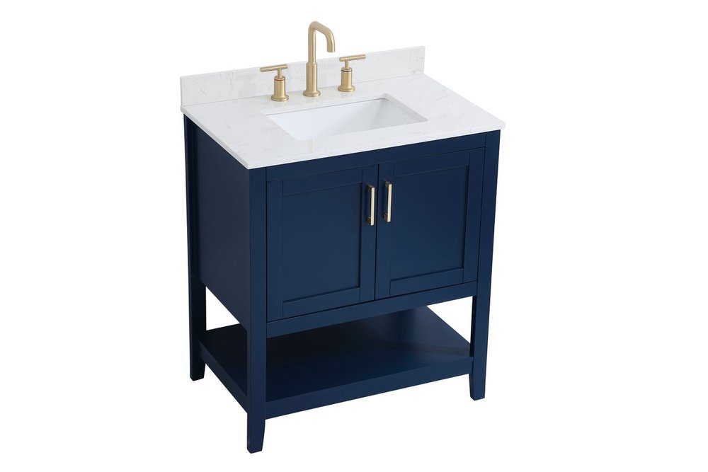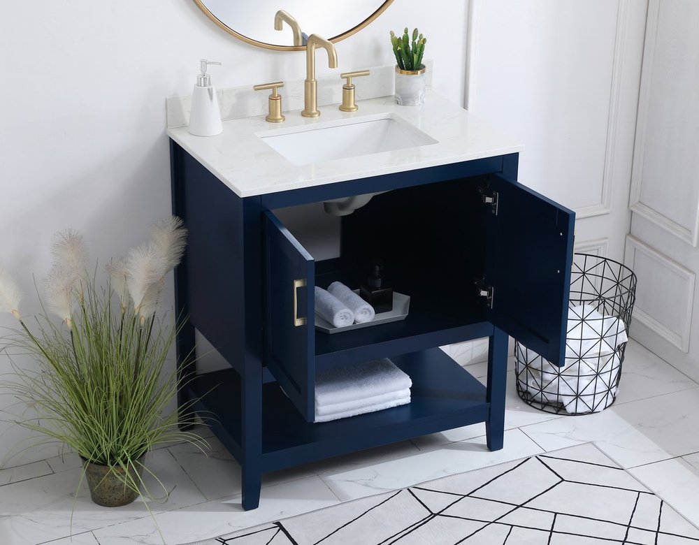 The nonchalant attitude of this 30" traditional Blue finish vanity will have you wanting more. The slender gold handle bars open the two cabinet doors to reveal ample storage space to put away and store bathroom essentials, and the open space below allows for you to place clean towels on the rack. Topped with a Calacatta engineered marble countertop, you and your guests will enjoy this easy going vanity. Comes with a matching backsplash to complete the look and protects your wall.
