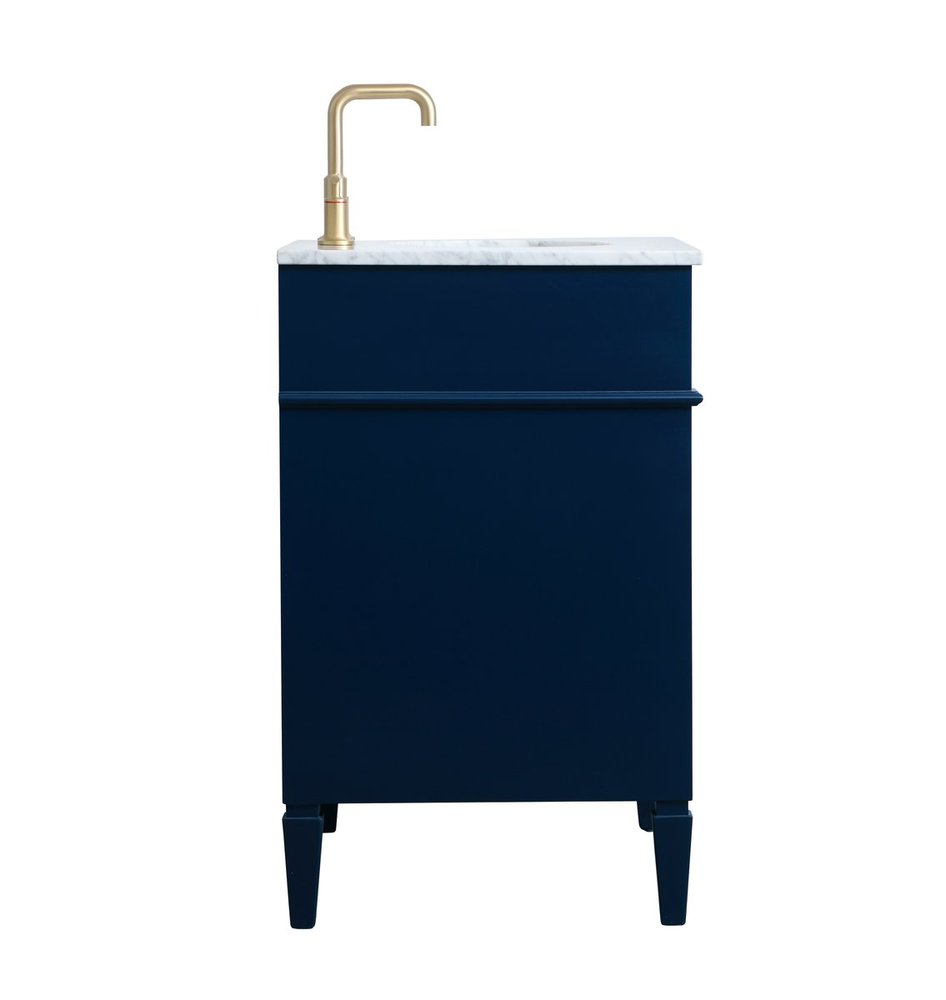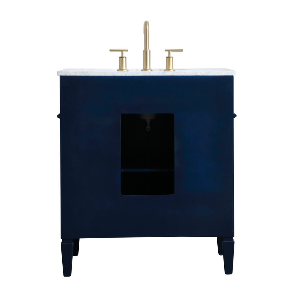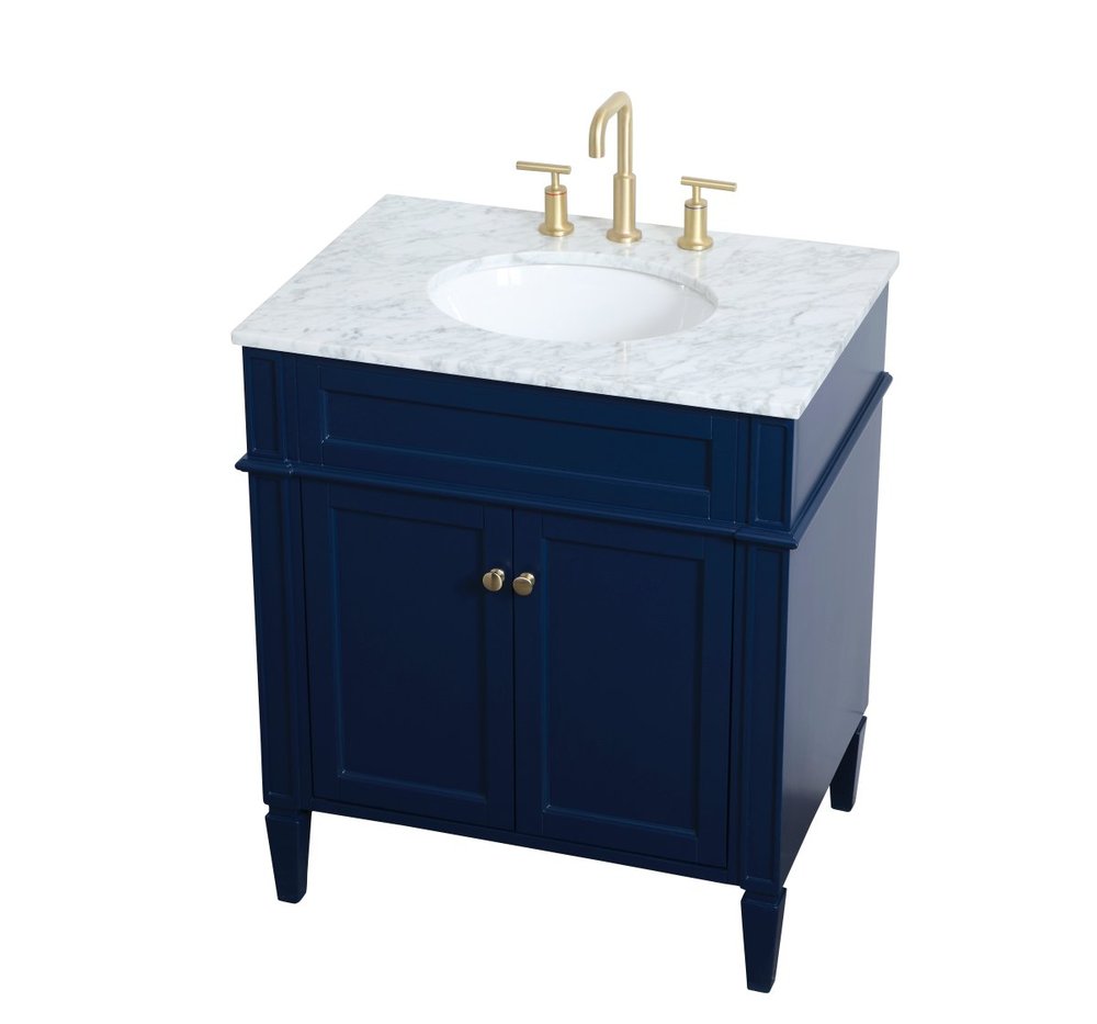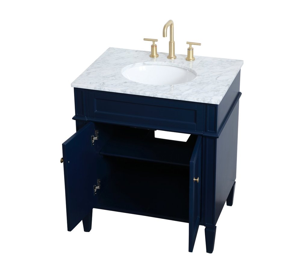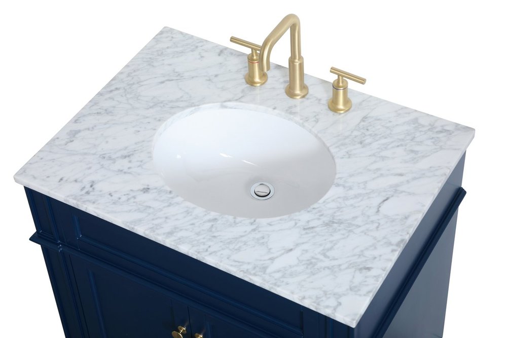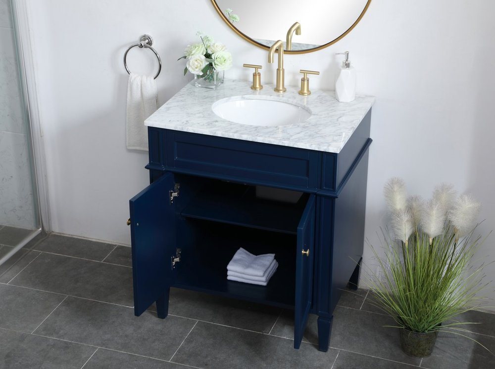 Modern sophistication is defined within the urbane blue finish and brushed gold knobs of this compact vanity. Its length makes it the perfect addition to any sized home, and saves space with its storage area hidden behind the double cabinet doors. Topped with a Carrara white marble counter top and a porcelain sink, this design will add everlasting class to your bathroom and powder room.