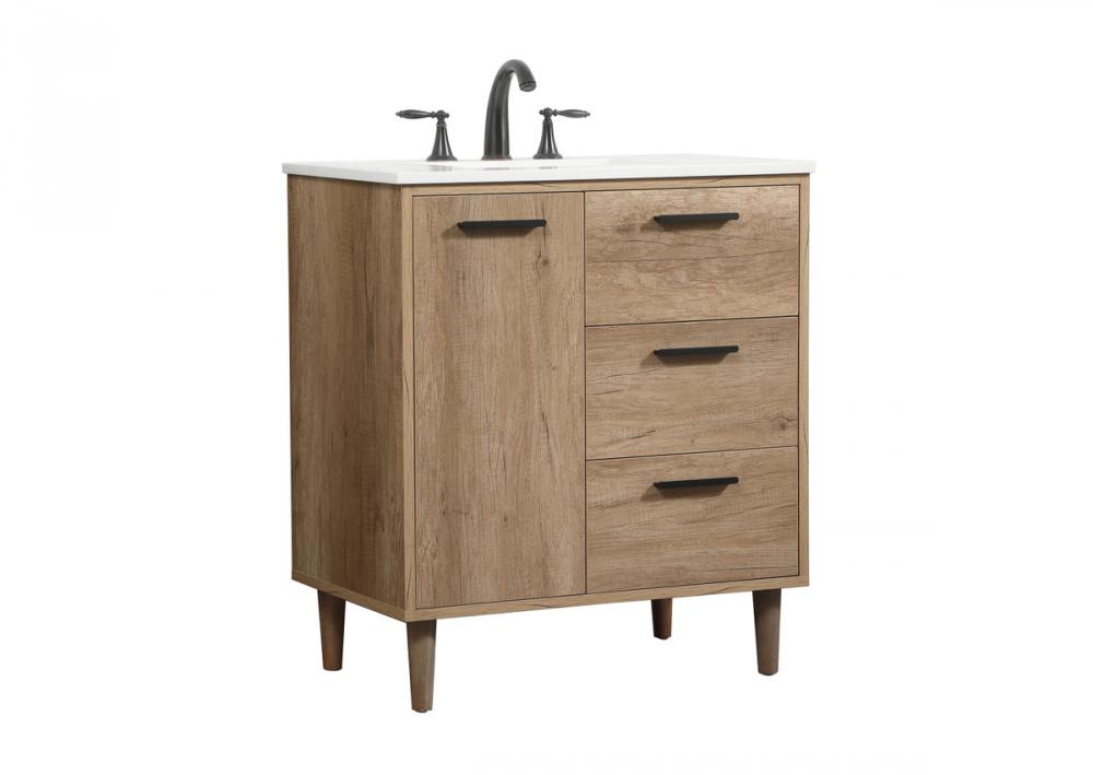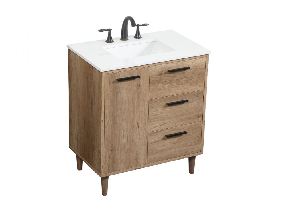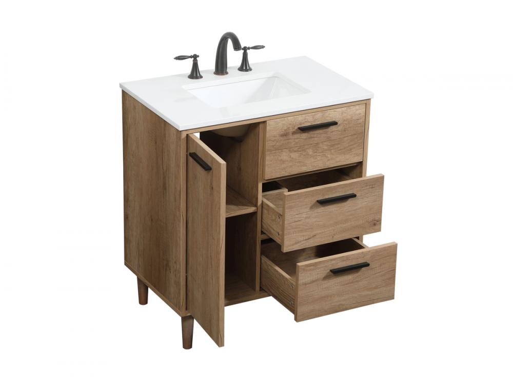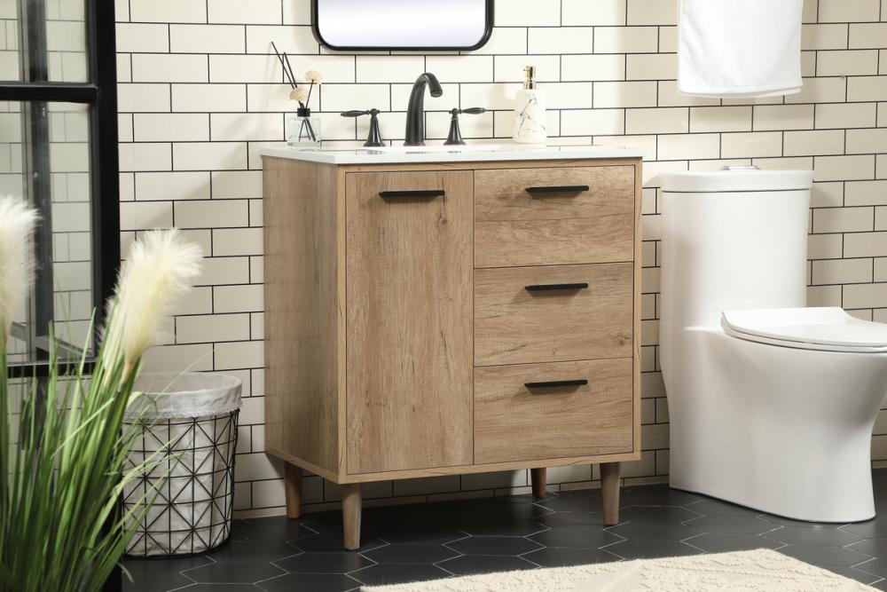 Exquisite modern sophistication is defined with the wood look and black barpulls of this vanity and slender tapered legs. Its length makes it the perfect addition to any sized home, and saves space with its storage area hidden behind the Single cabinet doors and two functional drawers. Topped with a highly durable engineered marble countertop and a porcelain undermount sink, this modern design will become your focal point of your bathroom or powder room. Equipped with soft-closing drawer and doors adds a quiet functional touch.
