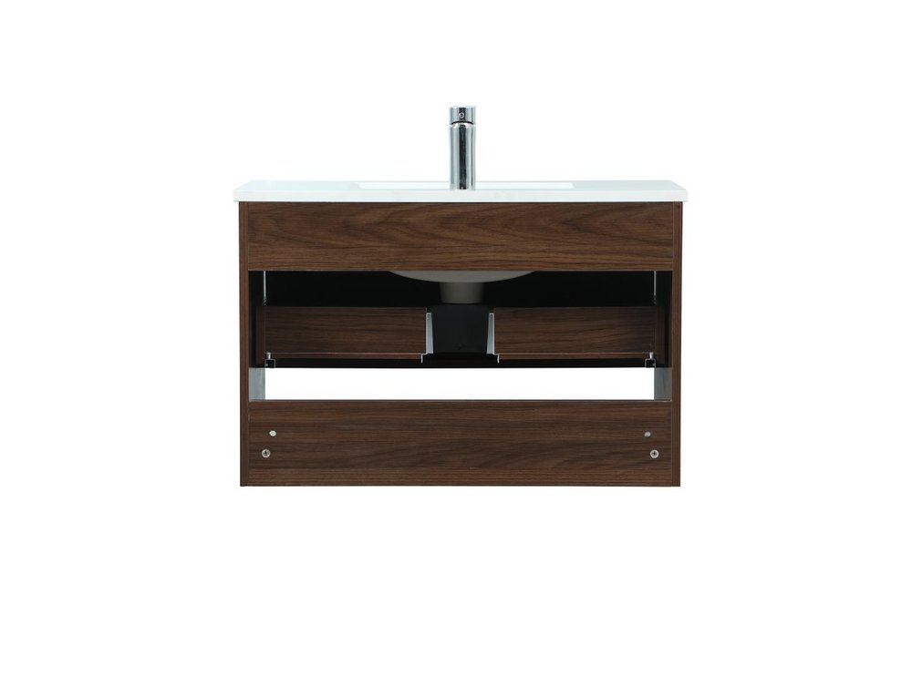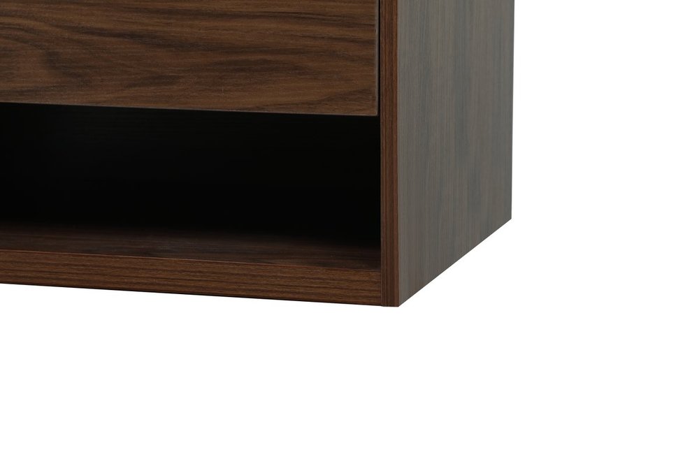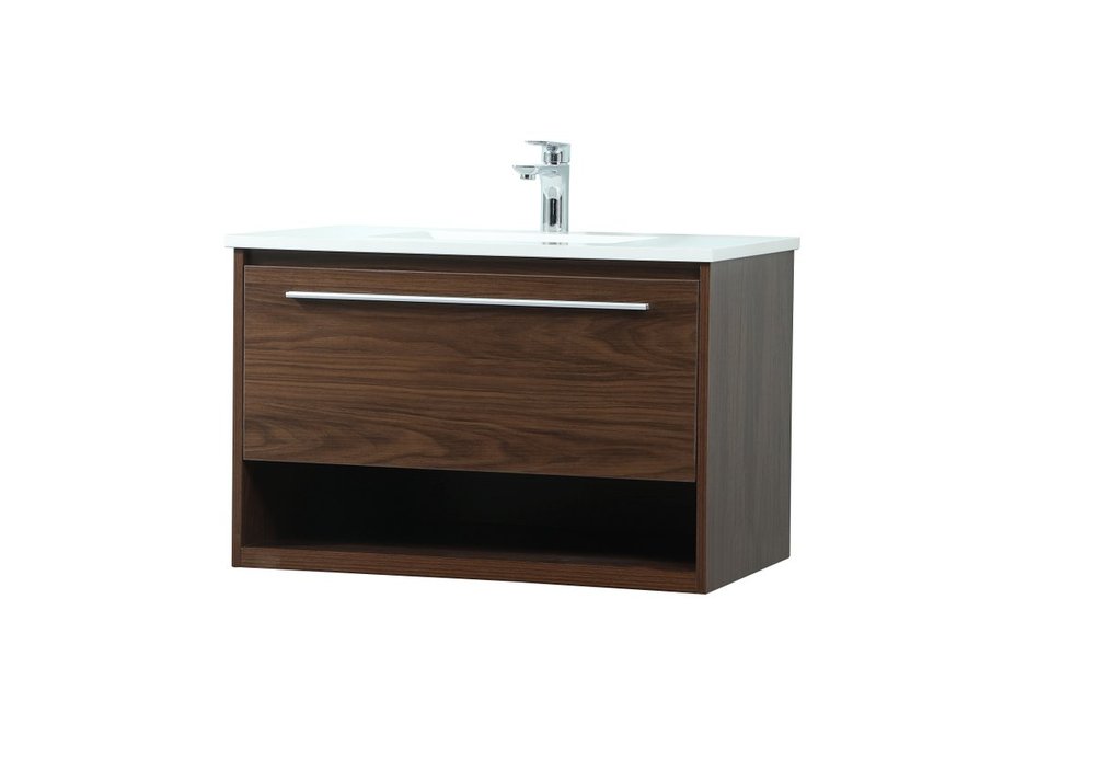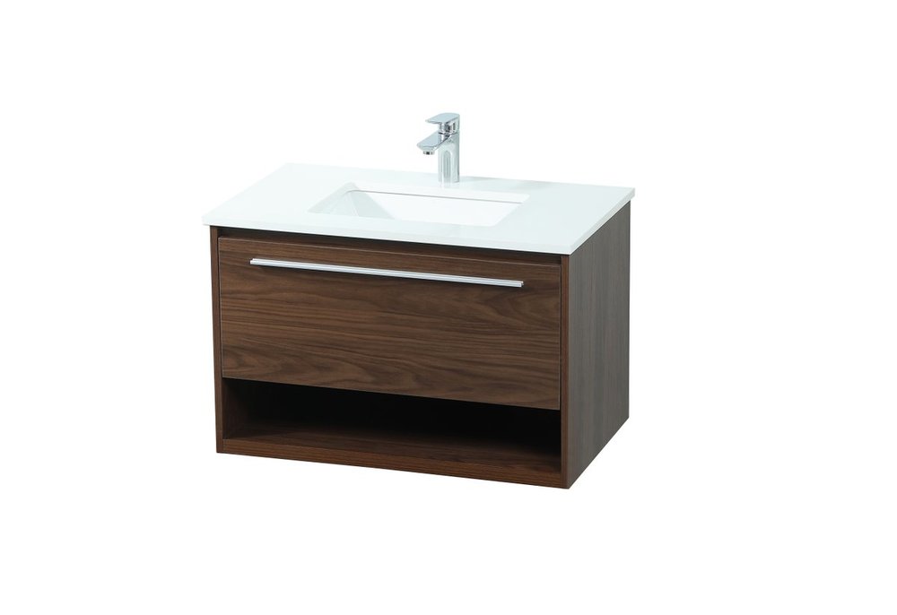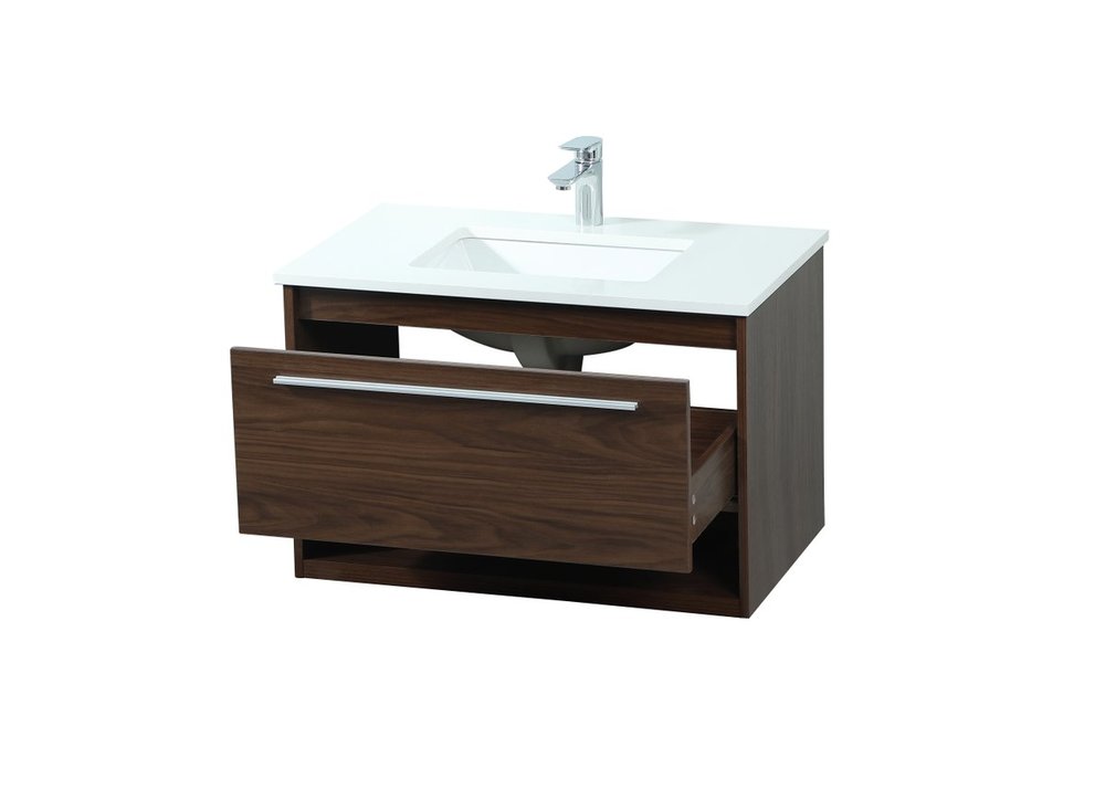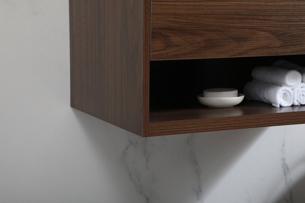 Save space and make your bathroom appear bigger with this floating vanity. Its minimal design will have you in awe, while its clean lines will leave your room feeling fresh and uncluttered. The Single u-drawer pulls out for storage while the open space below allows you to place extra towels or various other essentials. The ivory white engineered marble counter top with porcelain sink adds refined luxe while the aluminum barpull style handle adorn the vanity face.