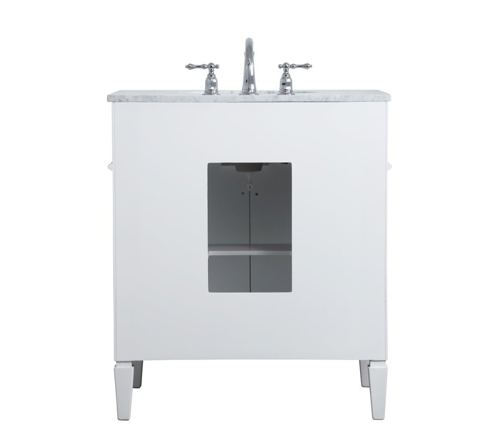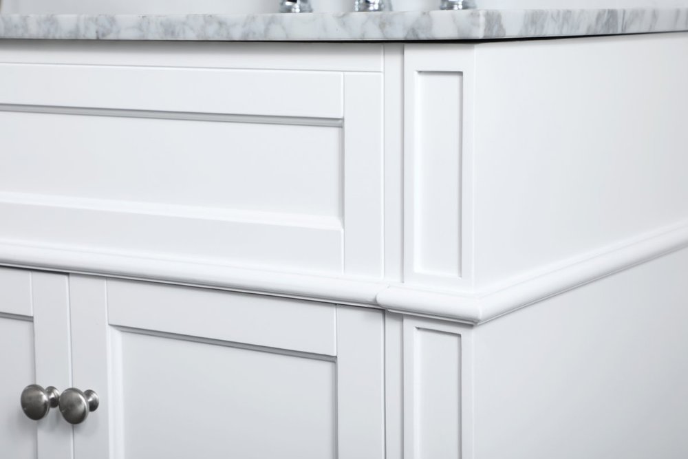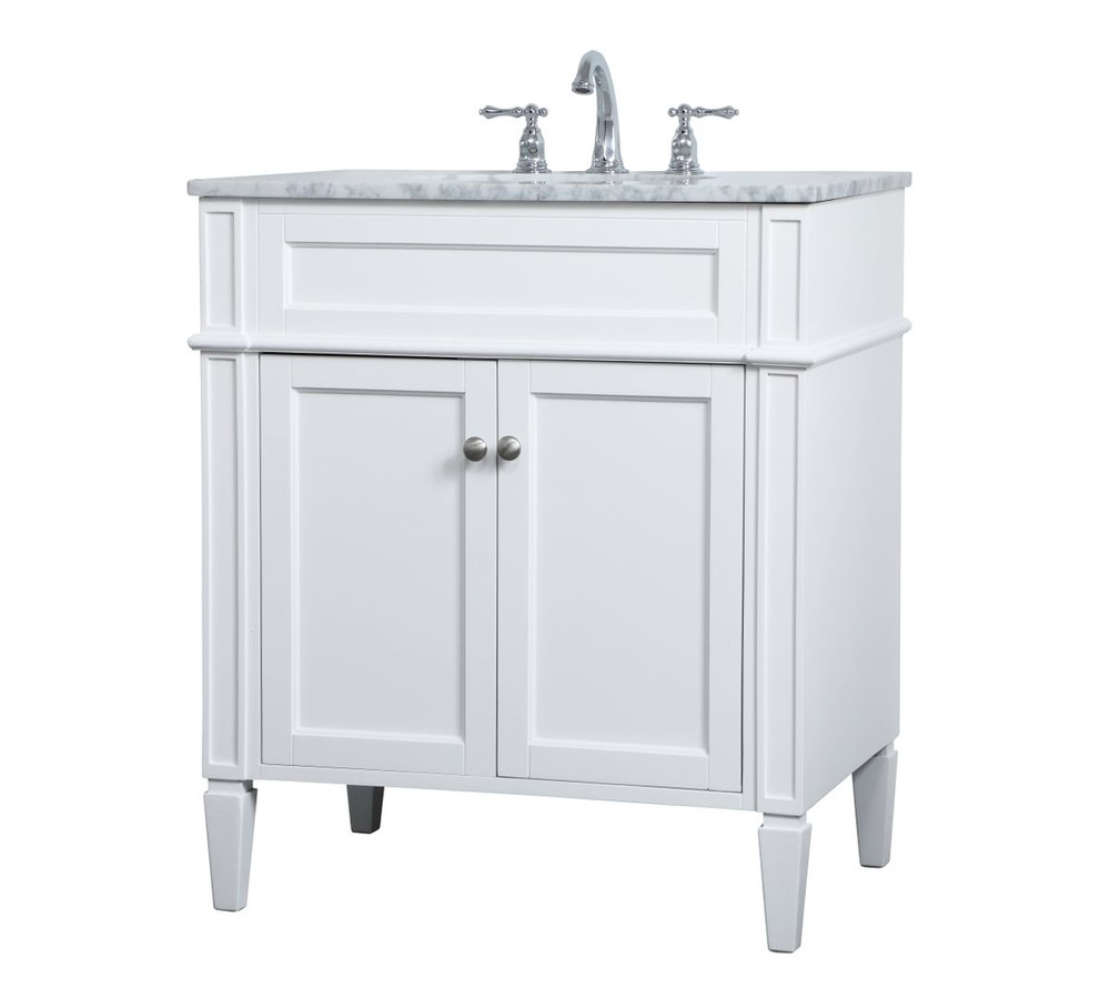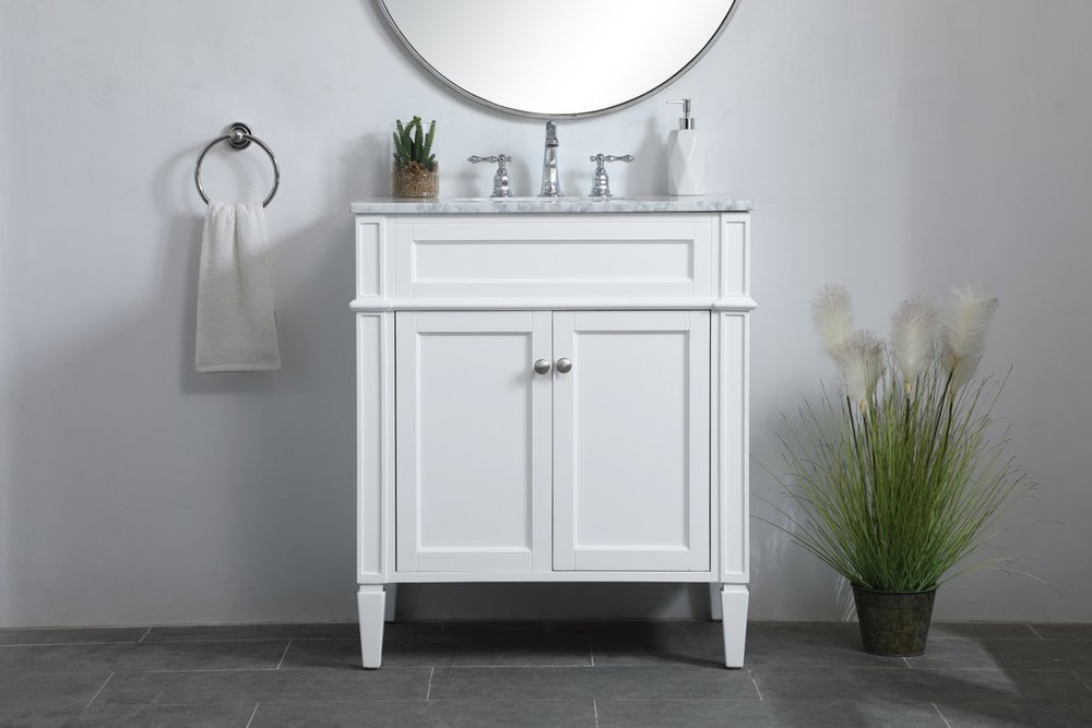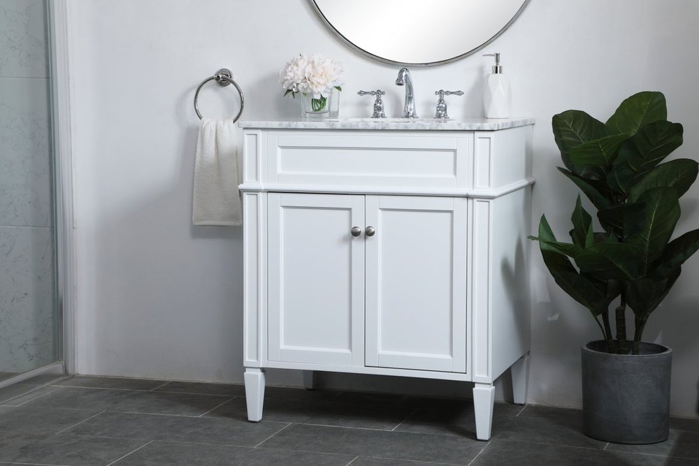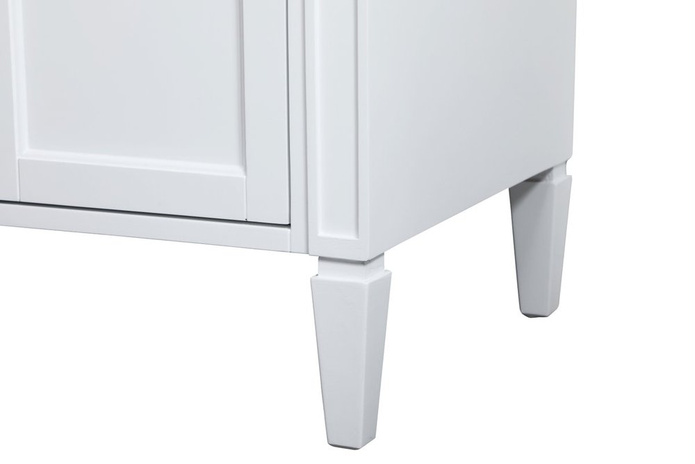 Modern sophistication is defined within the urbane white finish and brushed steel knobs of this compact vanity. Its length makes it the perfect addition to any sized home, and saves space with its storage area hidden behind the double cabinet doors. Topped with a Carrara white marble counter top and a porcelain sink, this design will add everlasting class to your bathroom and powder room.