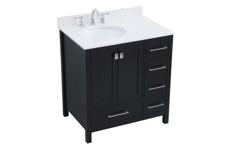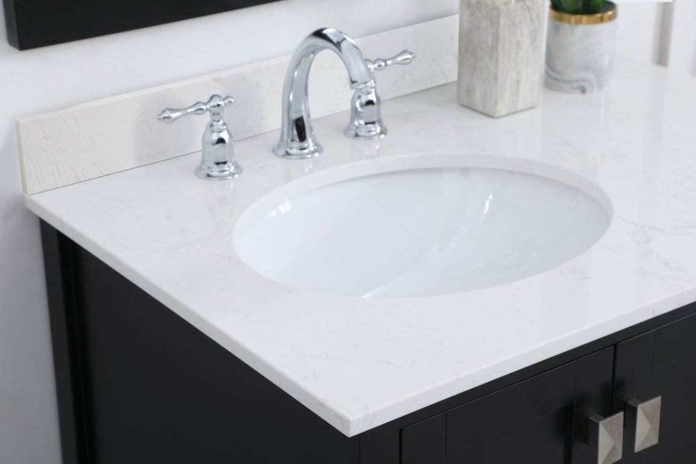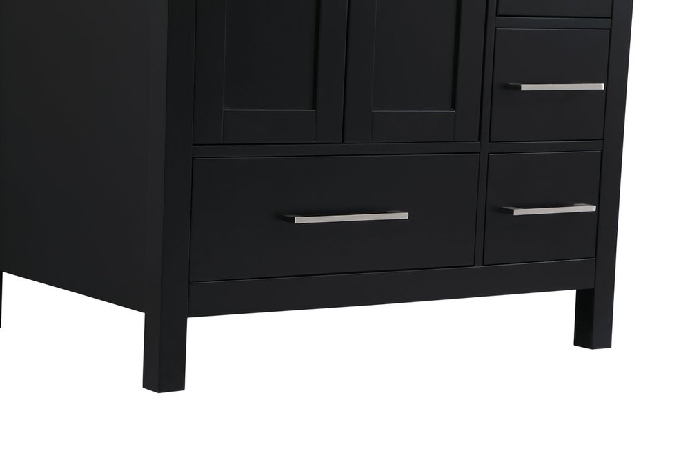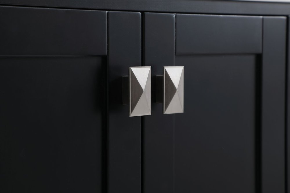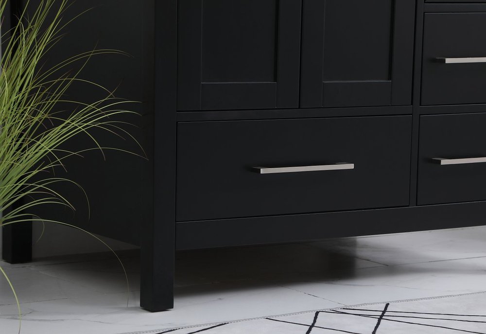 Never compromise beauty--the Irene collection stunning vanity in a black finish will add lovely sophistication and complement any bathroom or powder room, while utilizing its charm and function to provide you with ample storage spaces. Brushed nickel pulls gently adorn the minimalist cabinet doors and drawers at the base, allowing for you to store away your bathroom essentials. The calacatta engineered marble countertop, porcelain undermount sink, dignified subtle engravings on the side edges, and squared legs all come together to create contemporary beauty. Work with your space, and design a beautiful room, no matter the size. Comes with a matching backsplash to complete the look and protects your wall.