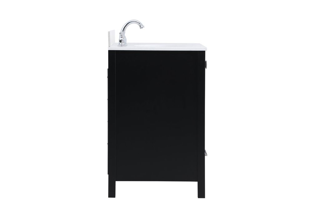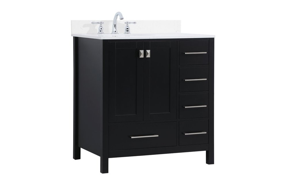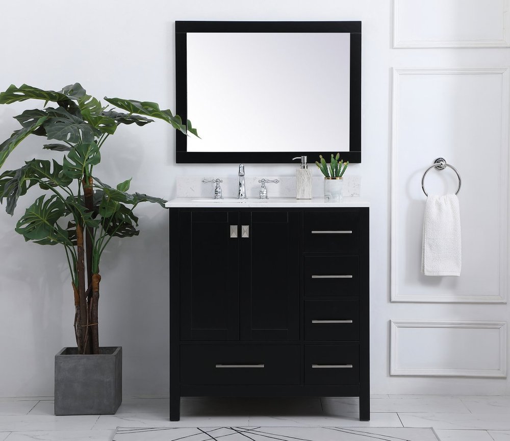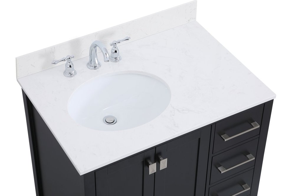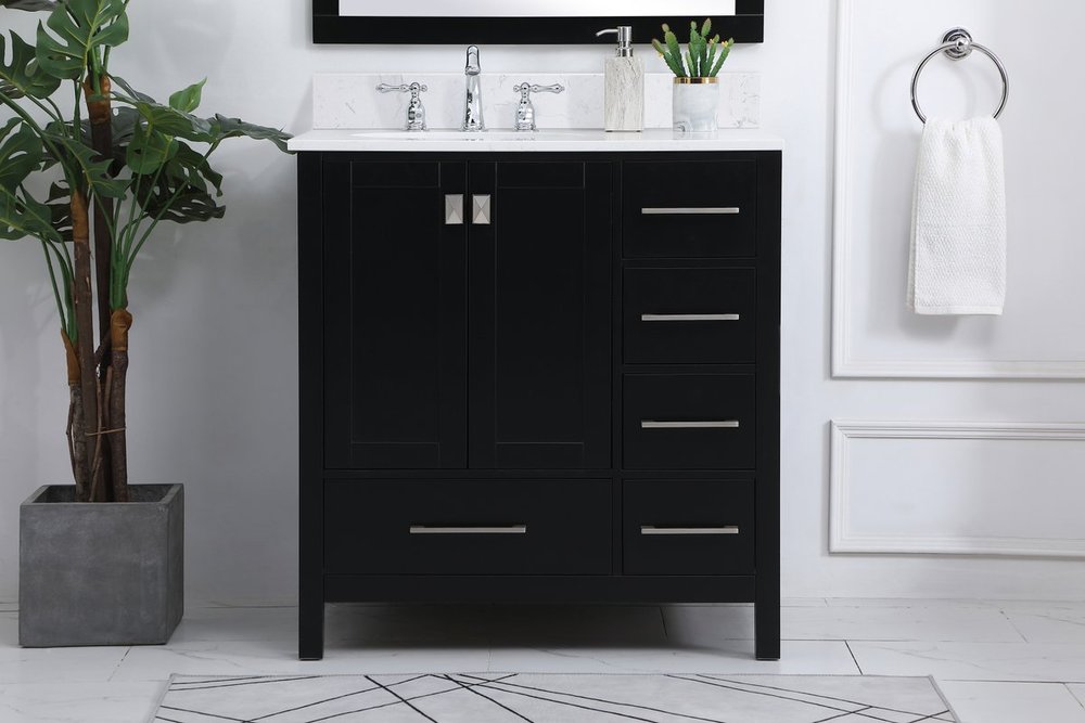 Never compromise beauty--the Irene collection stunning vanity in a black finish will add lovely sophistication and complement any bathroom or powder room, while utilizing its charm and function to provide you with ample storage spaces. Brushed nickel pulls gently adorn the minimalist cabinet doors and drawers at the base, allowing for you to store away your bathroom essentials. The calacatta engineered marble countertop, porcelain undermount sink, dignified subtle engravings on the side edges, and squared legs all come together to create contemporary beauty. Work with your space, and design a beautiful room, no matter the size. Comes with a matching backsplash to complete the look and protects your wall.