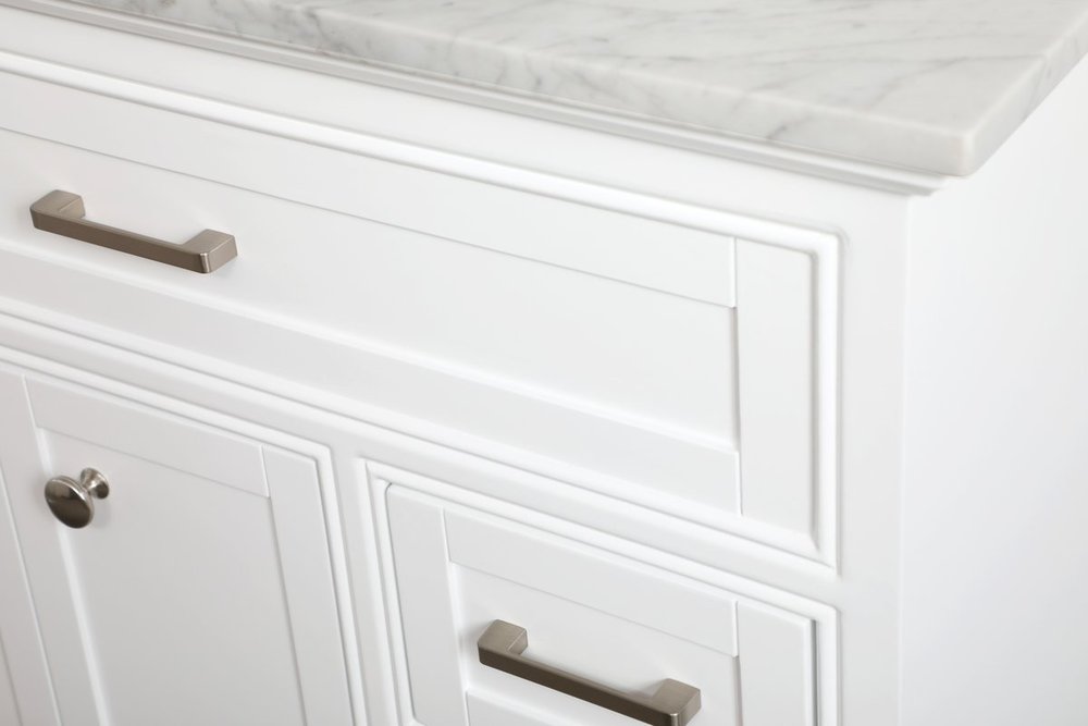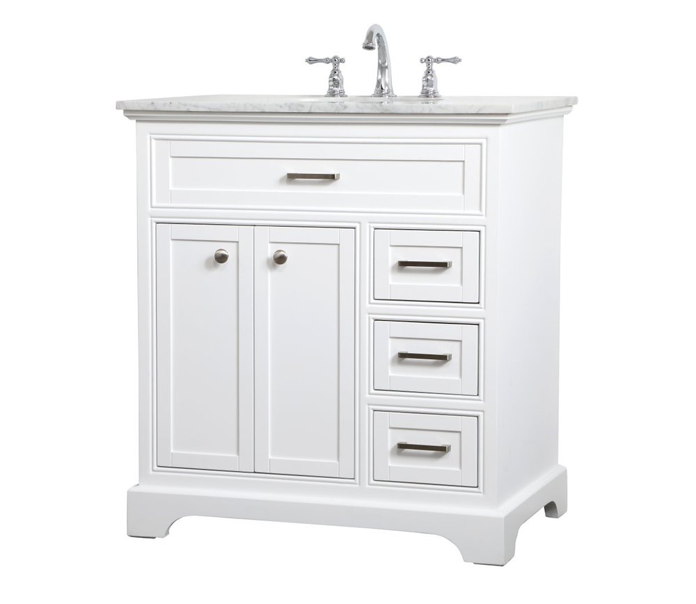 Clean lines and classic form can truly add a fresh look to your bathroom or powder room. This white finish vanity, complemented by brush steel finish hardware, will surely charm you with its confident style and subtle charisma. Double cabinet doors and 3 side drawers can store all of your bathroom toiletries, from extra towels to make up essentials. As if icing on the cake, this vanity is crowned with Carrara white marble and includes a porcelain undermount sink--adding both function and form that will truly amaze.