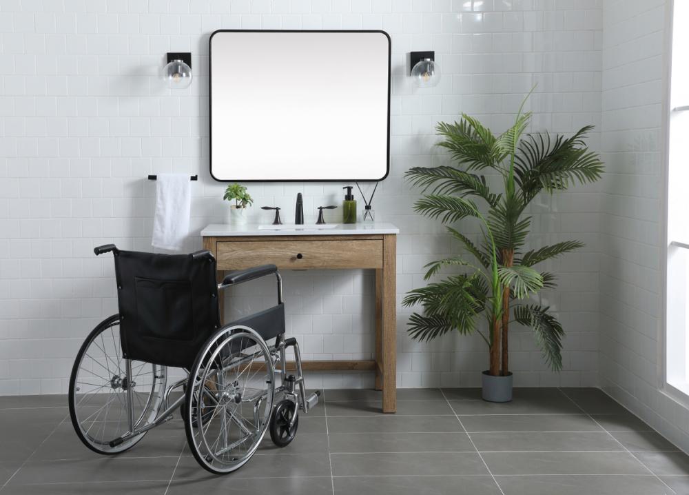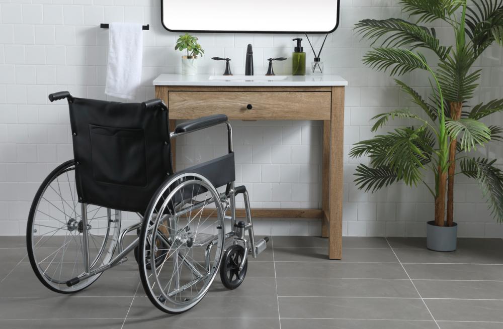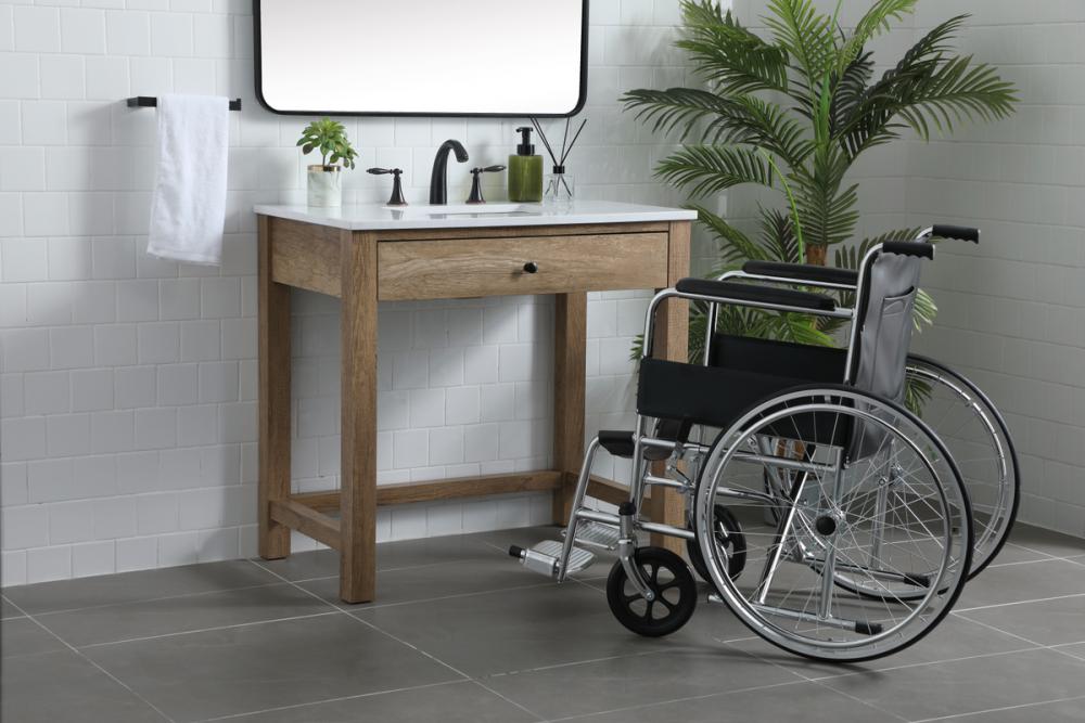 The sink vanity is thoughtfully crafted to accommodate wheelchair access, promoting inclusivity in your bathroom space.