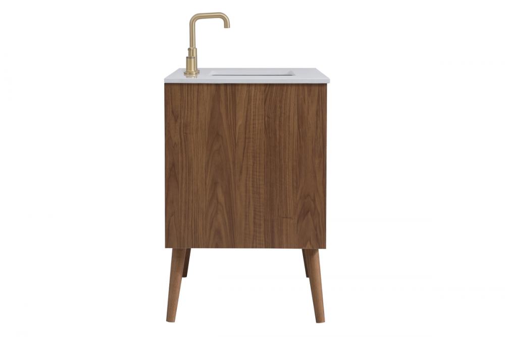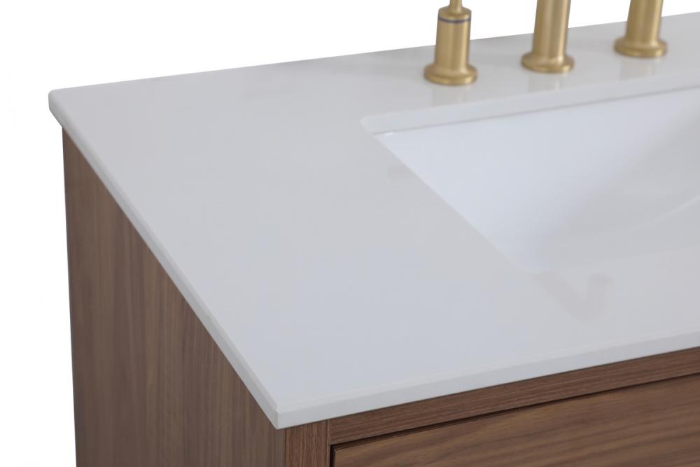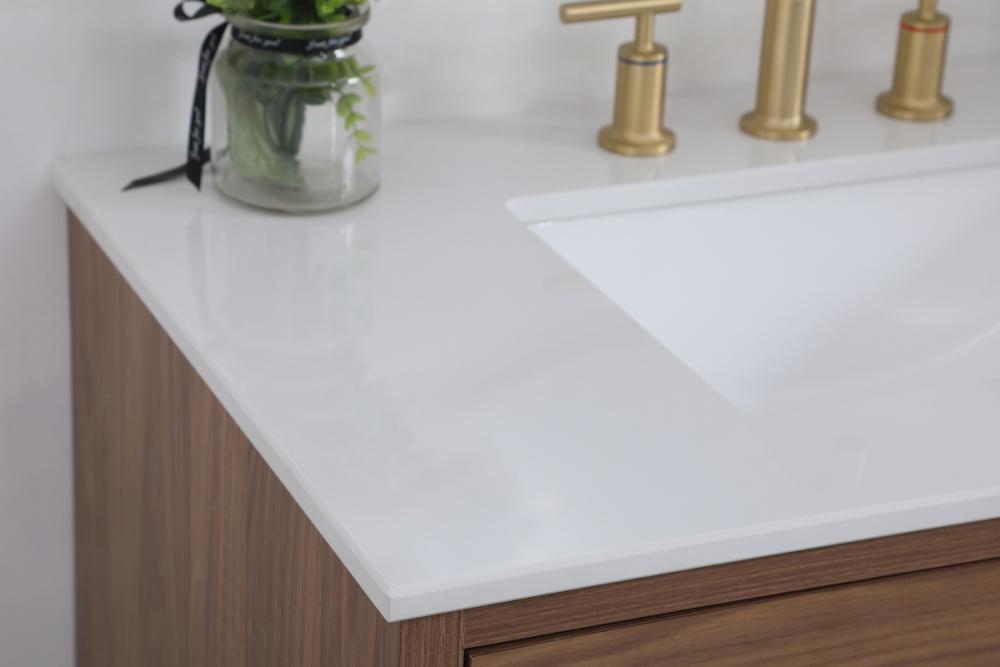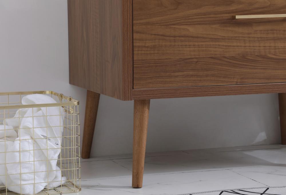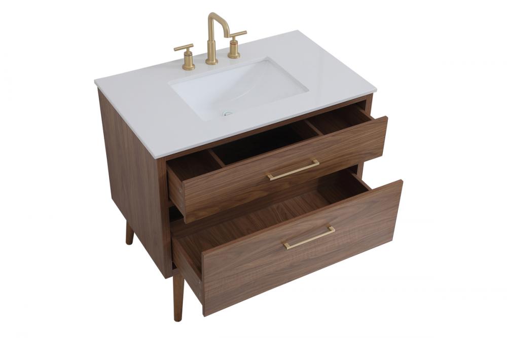Delve into a world of minimalistic fashion and contemporary styling with this midcentury modern 36" vanity. The clean lines anchors the design, while the oblique tapered cylinder legs add subtle interest. However, the artful juxtaposition creates a blend of bright modernity and classical traditions. A gold handle adorns the top fake drawer hiding the base of the undermount porcelain sink while another one allows you to pull the bottom drawer out, letting you store your bathroom necessities and toiletries. The compact size makes it the perfect vanity for any bathroom or powder room, regardless of size.