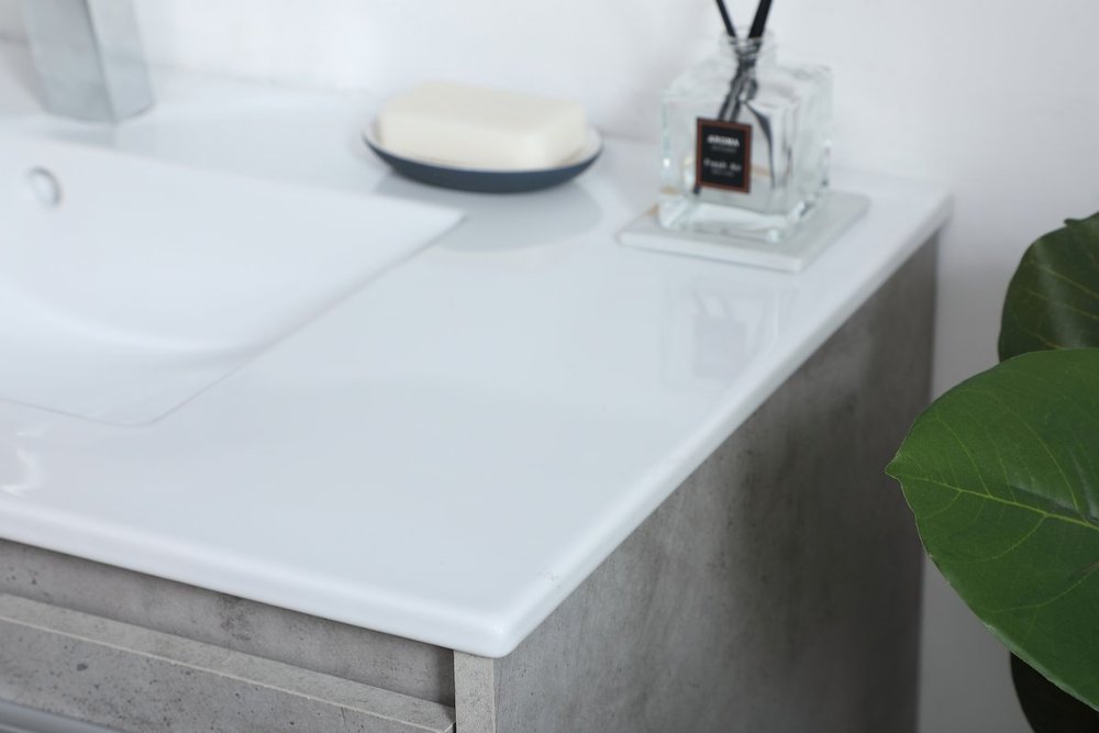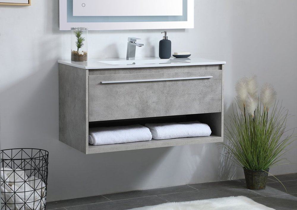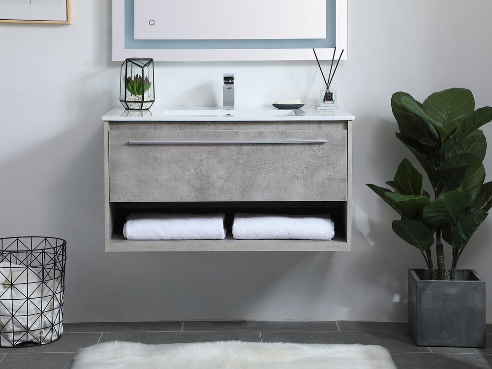 Save space and make your bathroom appear bigger with this 36" floating vanity in a concrete grey finish. Its minimal design will have you in awe, while its clean lines will leave your room feeling fresh and uncluttered. The Single u-drawer pulls out for storage while the open space below allows you to place extra towels or various other essentials.