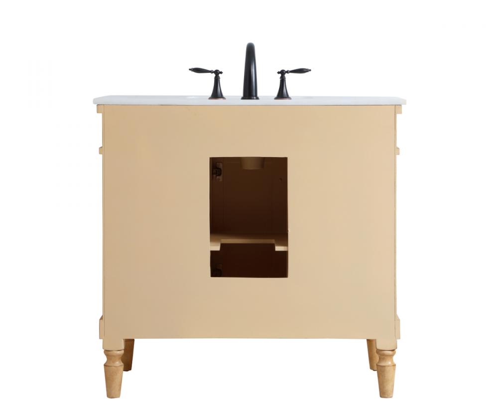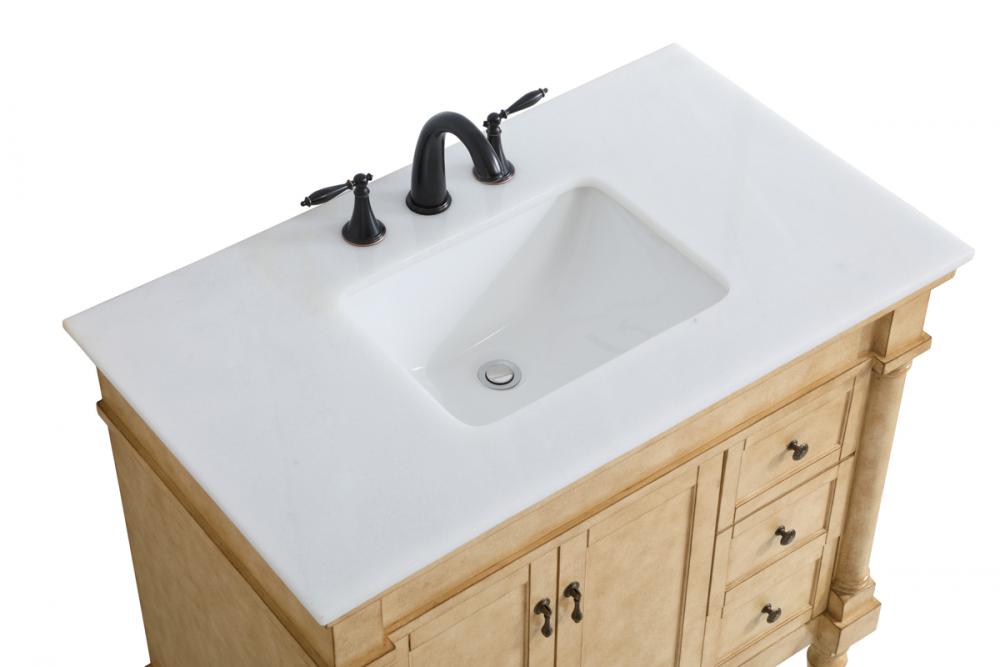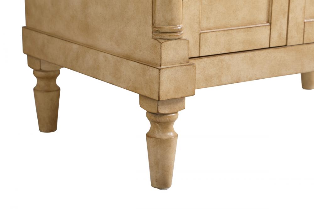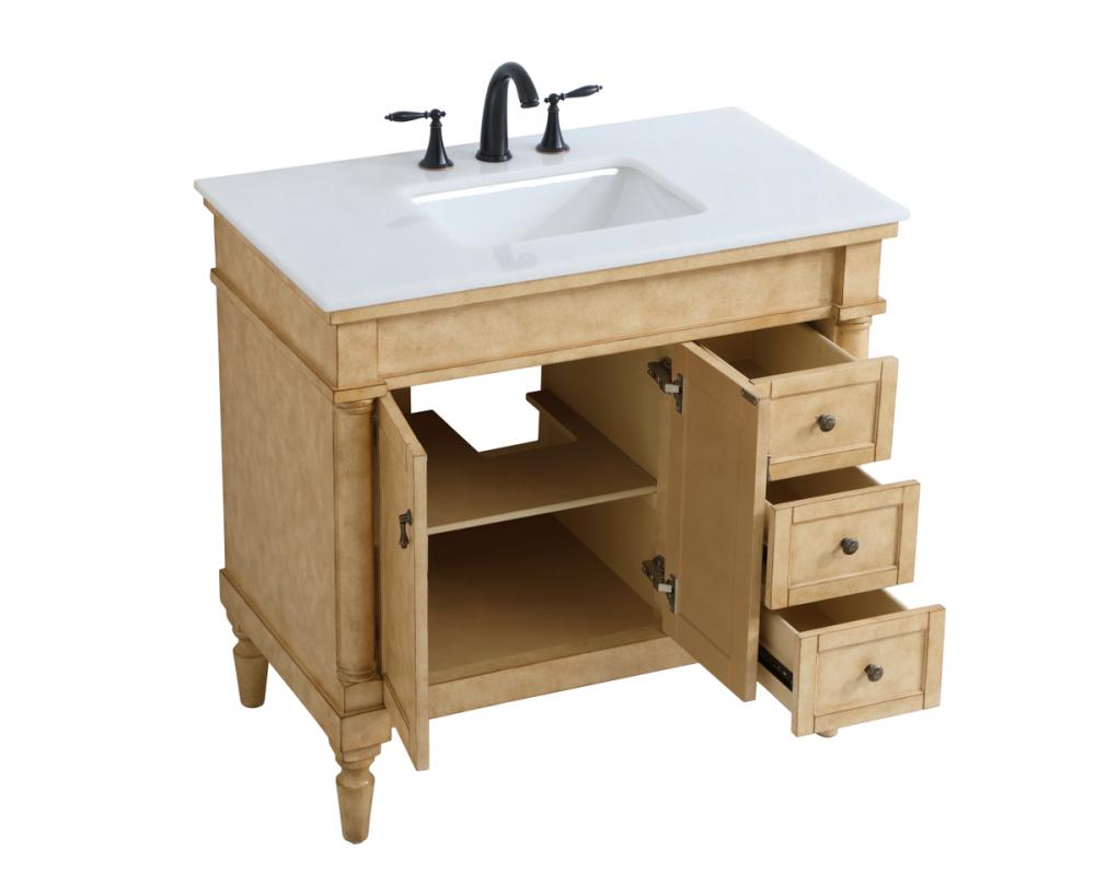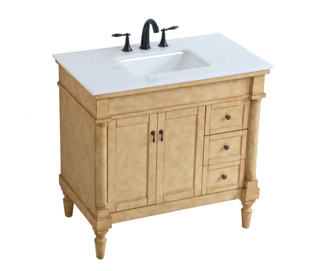 The subtle beauty of the Lexington collection 36" vanity in an antique beige finish exudes comfortable luxury. Its modern, yet traditional beauty will surely dress up your bathroom or powder room without any fuss. The white marble countertop with occasional coffee color veins and porcelain undermount sink shows quiet opulence, and the legs support upright without fail. Antique bronze hardware complements the refined beige finish, with pulls adorning the two cabinet doors and ornate knobs dressing the three side drawers, showcasing ample storage space within. Whether this vanity is in your bathroom or for guests, its presence will surely elevate the aesthetics of your room.