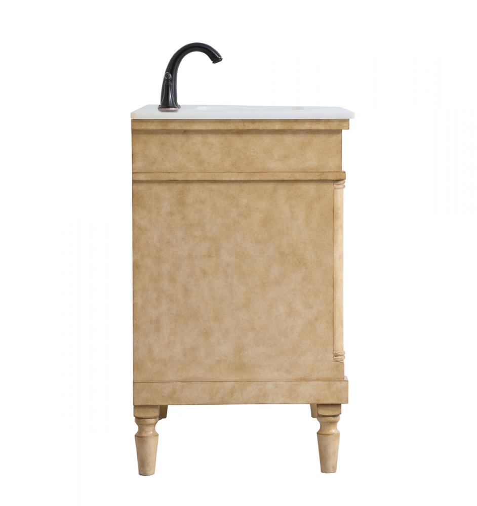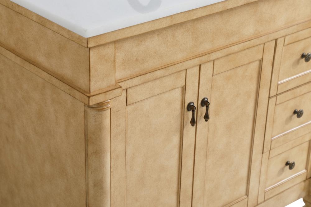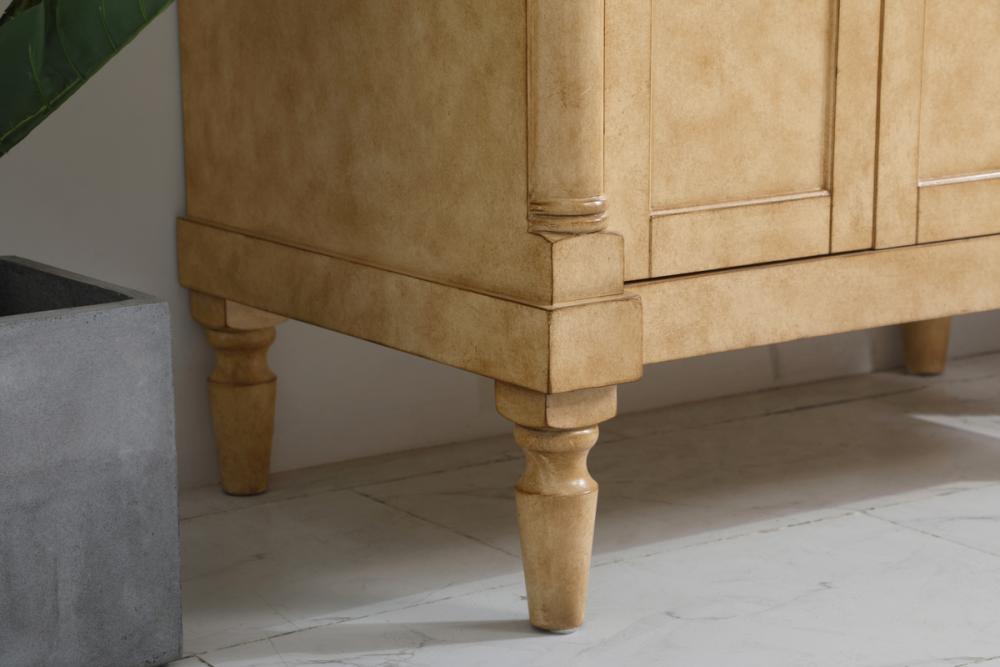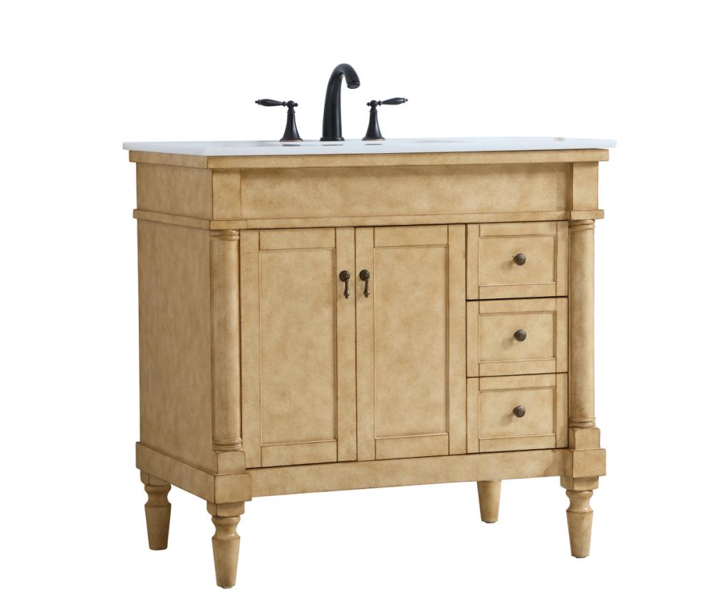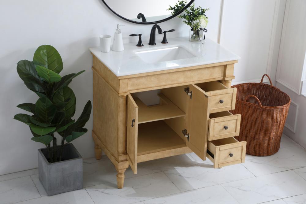 The subtle beauty of the Lexington collection 36" vanity in an antique beige finish exudes comfortable luxury. Its modern, yet traditional beauty will surely dress up your bathroom or powder room without any fuss. The white marble countertop with occasional coffee color veins and porcelain undermount sink shows quiet opulence, and the legs support upright without fail. Antique bronze hardware complements the refined beige finish, with pulls adorning the two cabinet doors and ornate knobs dressing the three side drawers, showcasing ample storage space within. Whether this vanity is in your bathroom or for guests, its presence will surely elevate the aesthetics of your room.
