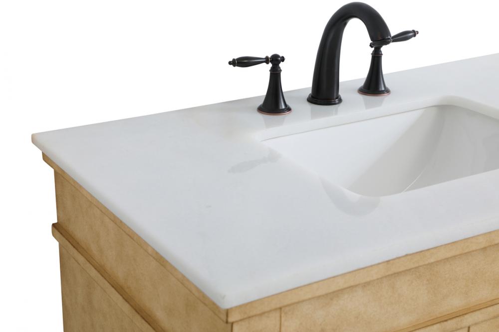 Distressed antique beige finish with a luxurious white with occasional coffee color vein marble countertop