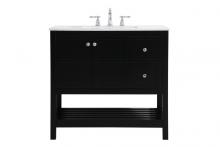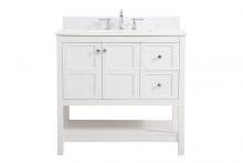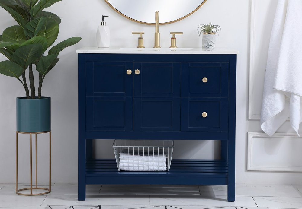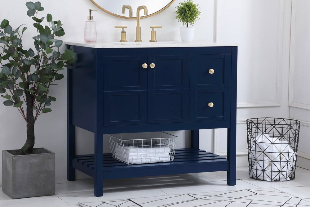 The subtle beauty of the Theo collection 36" vanity in a blue finish exudes comfortable luxury. Its modern, yet traditional beauty will surely dress up your bathroom or powder room without any fuss. The white stone countertop and porcelain undermount sink shows quiet opulence, and the legs support upright without fail. Gold hardware complements the trendy blue finish, with pulls adorning the two cabinet doors and two drawers, showcasing ample storage space within. Slated shelf allows for additional space to organize your towels. Whether this vanity is in your bathroom or for guests, its presence will surely elevate the aesthetics of your room.