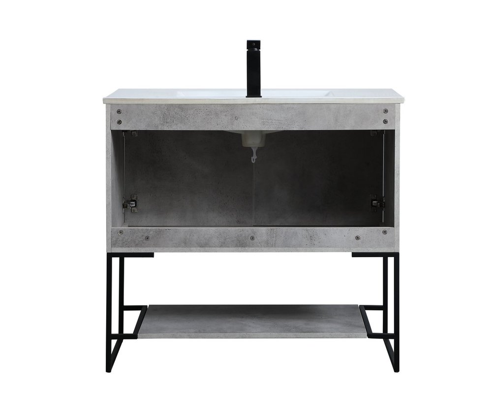 Live in modern comfort with this 36" concrete grey finish vanity. Dressed in a concrete grey and sleek black metal hardware, its contemporary style will have your bathroom or powder room elevated in industrial sophistication. The open shelf at the base and two doors reveal ample storage space for your bathroom essentials and miscellany. Clean lines create its own visual interest, adding trendy looks to your already chic room.