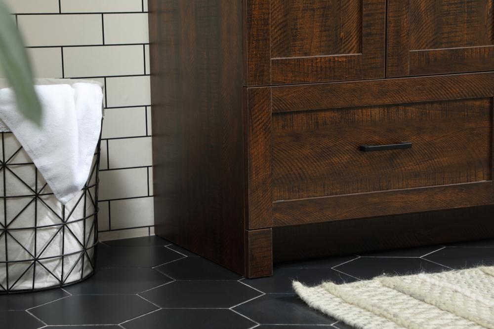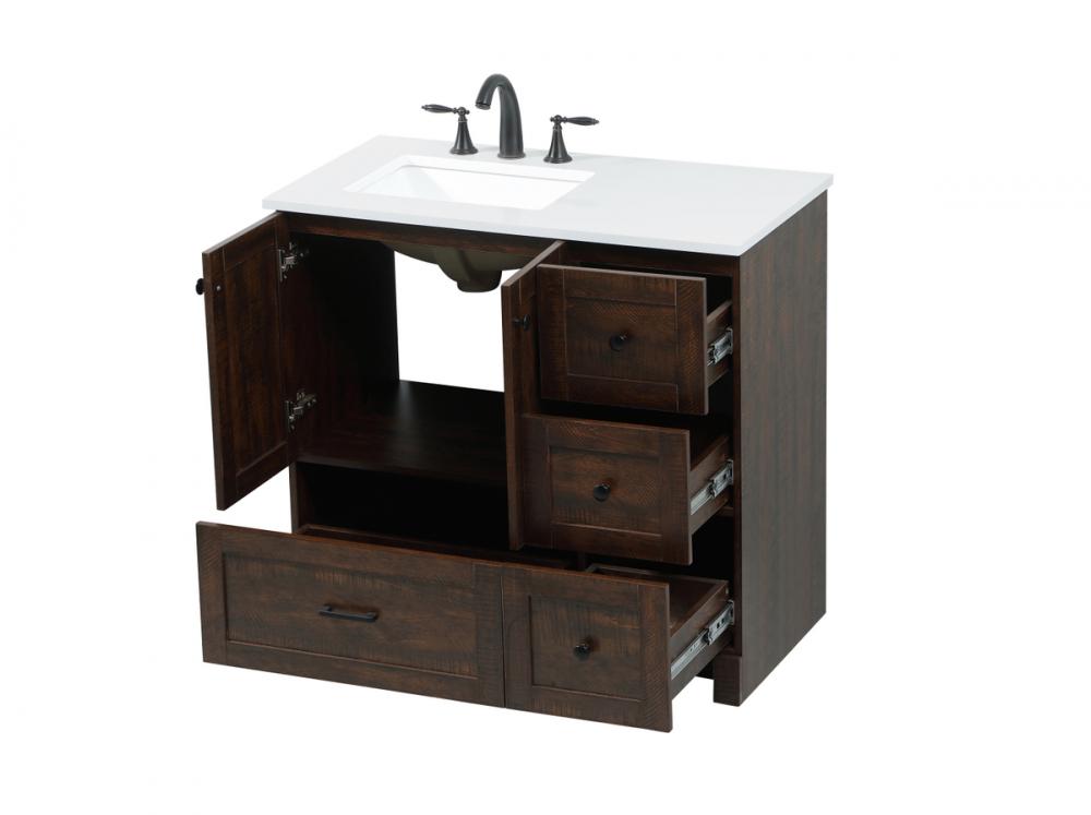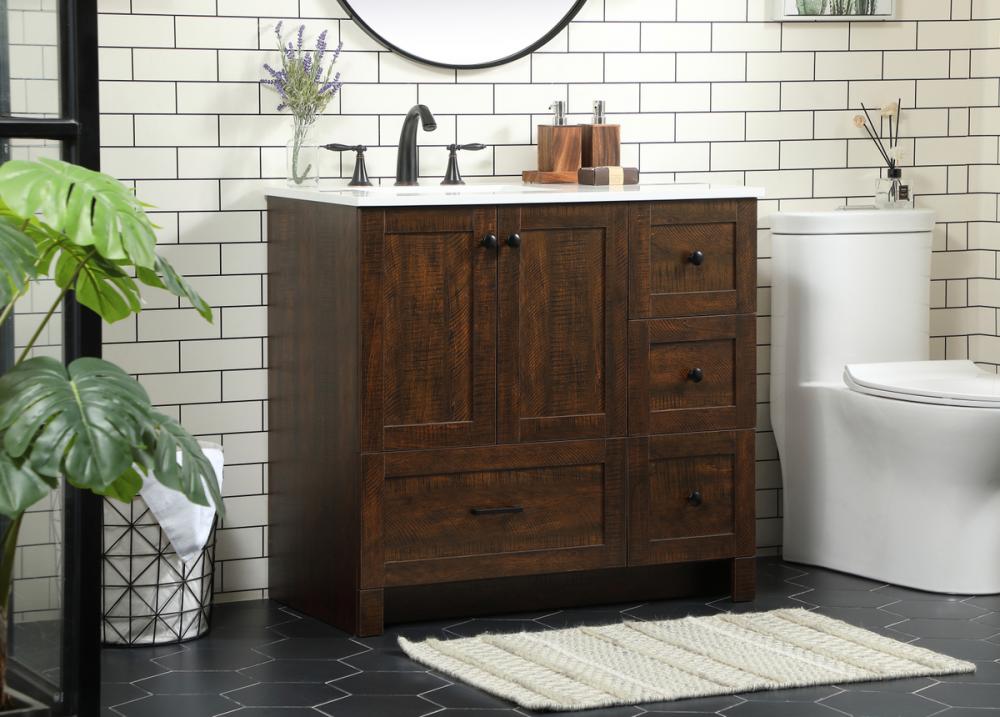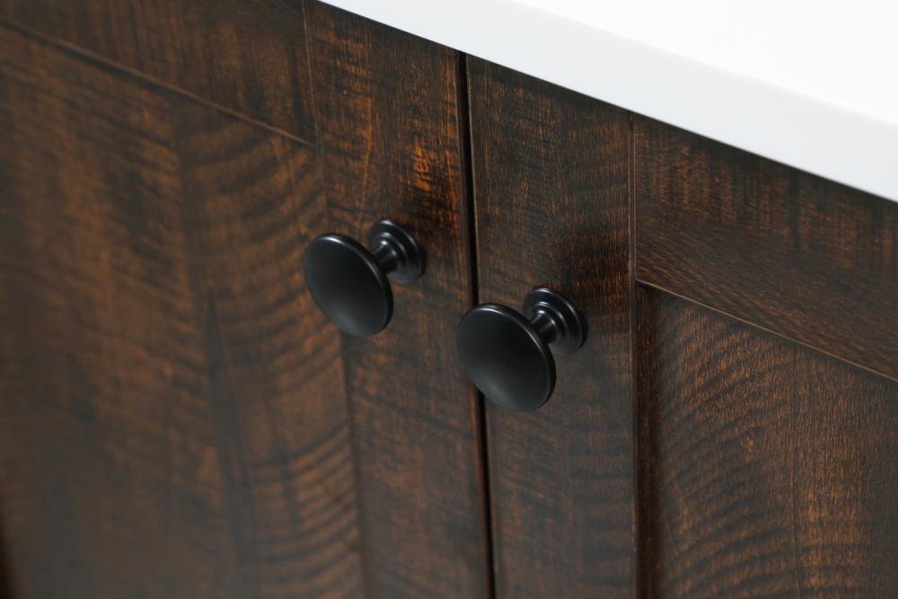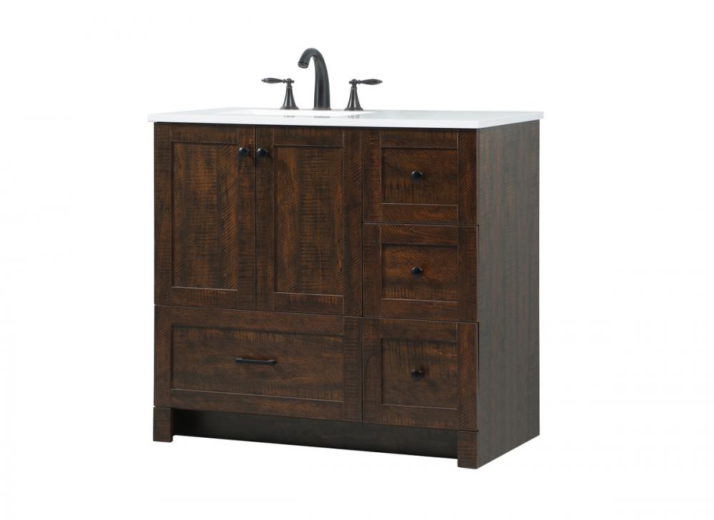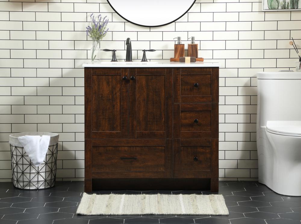 Delve into a world of minimalistic fashion and contemporary styling with this farmhouse 36" vanity. The clean faux lines anchors the weathered design. Black handle adorns the two doors hiding the base of the integrated porcelain sink while the bottom drawer and side drawers allow you to store your bathroom necessities and toiletries. It is the perfect vanity for any bathroom or powder room, regardless of size.