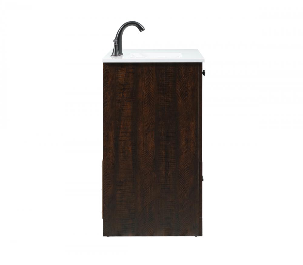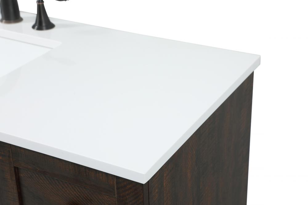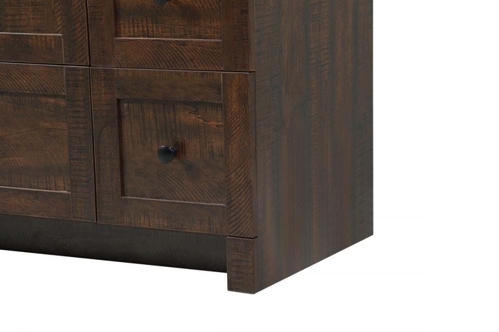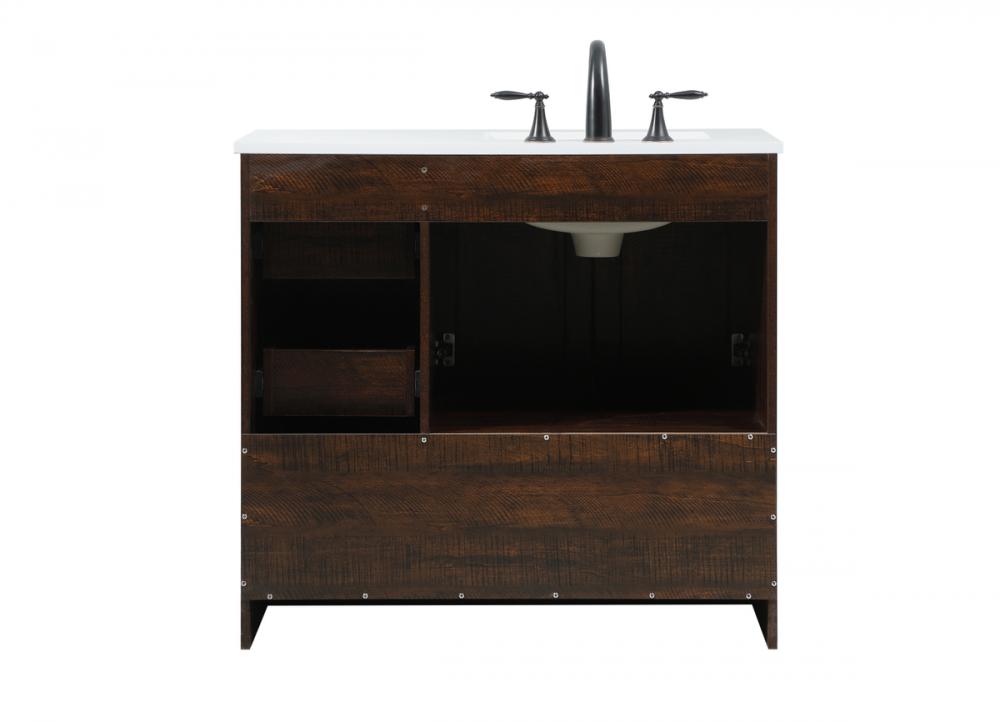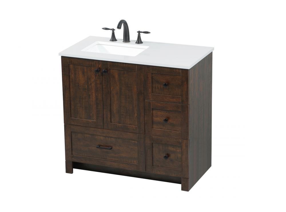 Delve into a world of minimalistic fashion and contemporary styling with this farmhouse 36" vanity. The clean faux lines anchors the weathered design. Black handle adorns the two doors hiding the base of the integrated porcelain sink while the bottom drawer and side drawers allow you to store your bathroom necessities and toiletries. It is the perfect vanity for any bathroom or powder room, regardless of size.