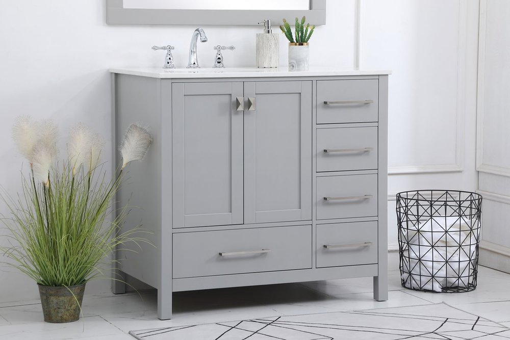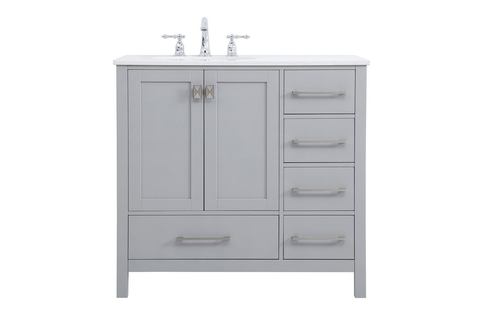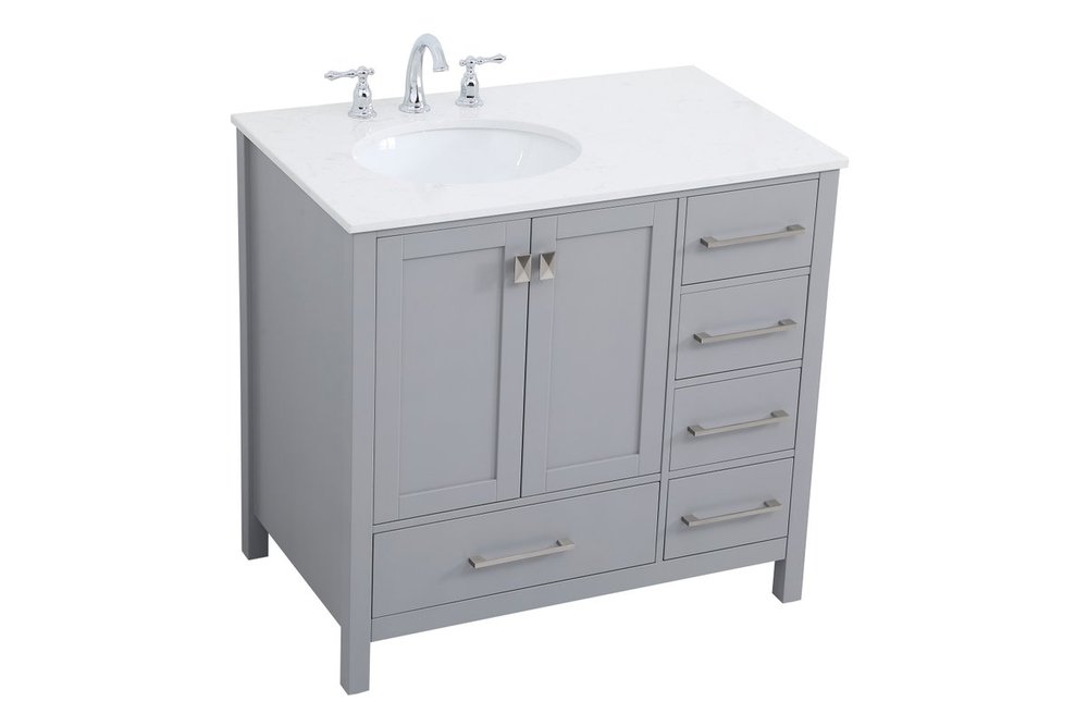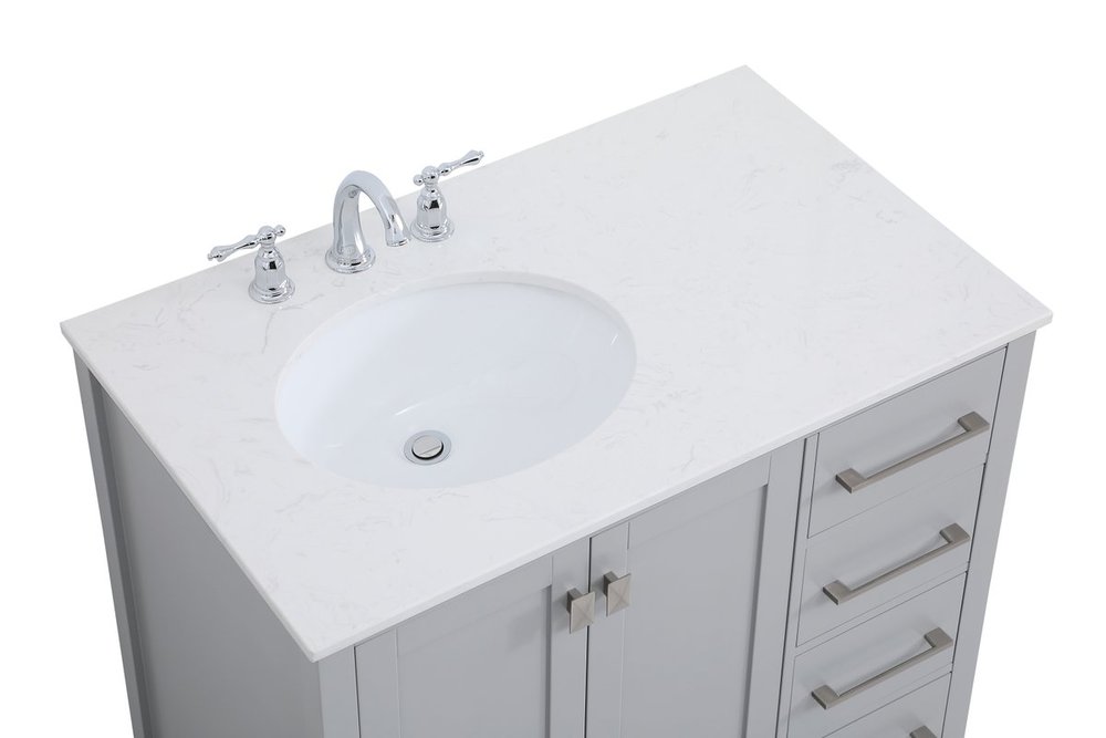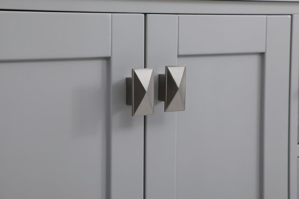 Never compromise beauty--the Irene collection stunning vanity in a gray finish will add lovely sophistication and complement any bathroom or powder room, while utilizing its charm and function to provide you with ample storage spaces. Brushed nickel pulls gently adorn the minimalist cabinet doors and drawers at the base, allowing for you to store away your bathroom essentials. The calacatta engineered marble countertop, porcelain undermount sink, dignified subtle engravings on the side edges, and squared legs all come together to create contemporary beauty. Work with your space, and design a beautiful room, no matter the size.