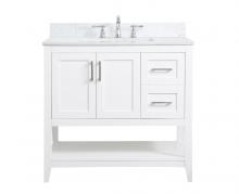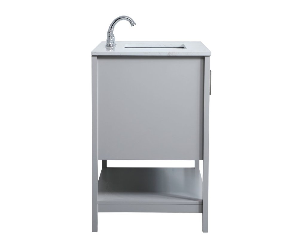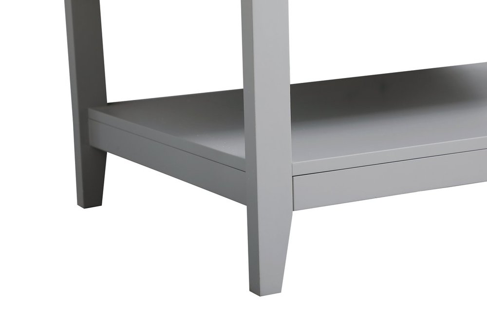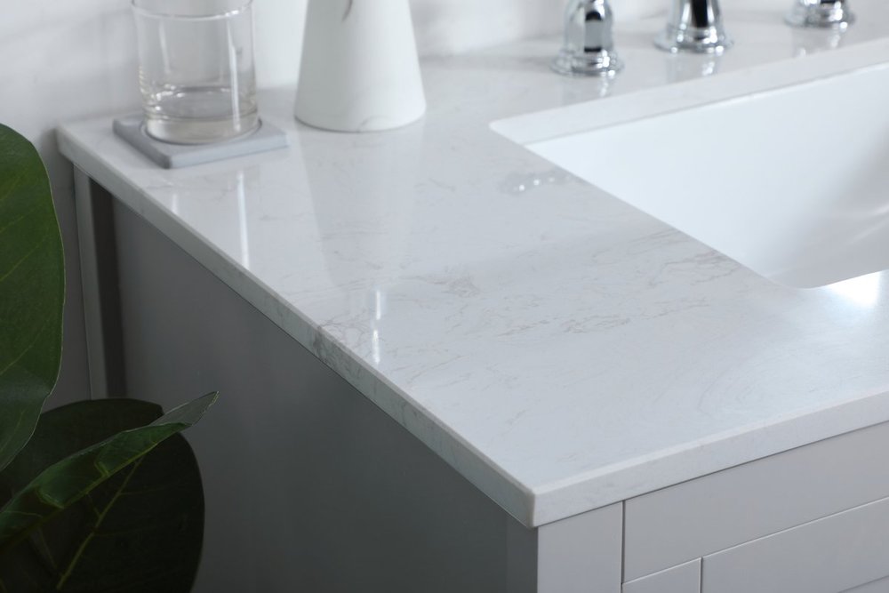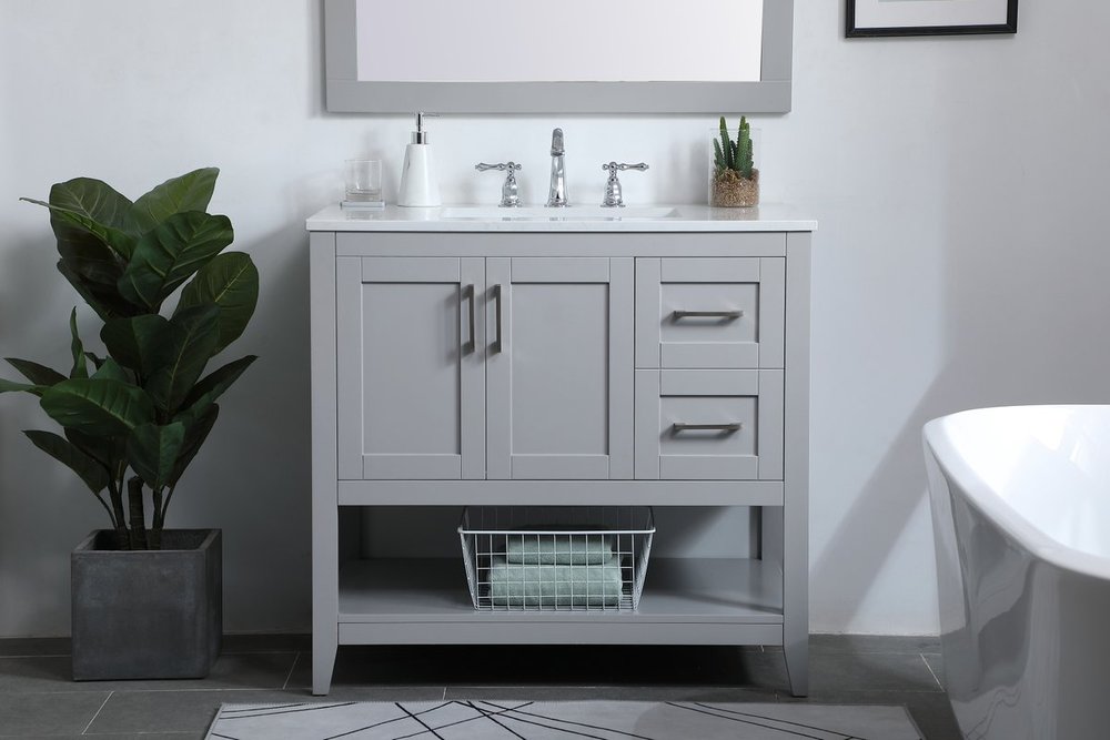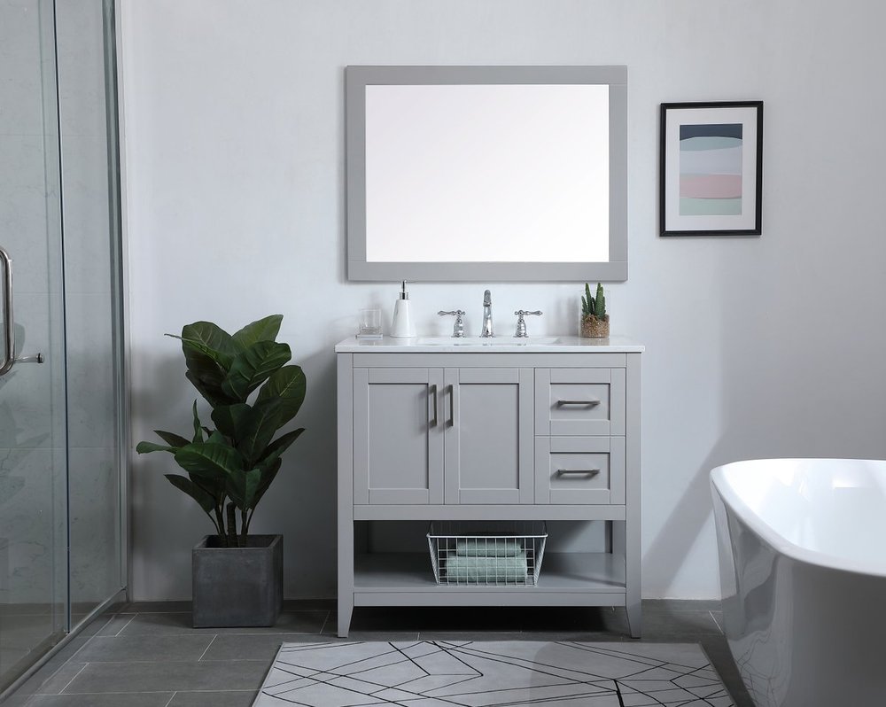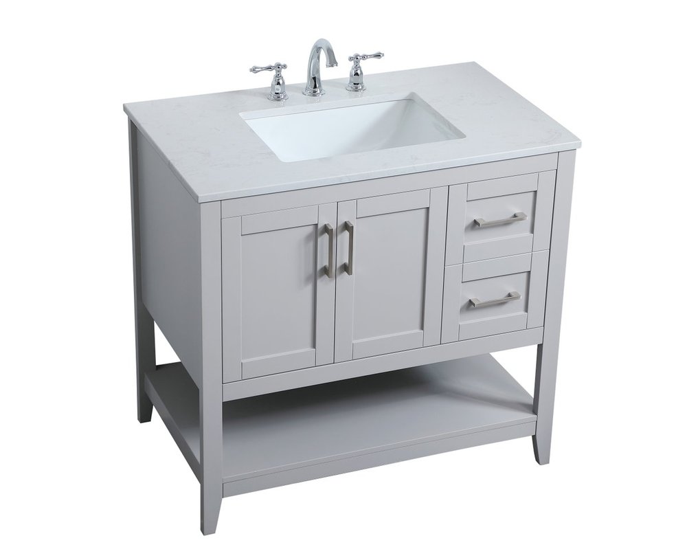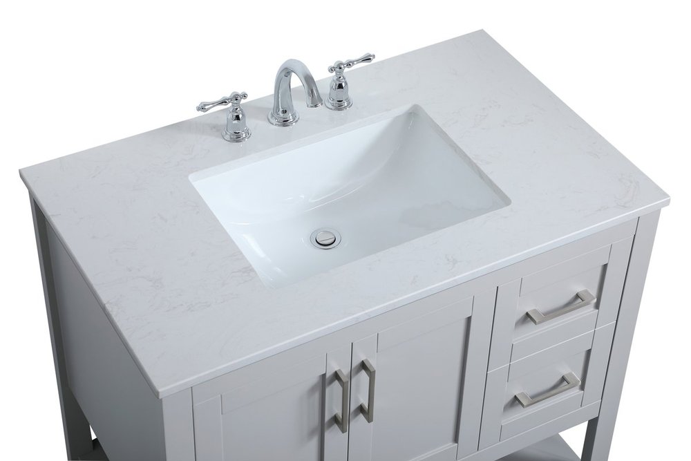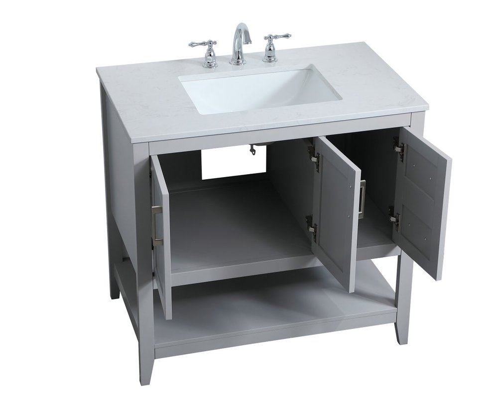 The nonchalant attitude of this 36" traditional grey finish vanity will have you wanting more. The slender brushed nickel handle bars open the 3 cabinet doors to reveal ample storage space to put away and store bathroom essentials, and the open space below allows for you to place clean towels on the rack. Topped with a Calacatta engineered marble countertop, you and your guests will enjoy this easy going vanity.