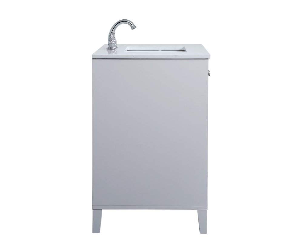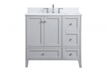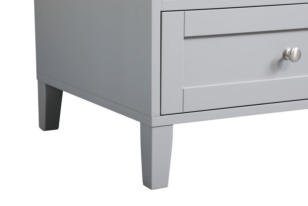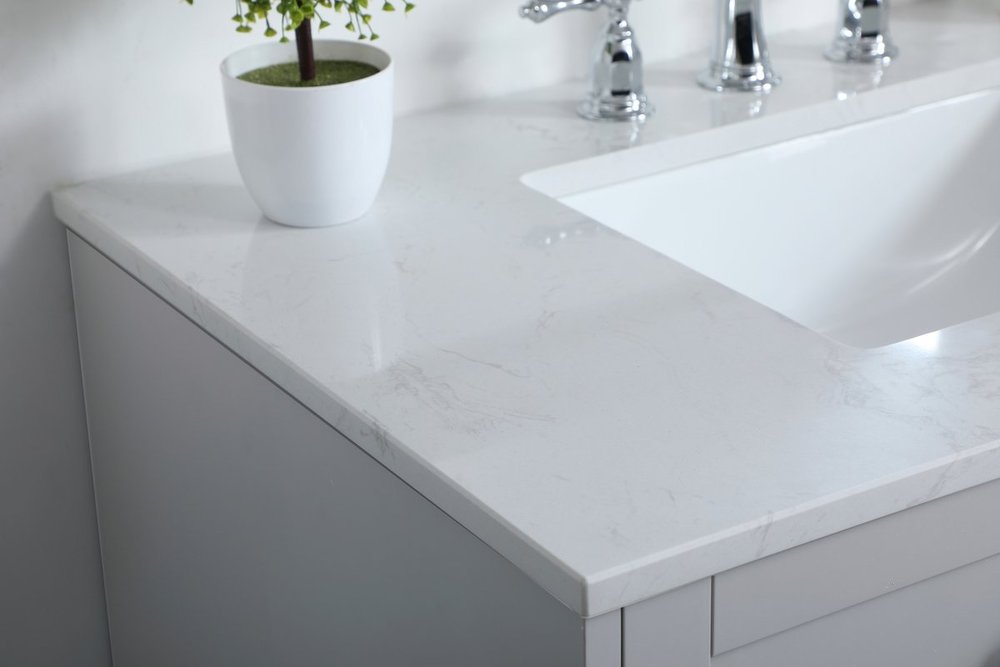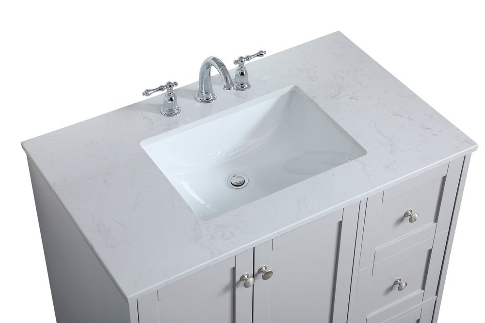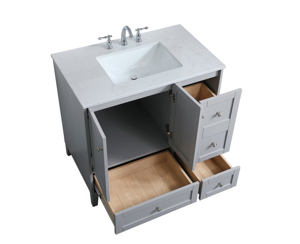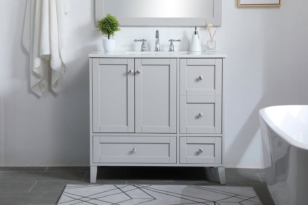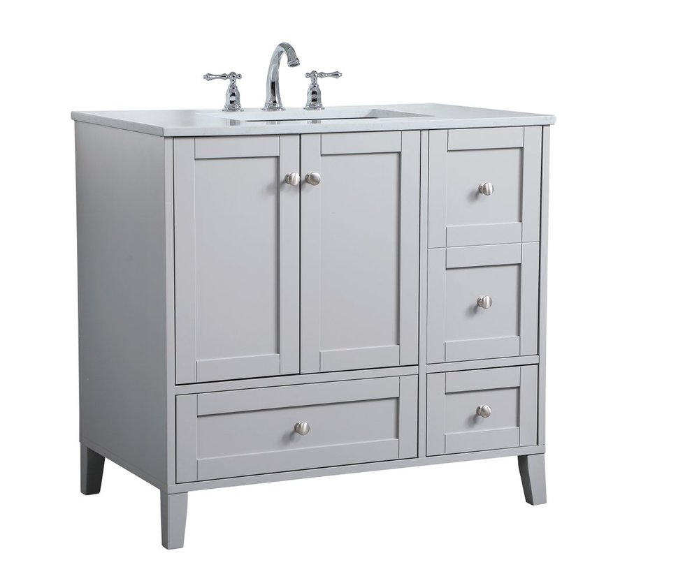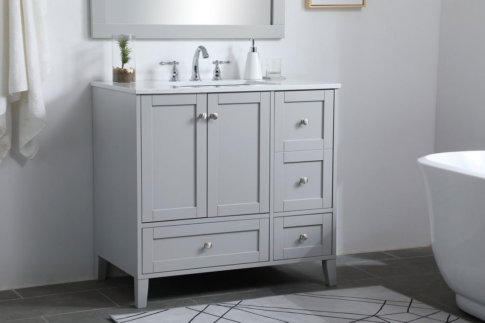 While unassuming, this 36" vanity in a grey finish sure knows how to redefine luxury. The sleek brushed nickel knobs adorn the double cabinet doors and 3 drawers which allow you to store your bathroom toiletries and necessities. Standing strong on oblique legs and dressed with a Calacatta engineered marble countertop, this vanity will surely create beauty and casual elegance in your bathroom or powder room.