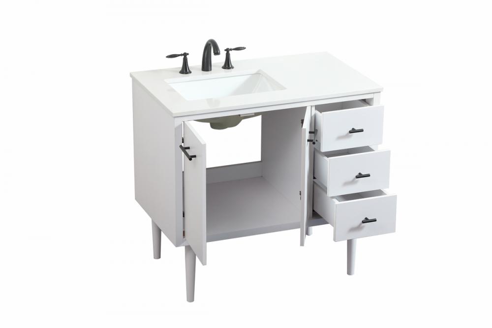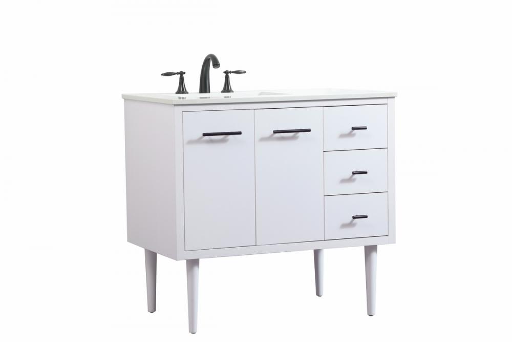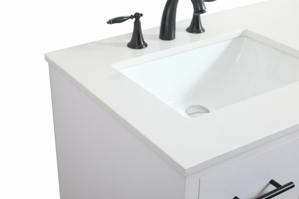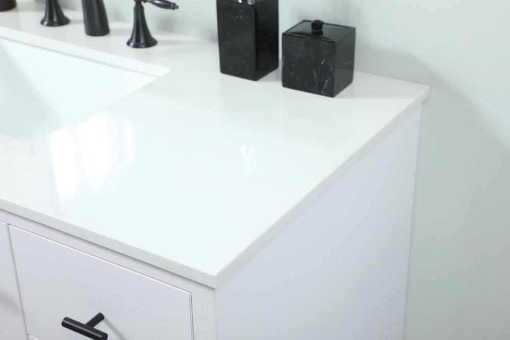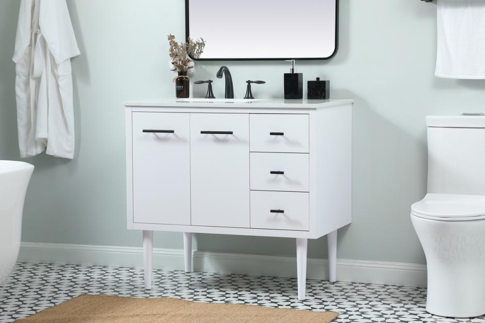 Delve into a world of minimalistic fashion and contemporary styling with this midcentury modern vanity. The clean lines anchors the design, while the straight tapered cylinder legs add subtle interest. Bar pull handle adorns the soft closing door hiding the base of the rectangular porcelain sink and letting you store your bathroom necessities and toiletries. Three soft closing drawers add plenty of storage option. Whether you want to use this as a floating vanity or a freestanding vanity, the choice is yours. The durable ivory white engineered marble countertop complements the manufactured wood base vanity and is built to last.
