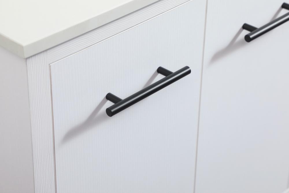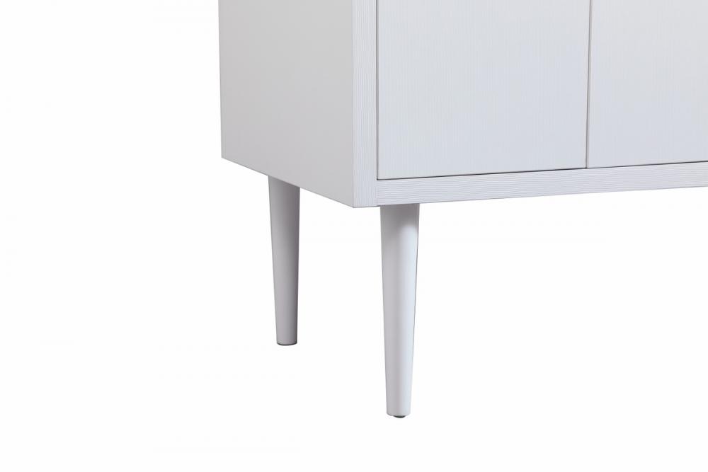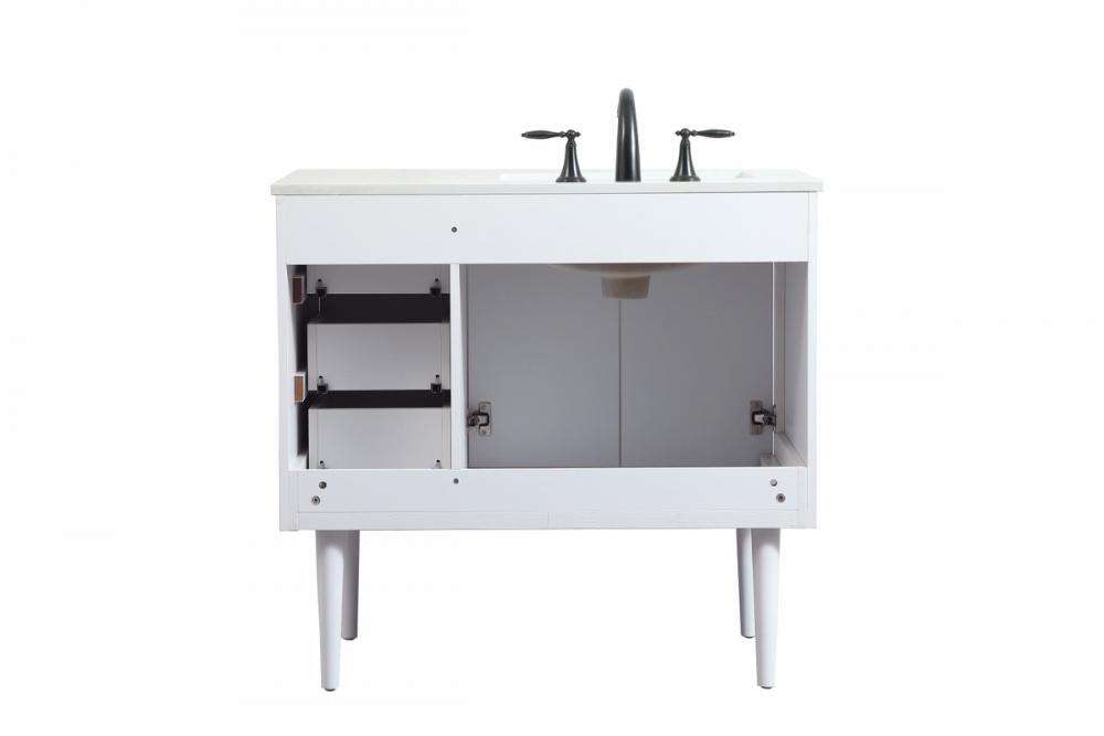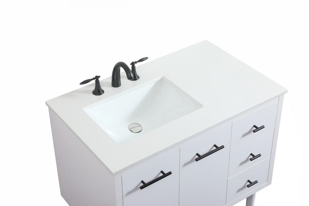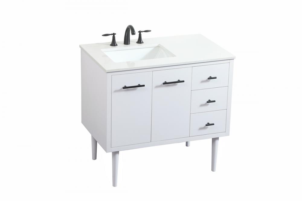Delve into a world of minimalistic fashion and contemporary styling with this midcentury modern vanity. The clean lines anchors the design, while the straight tapered cylinder legs add subtle interest. Bar pull handle adorns the soft closing door hiding the base of the rectangular porcelain sink and letting you store your bathroom necessities and toiletries. Three soft closing drawers add plenty of storage option. Whether you want to use this as a floating vanity or a freestanding vanity, the choice is yours. The durable ivory white engineered marble countertop complements the manufactured wood base vanity and is built to last.