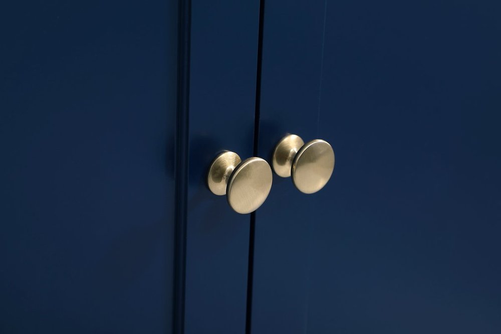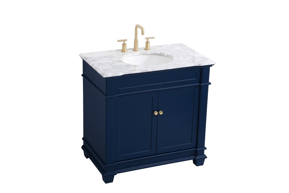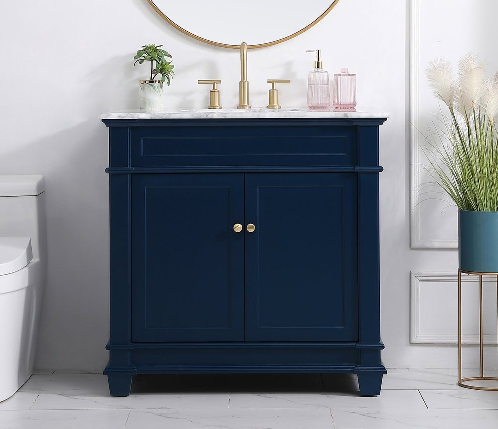 The Wesley Collection vanity cabinet will bring a settle pop of color into your bathroom. The navy blue is a cool color which creates a calming atmosphere in the room. The gold knobs bring a vibrant touch to balance the vanity. With the detailed engravings, the cabinet catches eyes with its beautiful lining work. Open the cabinet doors to store what you desire and make use of the spacious area. To top it off, the Carrara white marble adds a luxury and modern finish to the countertop.
