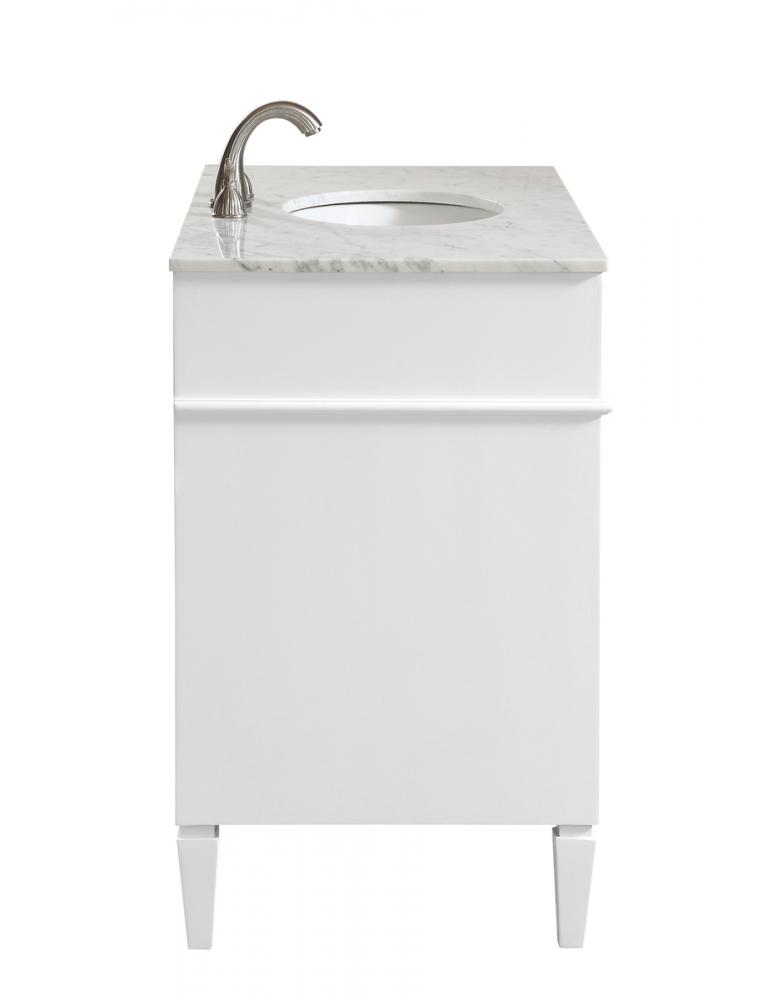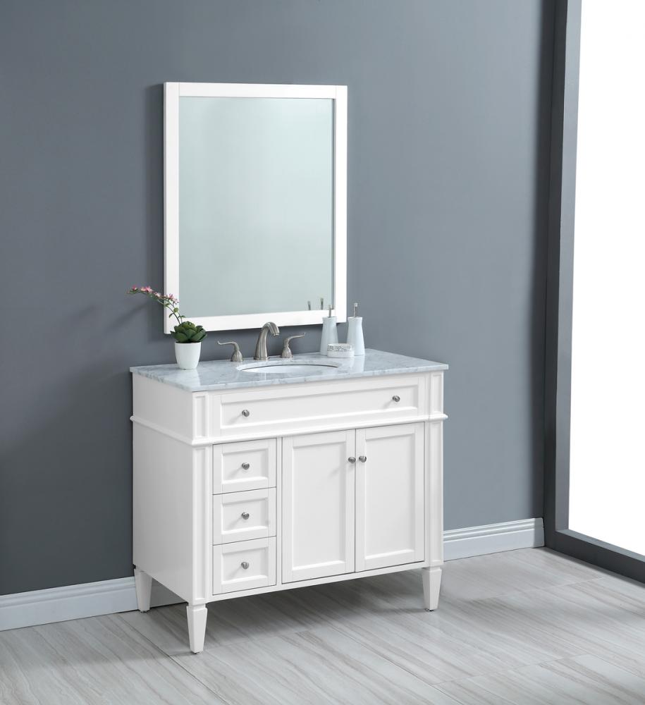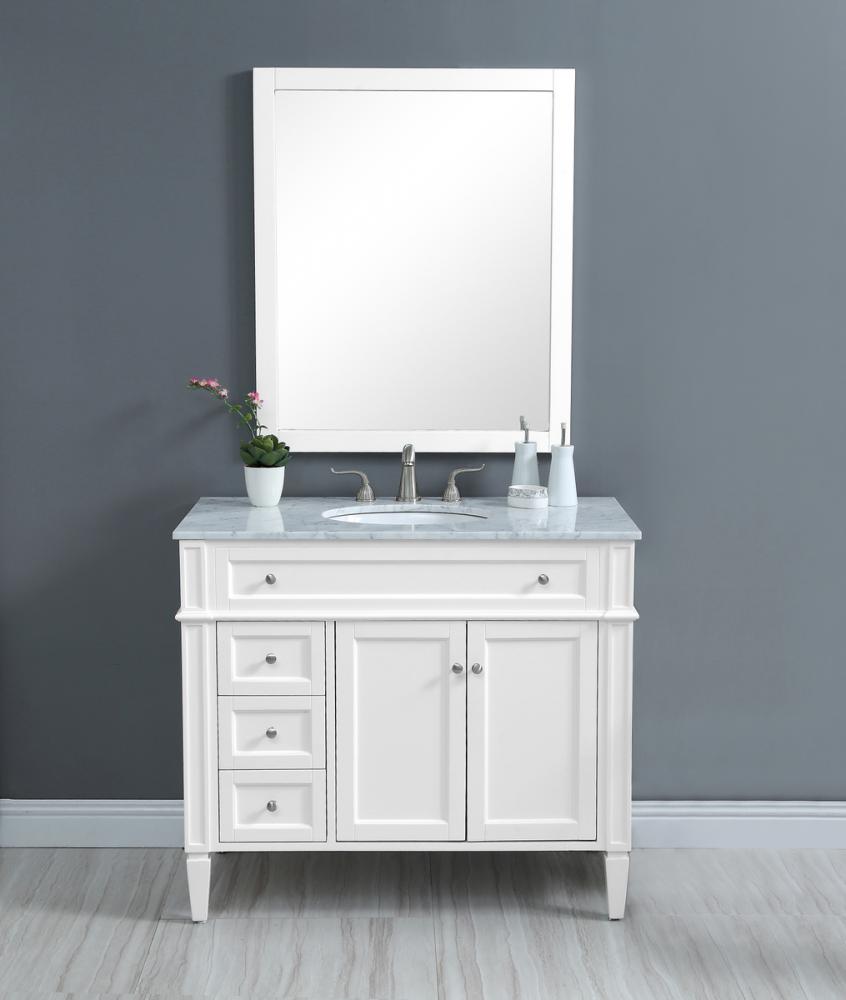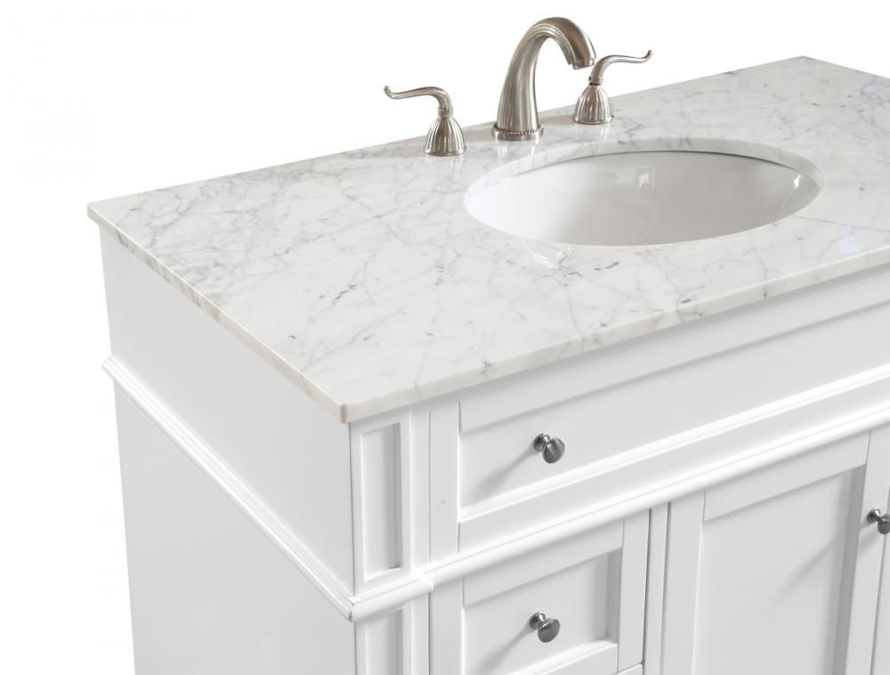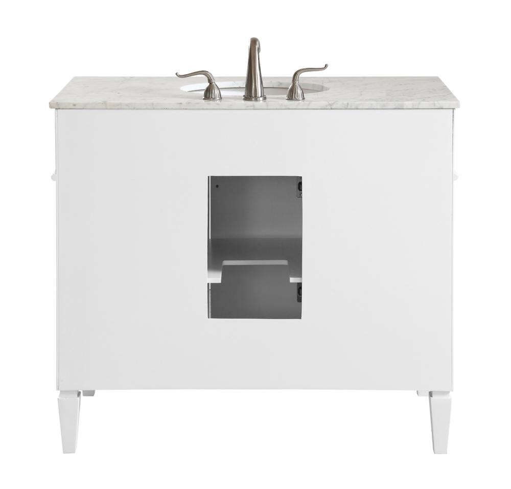This classic, contemporary marble top vanity console from our “Park Avenue” collection is roomy enough to keep all your bath essentials close at hand. Fitted with a spacious Italian Carrara white marble counter top and an oval porcelain sink, you will naturally enhance your home or office bathroom with both its beauty and practicality. Featuring a hand painted white cabinet, 3 deep drawers and a set of recessed door with shelf inside, brushed steel knob and tapered leg. measurements: W40”xD21.5”Xh35”