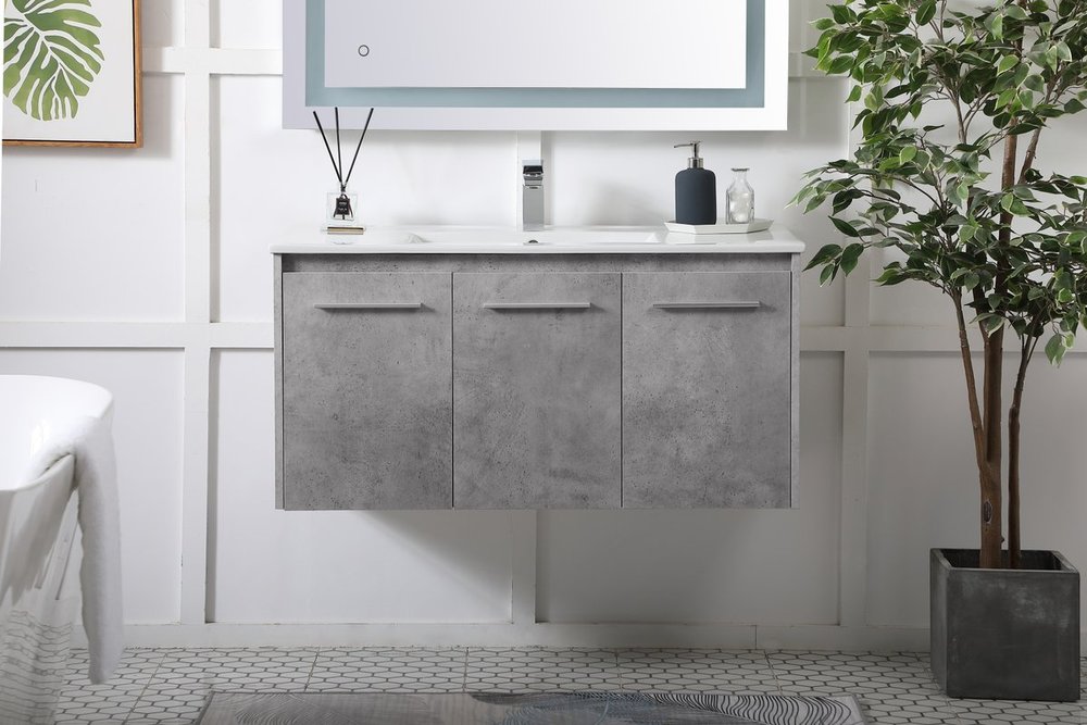 The contemporary simplicity of this 40" floating vanity in a concrete grey finish will help open the space and add stunning modern flair to your bathroom or powder room. The open space below makes it easy to show off your tiles and to clean the floor with ease--it's also the perfect place for a hamper. 3 doors open to reveal plentiful of storage pace to store all of your bathroom miscellany. The clean lines that permeate through the design will surely create a fresh look in your home.