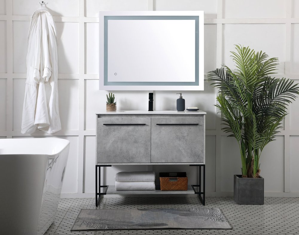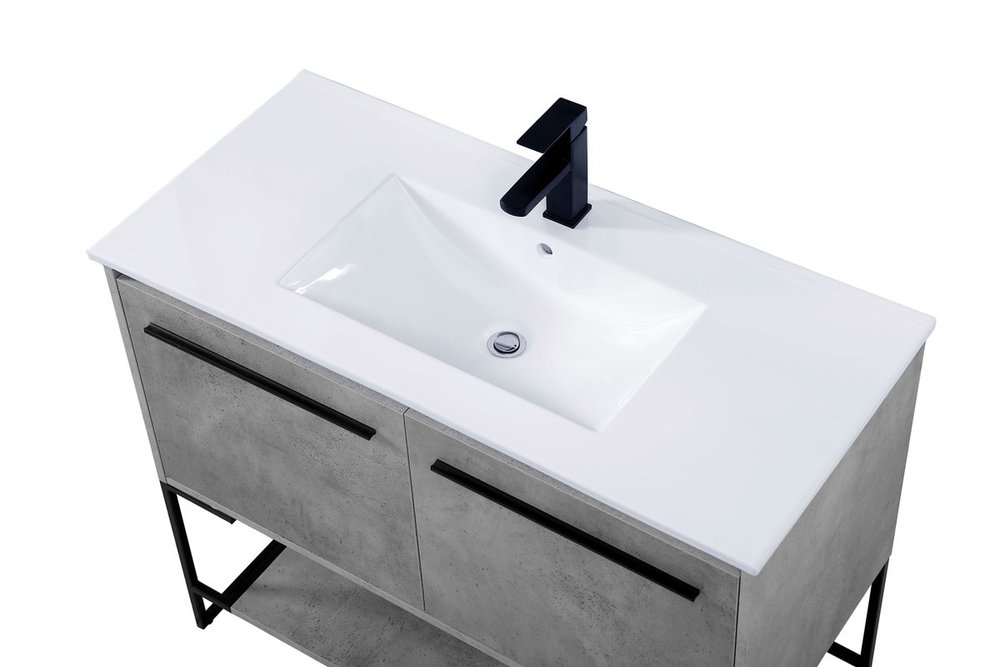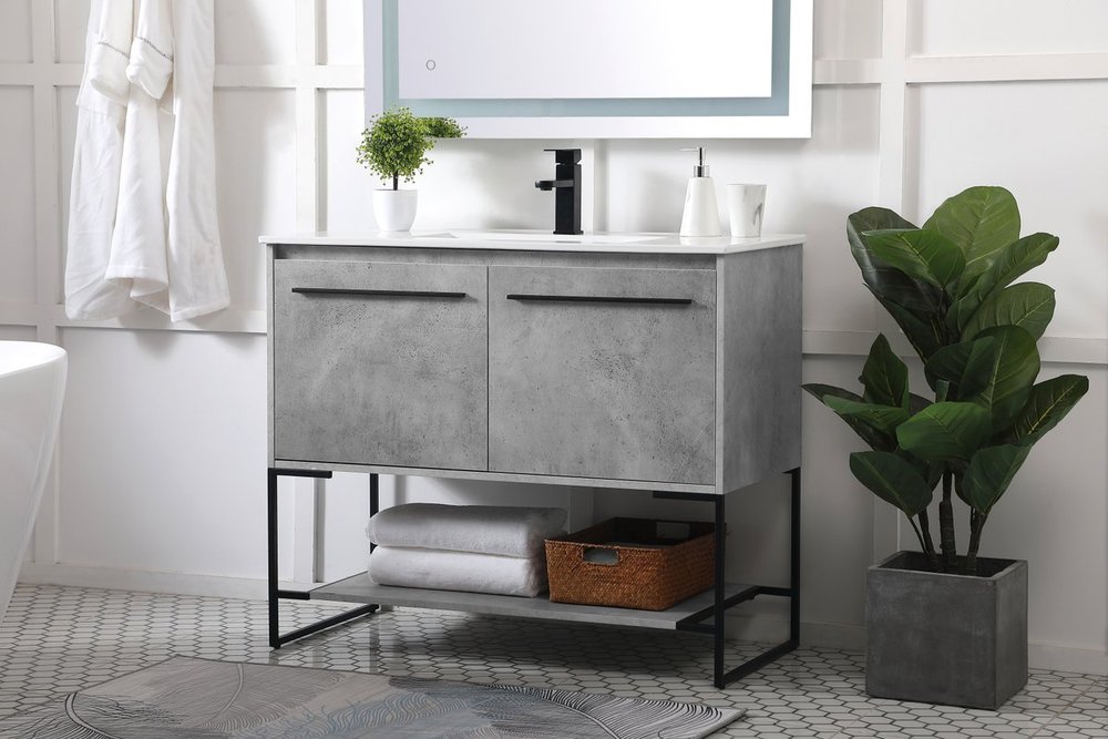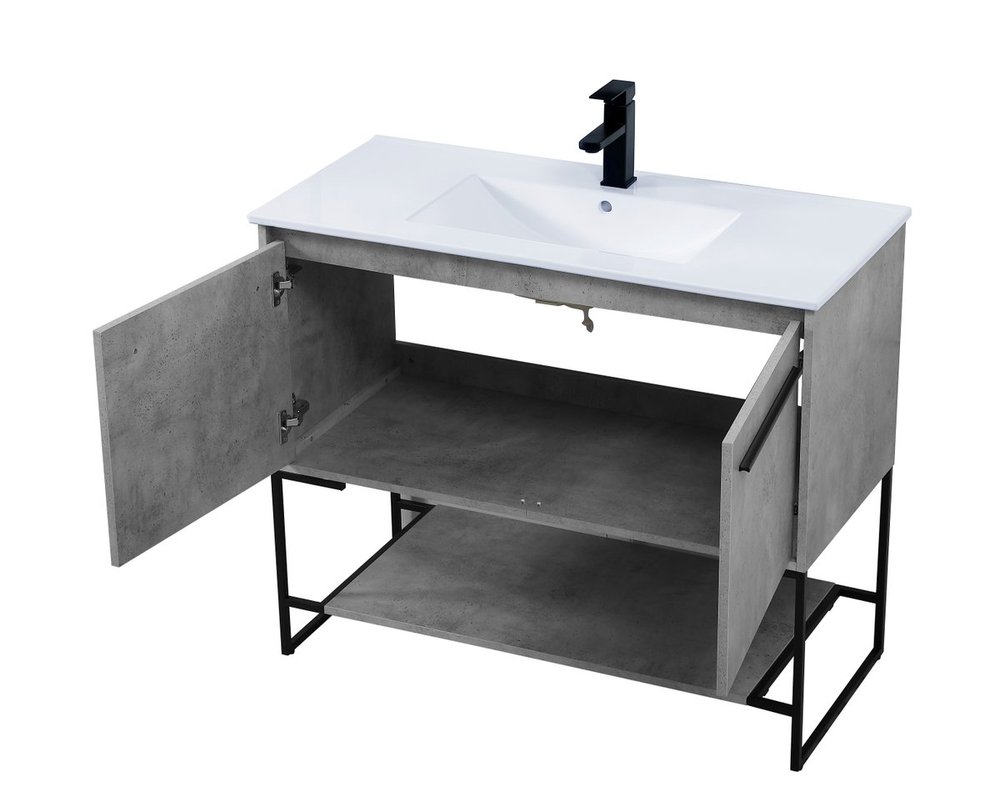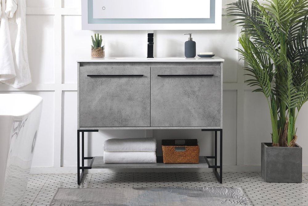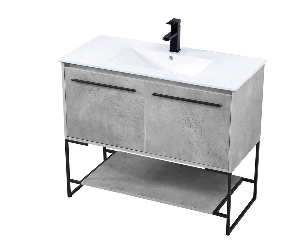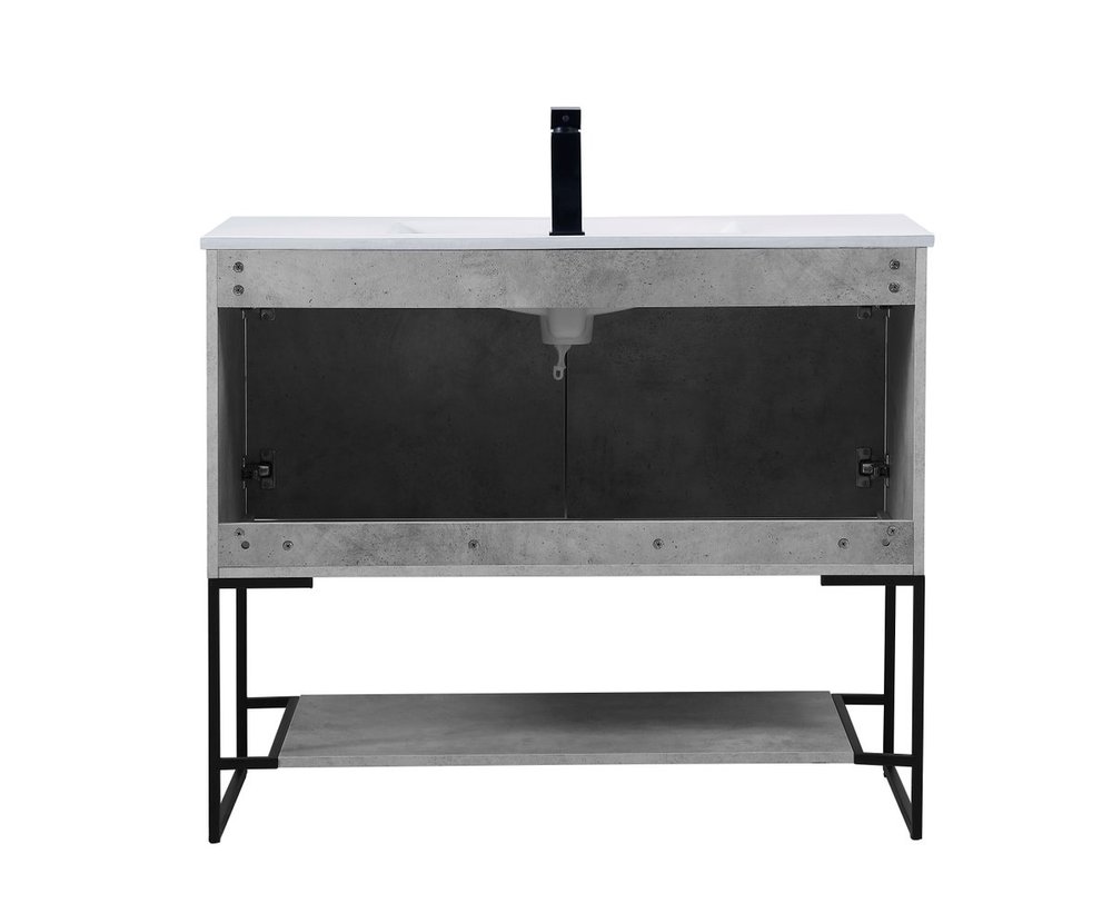 Live in modern comfort with this 40" concrete grey finish vanity. Dressed in a concrete grey and sleek black metal hardware, its contemporary style will have your bathroom or powder room elevated in industrial sophistication. The open shelf at the base and two doors reveal ample storage space for your bathroom essentials and miscellany. Clean lines create its own visual interest, adding trendy looks to your already chic room.