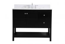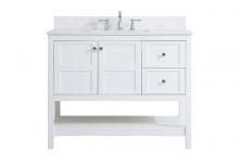 The subtle beauty of the Theo collection 42" vanity in a blue finish exudes comfortable luxury. Its modern, yet traditional beauty will surely dress up your bathroom or powder room without any fuss. The white stone countertop and porcelain undermount sink shows quiet opulence, and the legs support upright without fail. Gold hardware complements the trendy blue finish, with pulls adorning the two cabinet doors and two drawers, showcasing ample storage space within. Slated shelf allows for additional space to organize your towels. Whether this vanity is in your bathroom or for guests, its presence will surely elevate the aesthetics of your room.