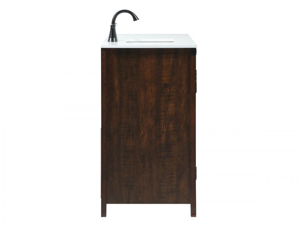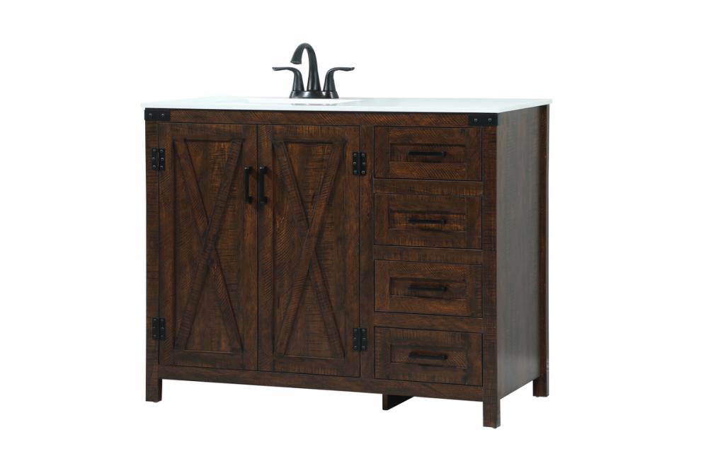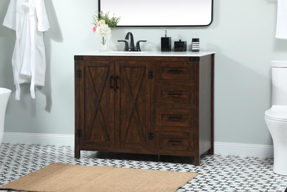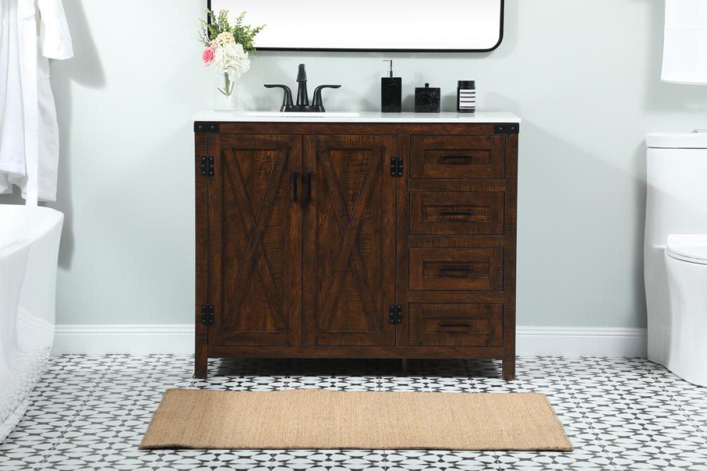 Reminiscent of barn doors, the two door cabinet and four drawers adds both stylistic charm and function with its plethora of storage options for all your bathroom essentials. Whether for your bathroom or the guests', everyone will marvel at its classic look for traditional and farmhouse aesthetics. A slab of engineered marble rounds out the piece up top, as well as the porcelain under mount sink and predrilled faucet holes. This vanity arrives fully assembled.