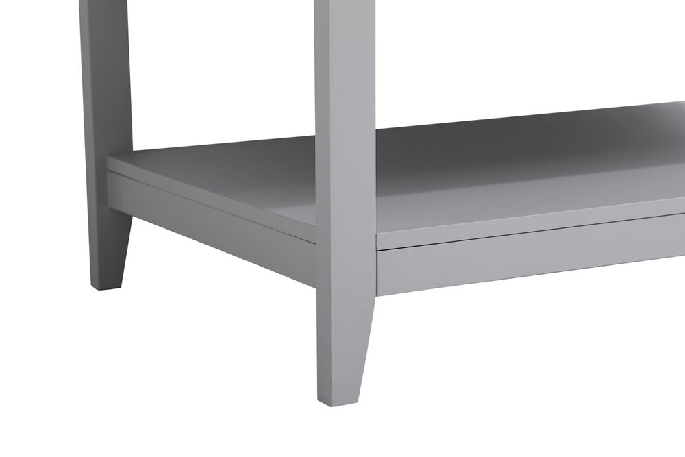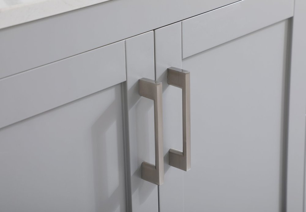 The nonchalant attitude of this 42" traditional grey finish vanity will have you wanting more. The slender brushed nickel handle bars open the 3 cabinet doors to reveal ample storage space to put away and store bathroom essentials, and the open space below allows for you to place clean towels on the rack. Topped with a Calacatta engineered marble countertop, you and your guests will enjoy this easy going vanity.