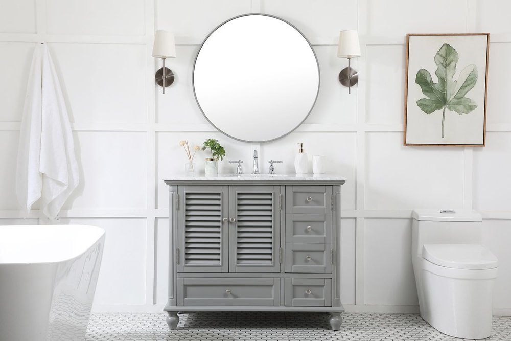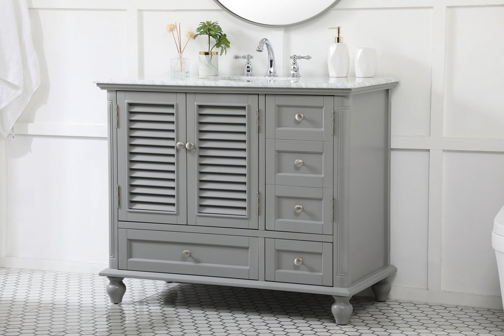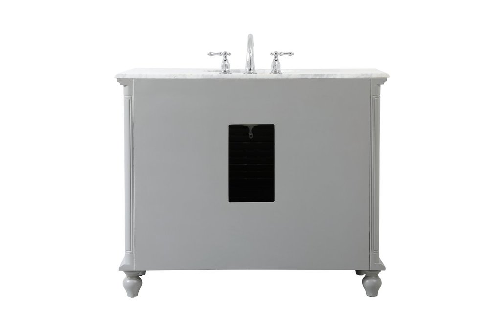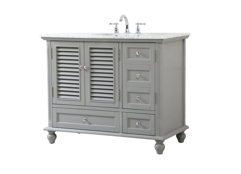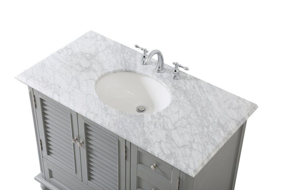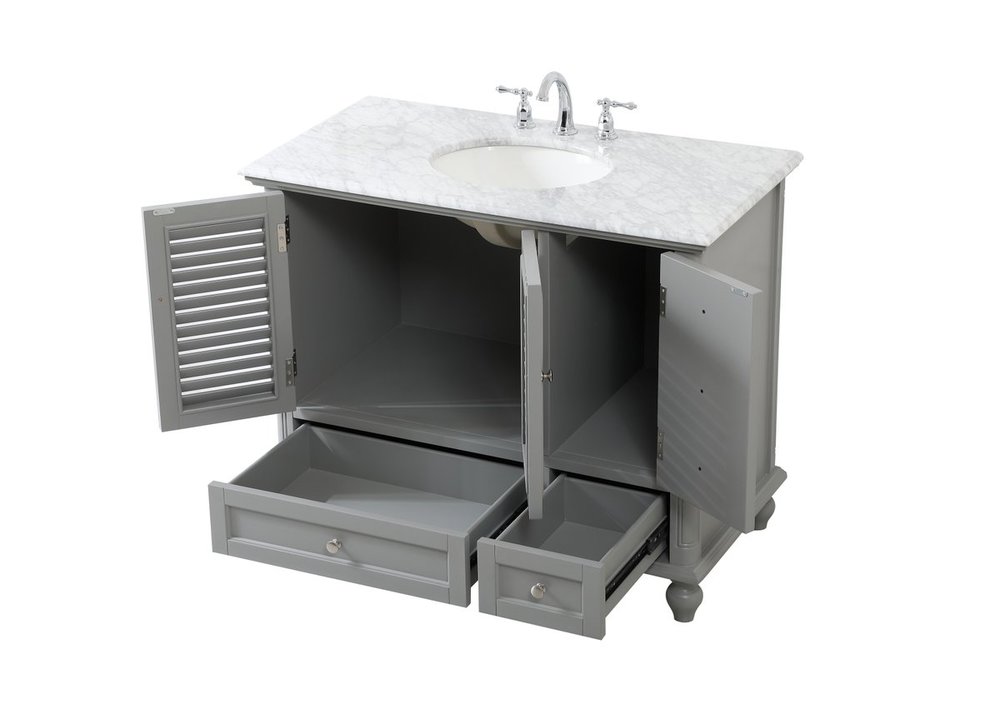 The Rhodes collection compact vanity will add lovely sophistication and complement any small bathroom or powder room, while utilizing its charm and function to provide you with ample storage spaces. Metal round knobs gently adorn the shuttered cabinet door and drawer at the base, allowing for you to store away your bathroom essentials. The Carrara white marble countertop, porcelain undermount sink, dignified subtle engravings on the side edges, and rounded legs all come together to create contemporary beauty. Work with your space, and design a beautiful room, no matter the size.