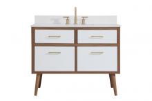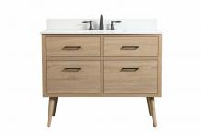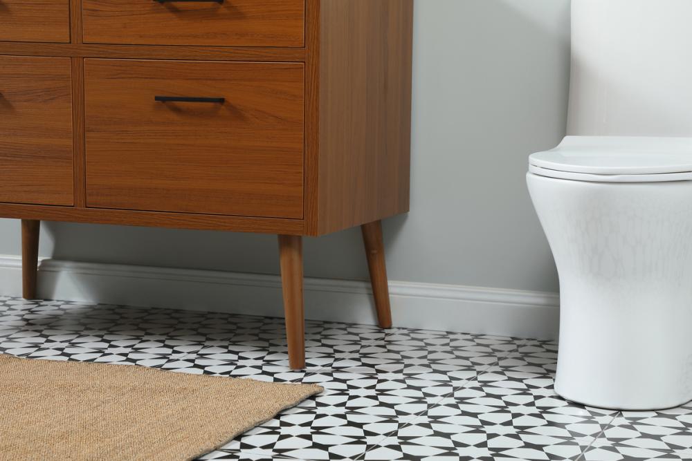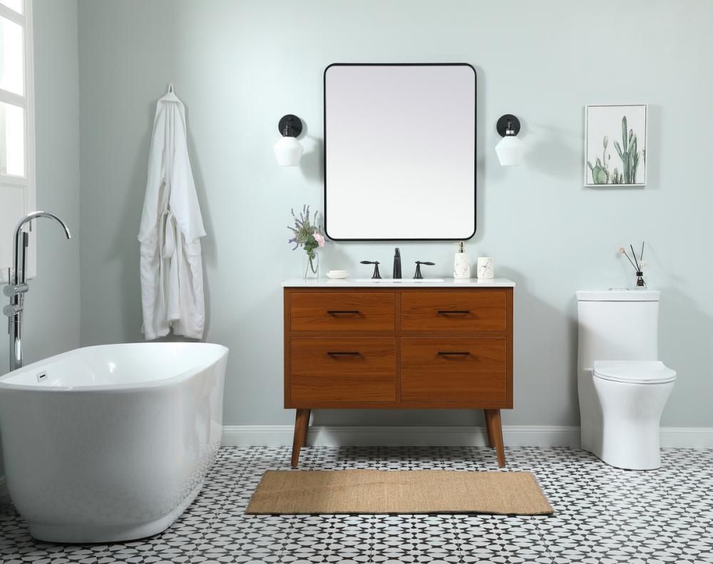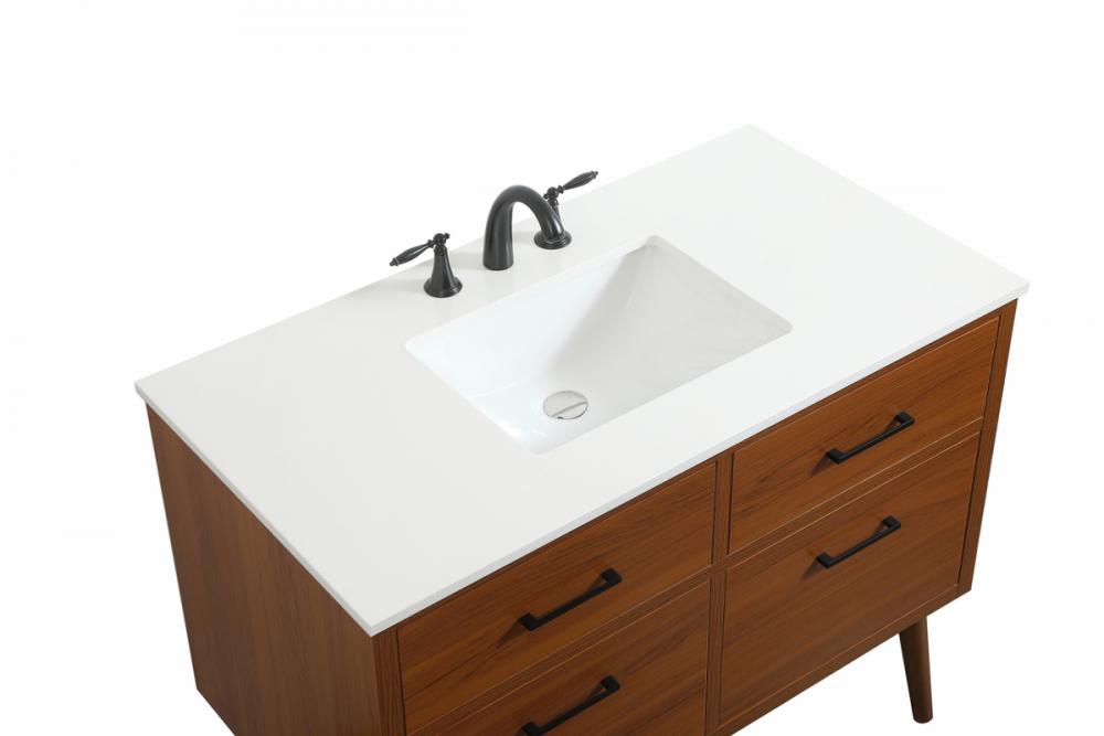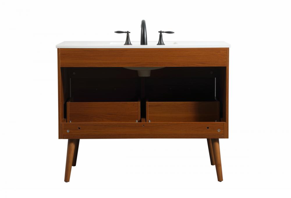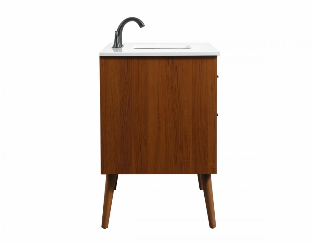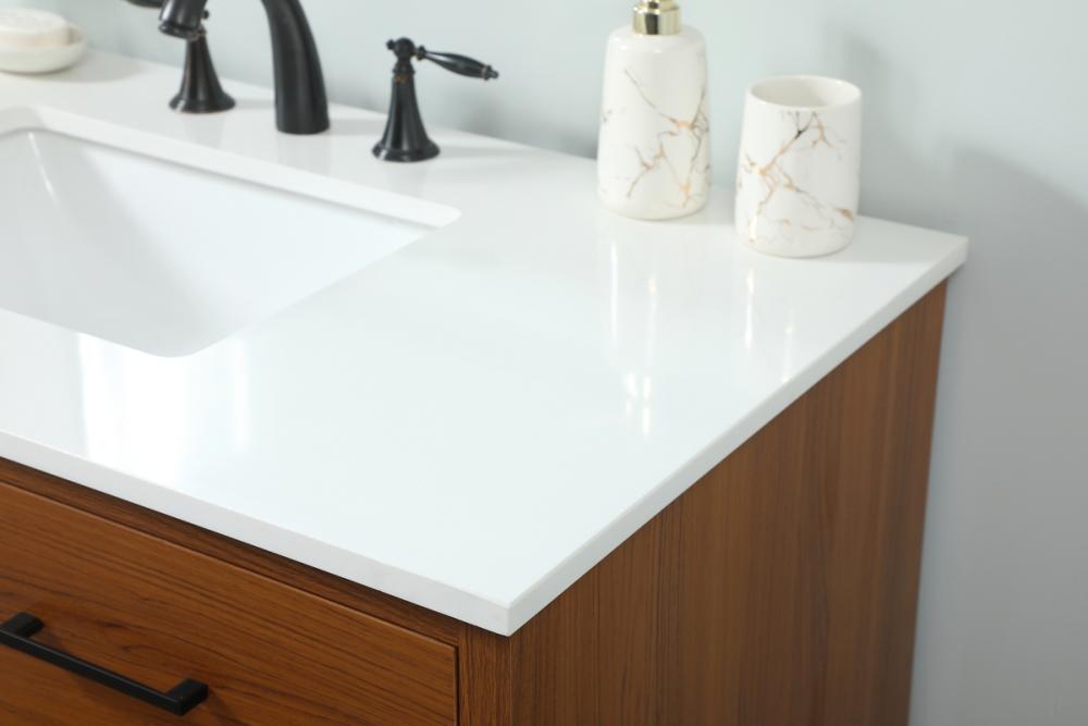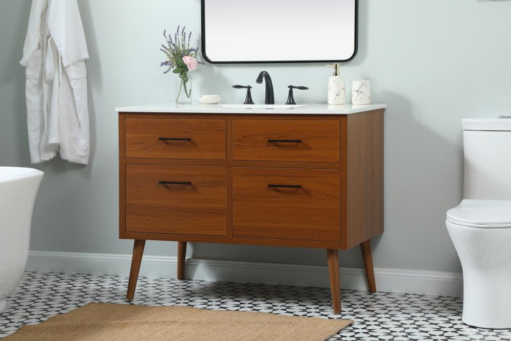This bathroom vanity is a perfect way to outfit your home in authetic midcentury modern style. The clean lines anchors the design, while the oblique tapered cylinder legs add subtle interest. A black handle adorns the top drawer hiding the base of the undermount porcelain sink while another one allows you to pull the bottom drawer out, letting you store your bathroom necessities and toiletries. The storage drawers provide much needed function and can be used for stowing items like extra toothbrushes, hairbrushes, and other bathroom essentials to help you get ready to face the day. This vanity is a quick update for your bathroom with trendy style.