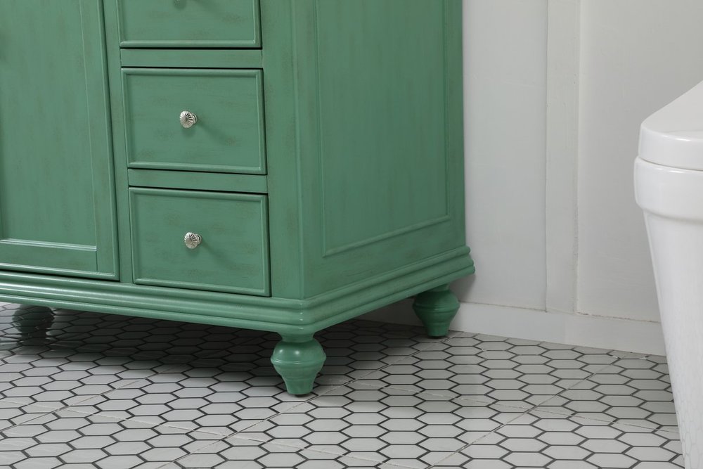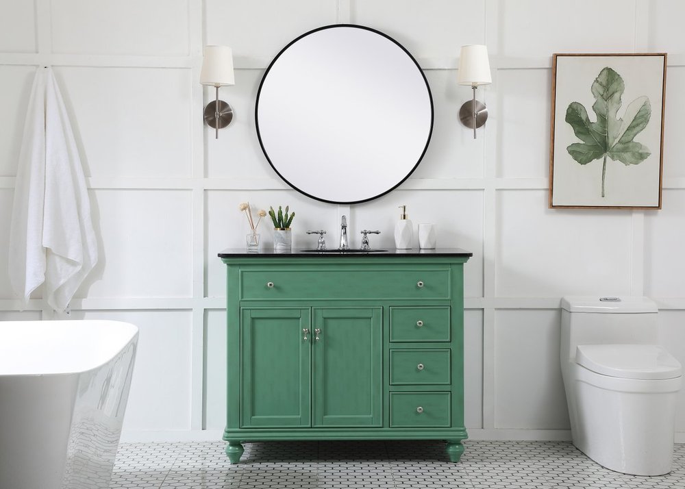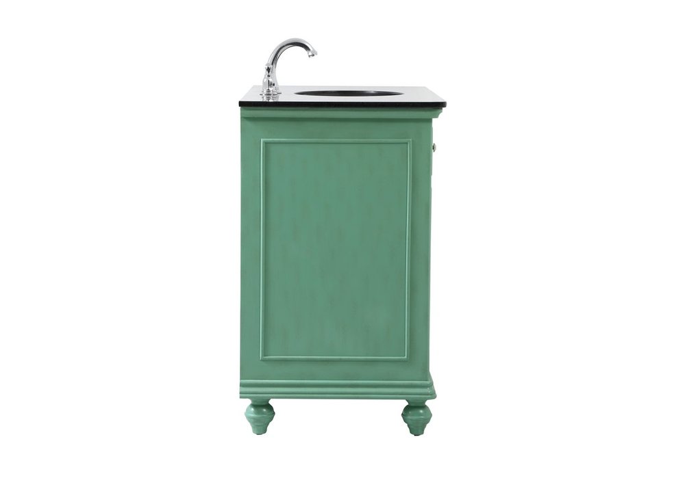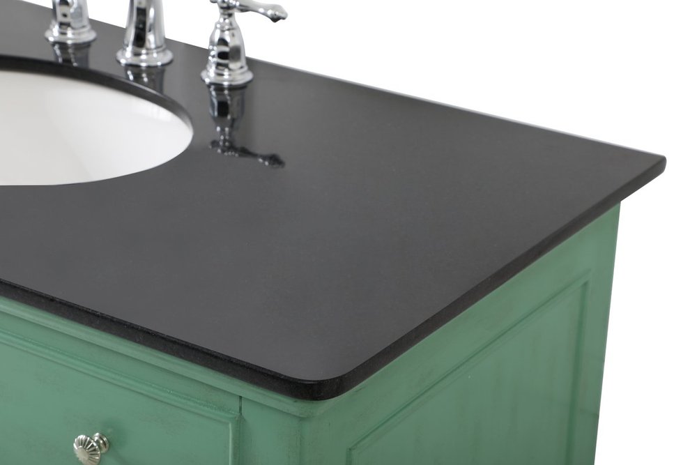 Create a refined and relaxing bath space with this contemporary design vanity, presenting its simplicity and clean straight lines in a minimalist appeal. This vanity, crafted of solid poplar wood and engineered wood panels, provides ample storage within its soft-close cabinet door, accentuated with metal hardware. Rounding out the design is a black granite top with a white porcelain under-mount oval sink. Convenient access for plumbing installation with cut out back panel. Hand painted finish with distressing application to provide an antique effect.