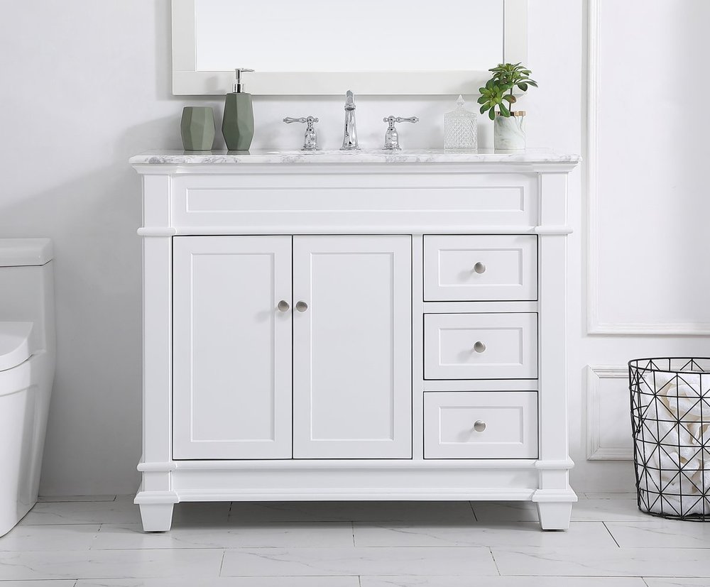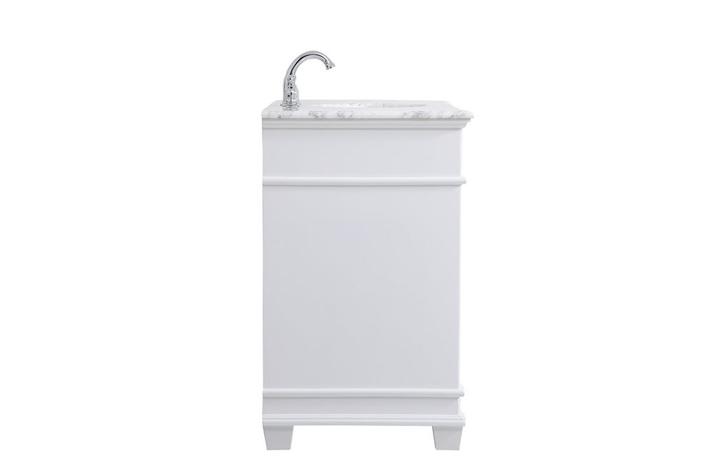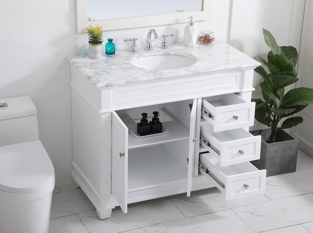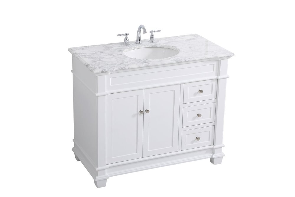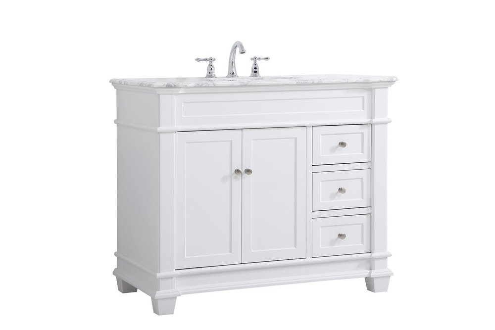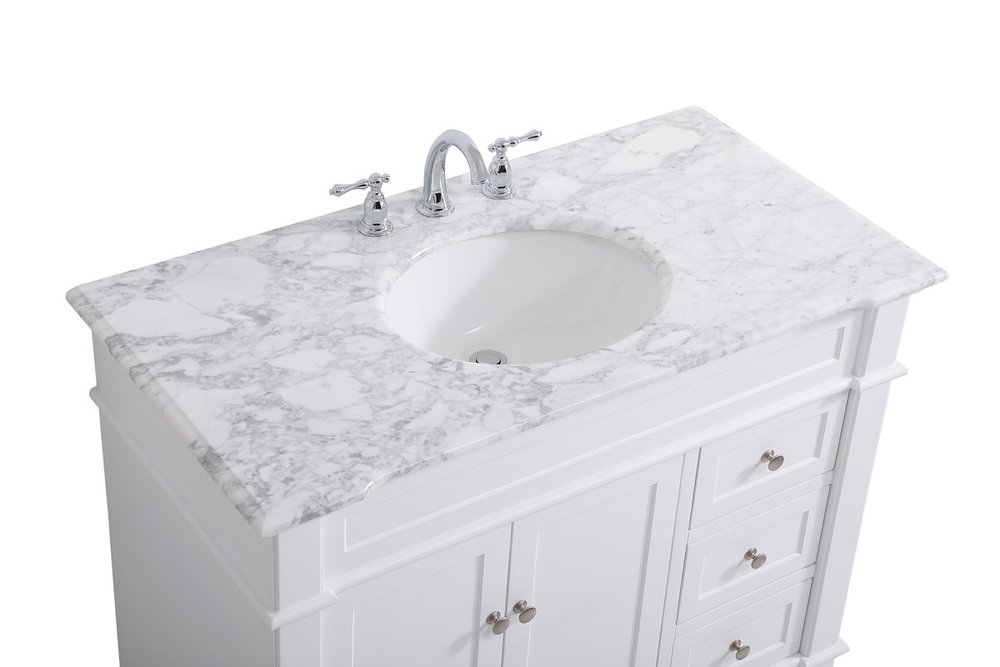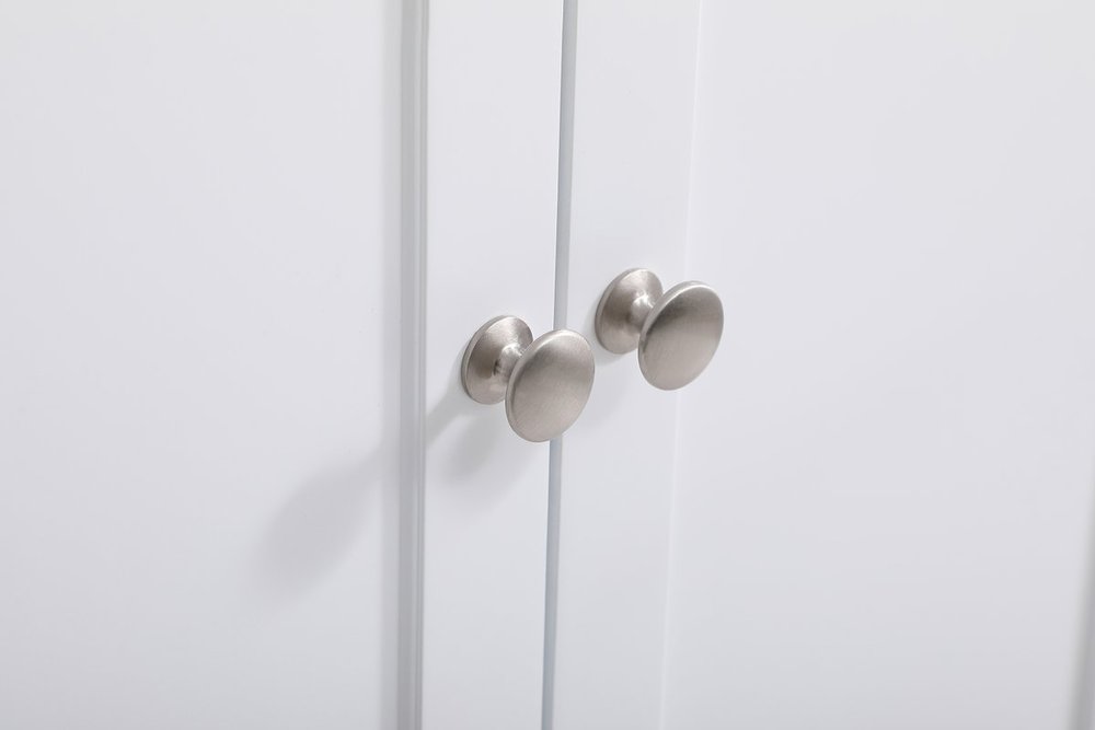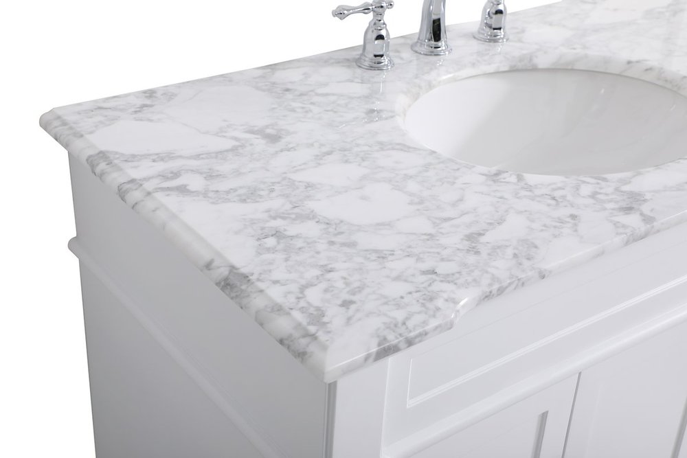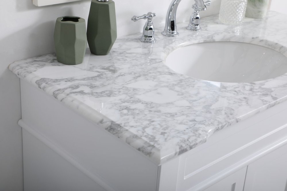 The Wesley Collection vanity cabinet will bring a settle pop of color into your bathroom. The white finish is a sophisticated color which creates a calming atmosphere in the room. The brushed nickel knobs bring a vibrant touch to balance the vanity. With the detailed engravings, the cabinet catches eyes with its beautiful lining work. Open the cabinet doors to store what you desire and make use of the spacious area. To top it off, the Carrara white marble adds a luxury and modern finish to the countertop.
