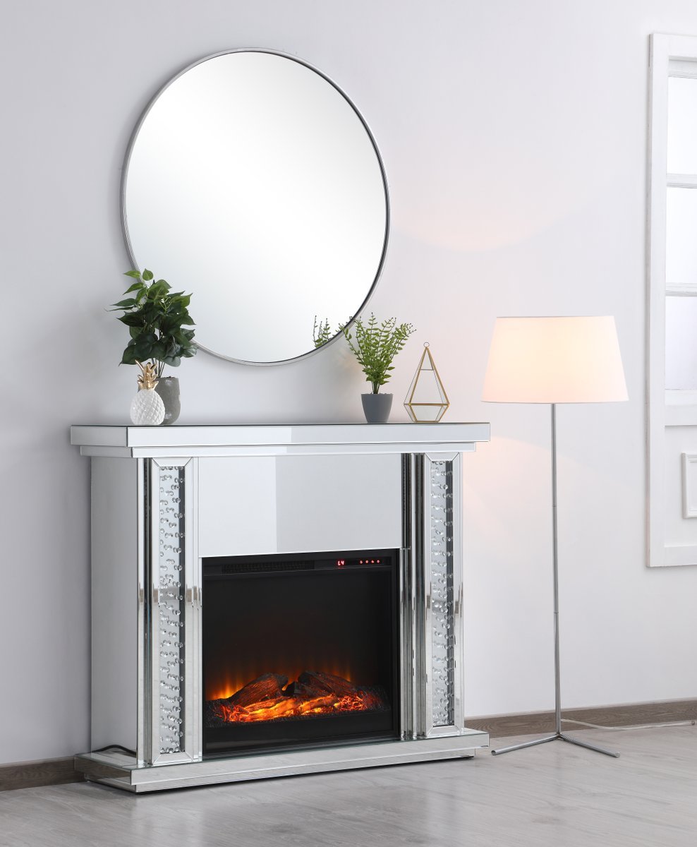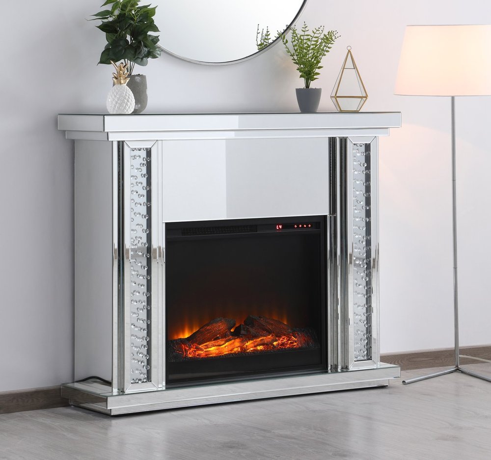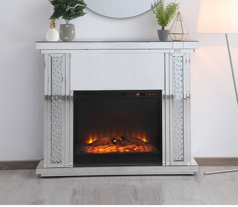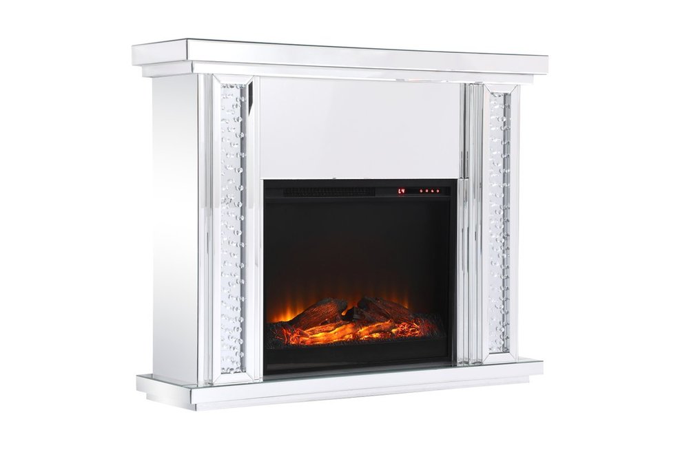 Live lavishly and sip on a glass of bubbly as the fire crackles in the wood log insert. The sparkling clear crystals embedded in the columns glisten and gleam with an air of leisurely beauty, while the mirror panels offer splendid grandeur. Create a scene of indulgence by adorning the mantle with your treasures--family portraits, prized works of art, or fragrant flowers.