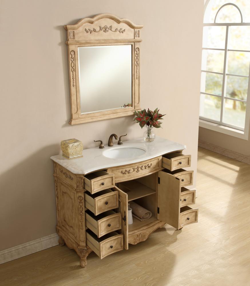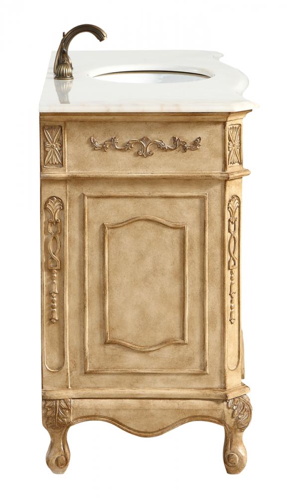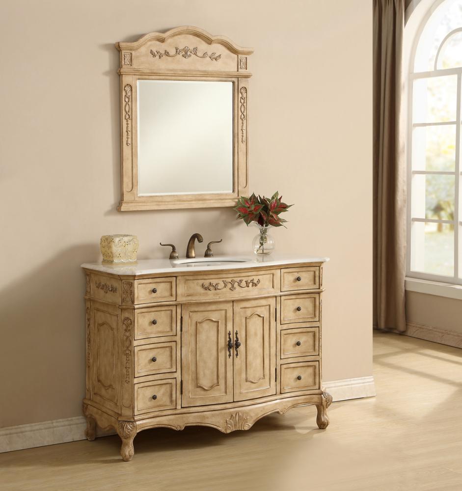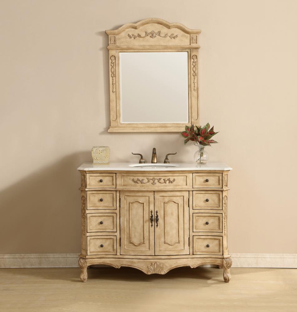 This superb balance of timeless tradition and opulent beauty in a marble-topped vanity will certainly enhance the aesthetics of any home or office bathroom! Featuring an authentic natural white marble countertop—occasionally with light brown veining, complimenting the hand painted antique beige cabinet—oval white porcelain under mount sink, 2 doors and 8 drawers, as well as antique bronze finish door knobs, a superbly carved floral design, stands on stylishly carved solid wood French scroll feet. A truly rich statement of luxury! Measurements: W48” x D21” x H35”, fully assembled.