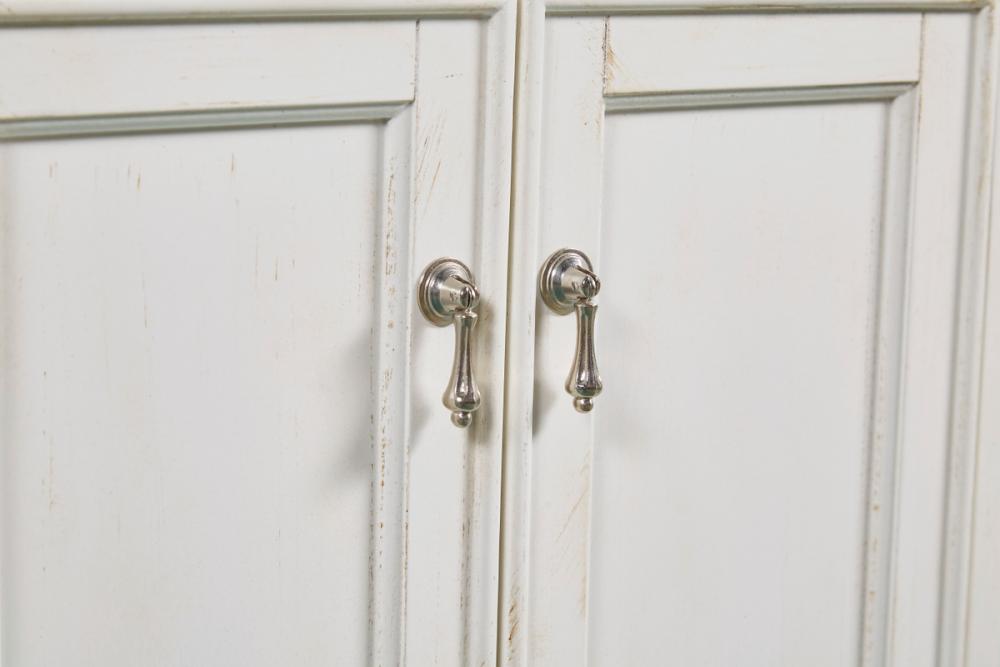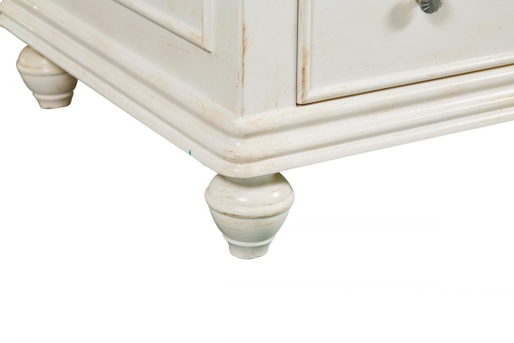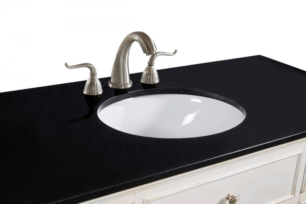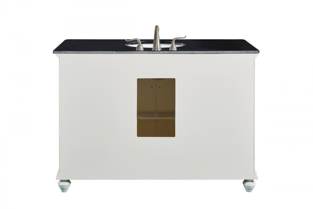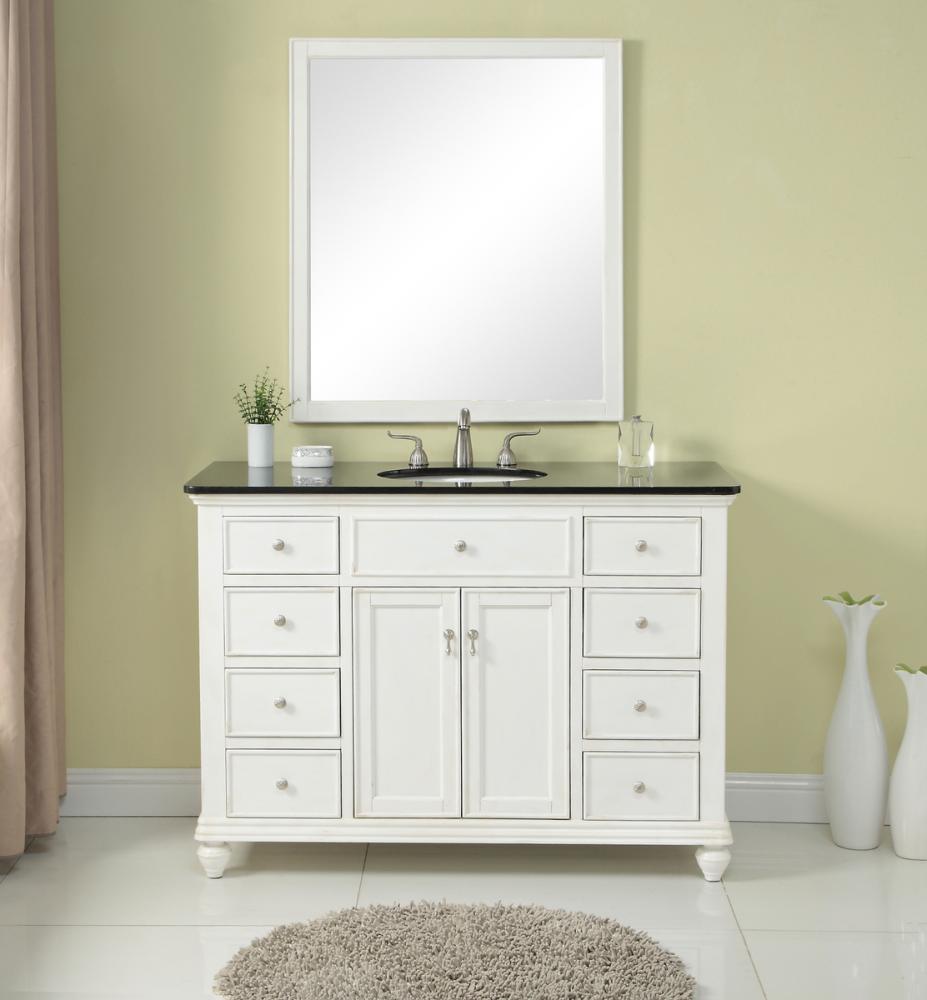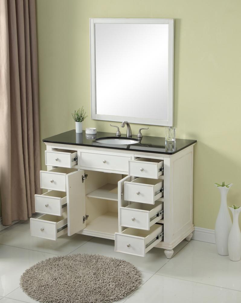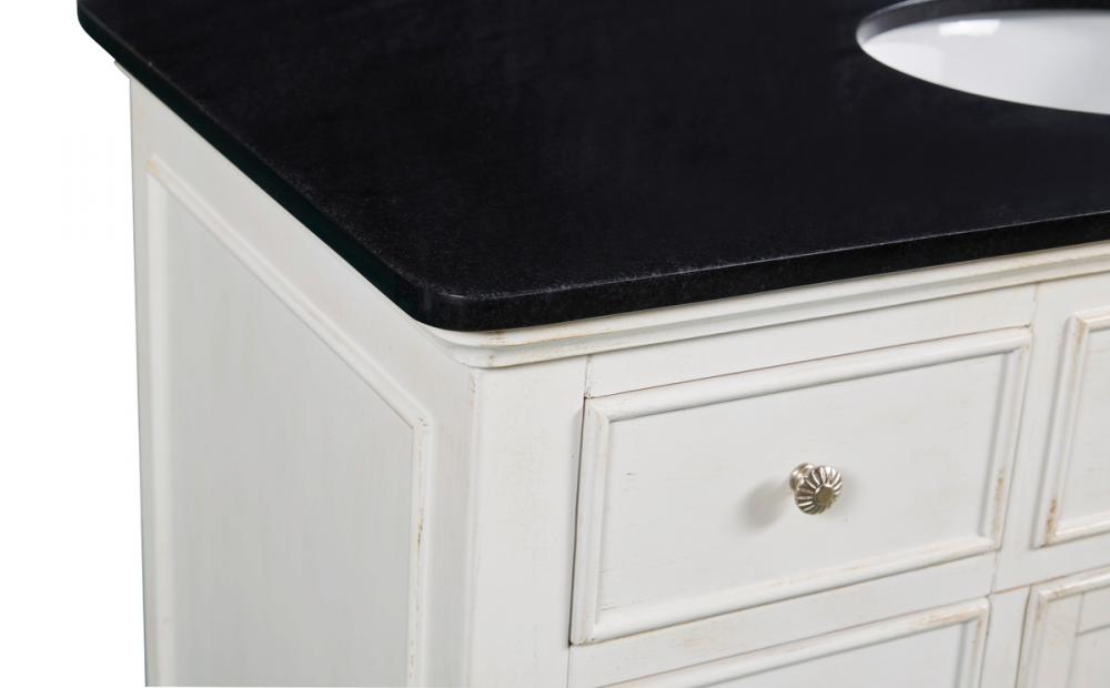 A sleekly styled 4 doors and 8 drawers, granite-topped bathroom vanity like this can only bring a smile of appreciation for its simple beauty and clean lines. With an authentic black granite counter top, oval white porcelain sink, hand painted antique white cabinet, 2 soft-close center doors with a shelf inside, 4 side drawers on each side, brushed steel hardware and carved bun feet, this elegant, transitional vanity balances form and function. Measurements: W48”xD21”xH35”