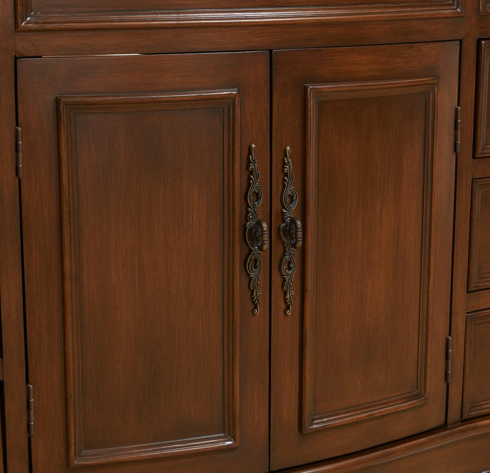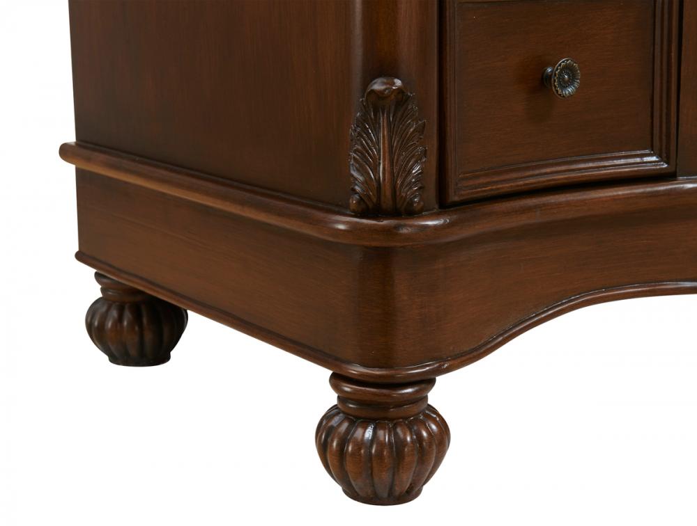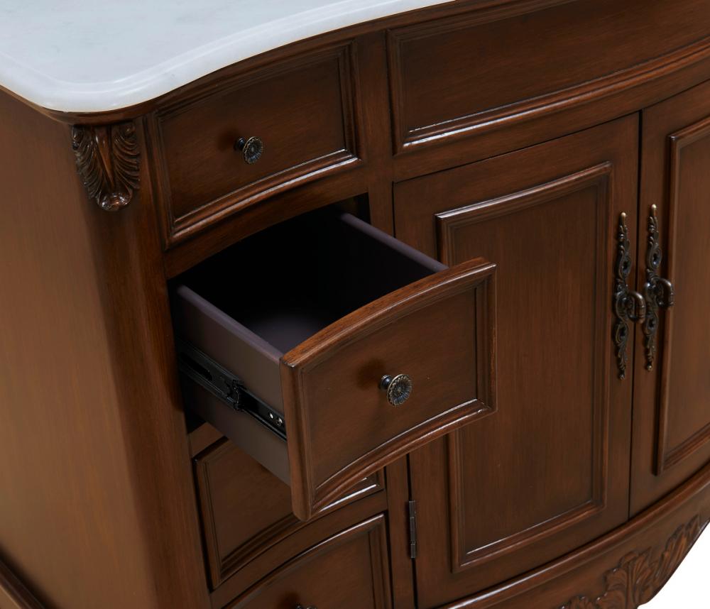 Royal, grand and glorious, this handpainted teak finish conveys a unique sense of opulence with its scalloped and floral carved frame that features a wide authentic white marble countertop.