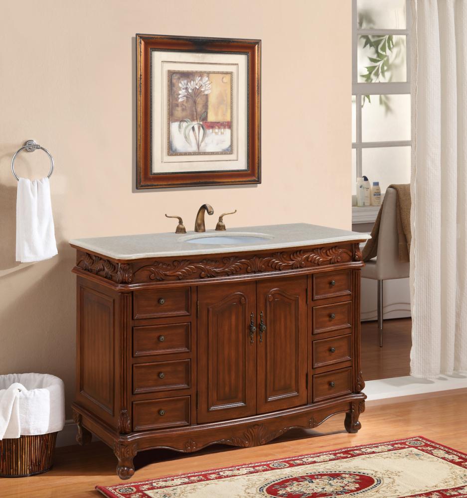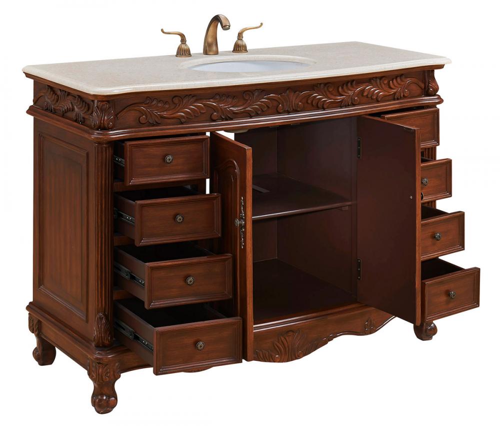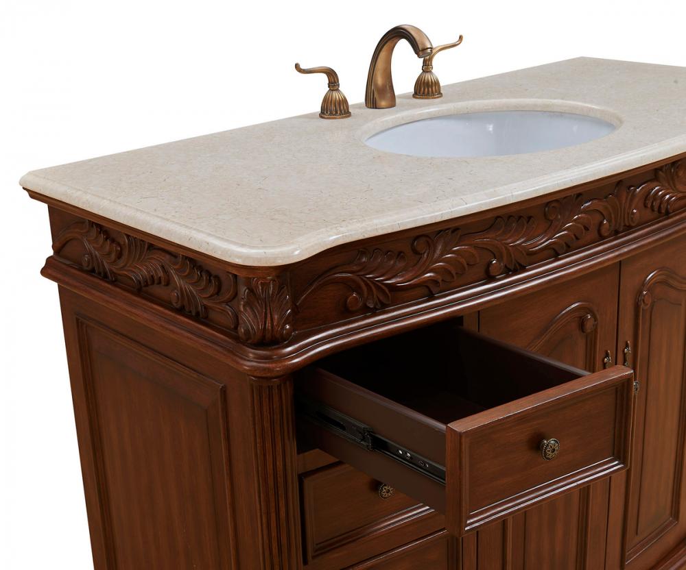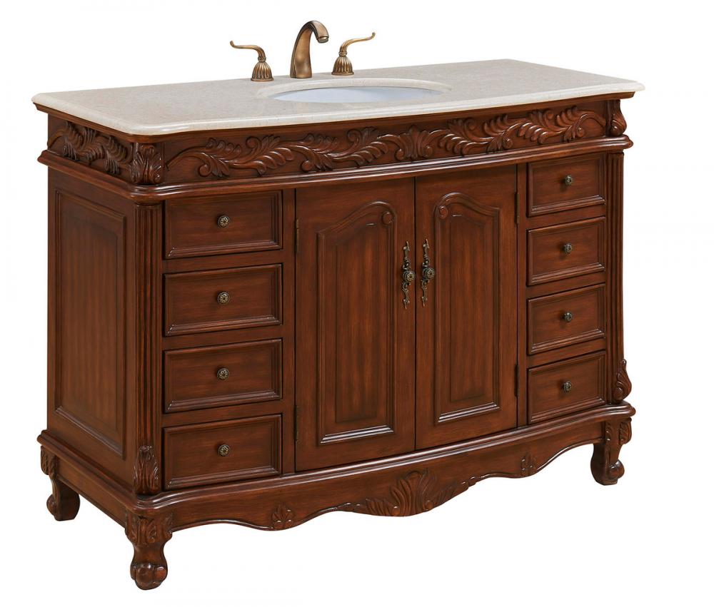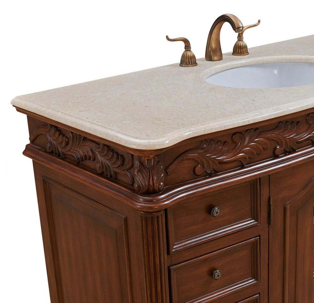 Our “Bordeaux” line of exquisite vanities includes this handpainted teak finish console with an authentic cream marble countertop, perfect to adorn your master bathroom or powder room!