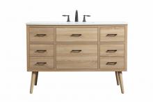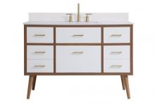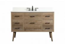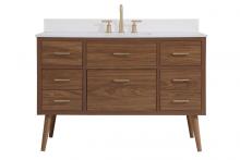 Delve into a world of minimalistic fashion and contemporary styling with this midcentury modern 48" vanity. The clean lines anchors the design, while the oblique tapered cylinder legs add subtle interest. However, the artful juxtaposition creates a blend of bright modernity and classical traditions. A gold handle adorns the top fake drawer hiding the base of the undermount porcelain sink while another one allows you to pull the bottom drawer out, letting you store your bathroom necessities and toiletries. The compact size makes it the perfect vanity for any bathroom or powder room, regardless of size.