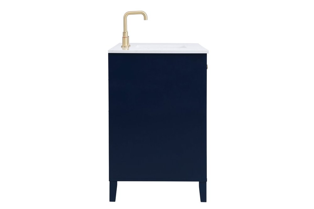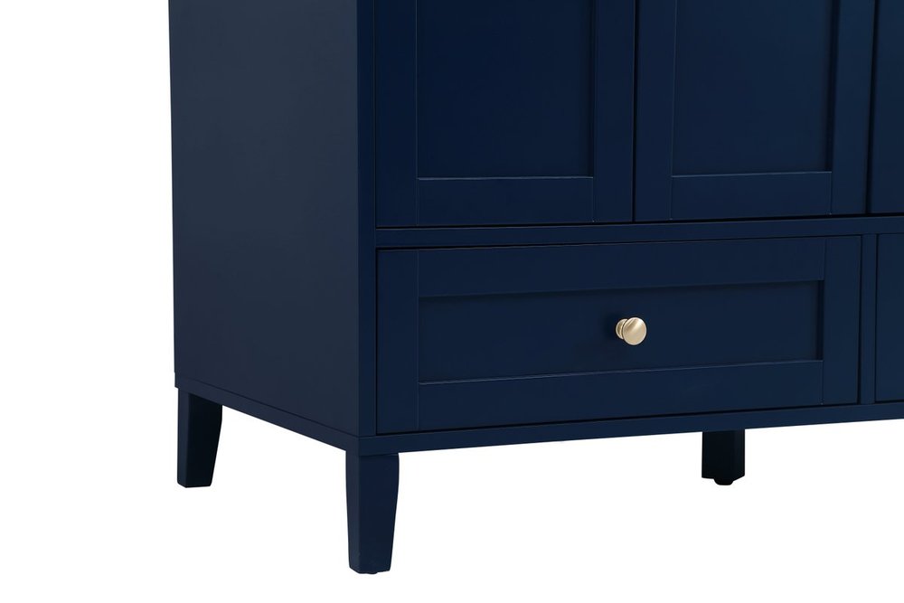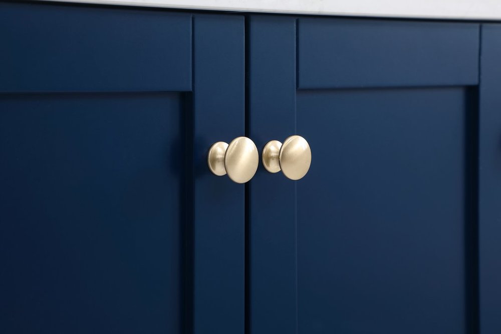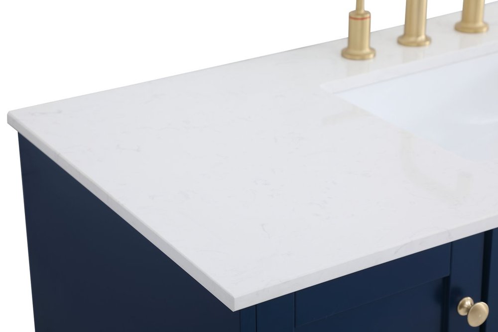 While unassuming, this 48" vanity in a Blue finish sure knows how to redefine luxury. The sleek gold knobs adorn the 4 cabinet doors and 2 bottom drawers which allow you to store your bathroom toiletries and necessities. Standing strong on oblique legs and dressed with a Calacatta engineered marble countertop, this vanity will surely create beauty and casual elegance in your bathroom or powder room.