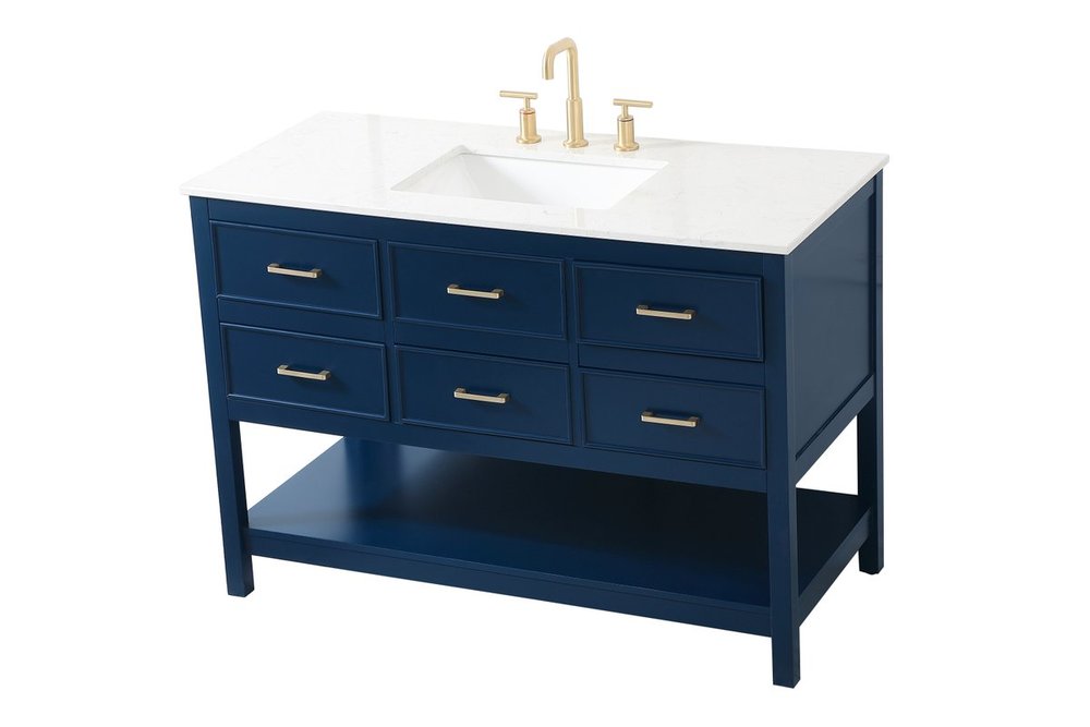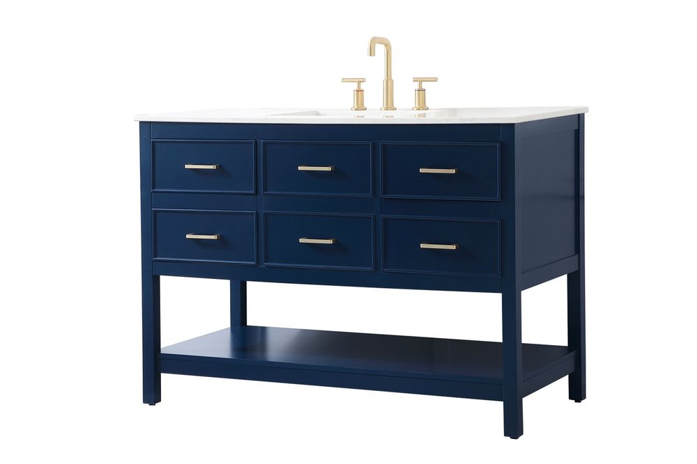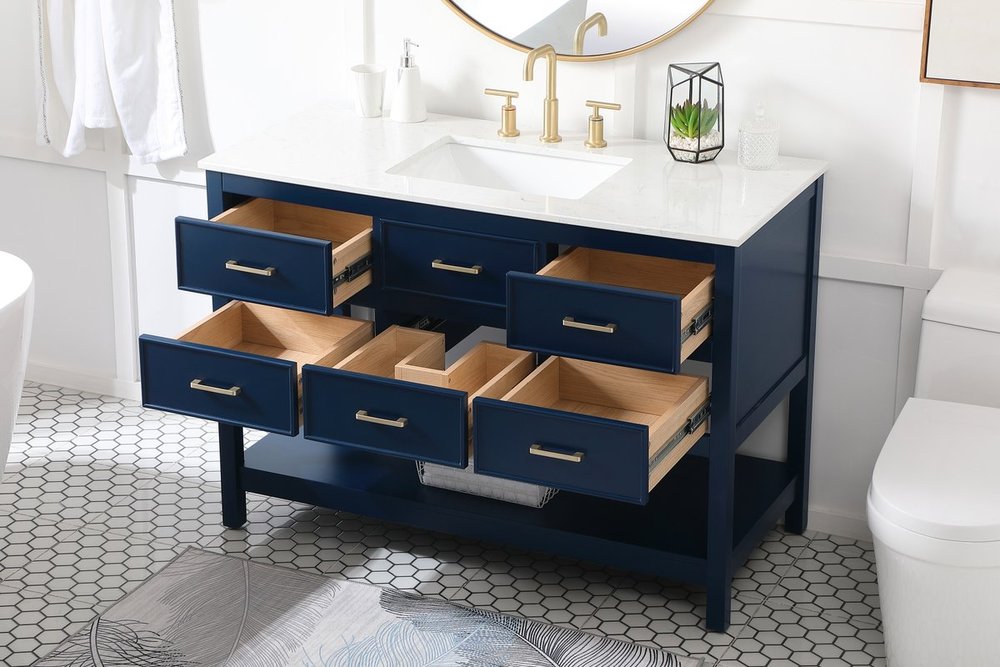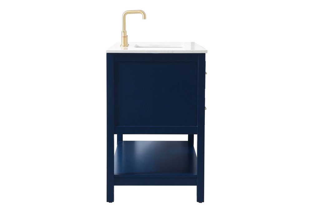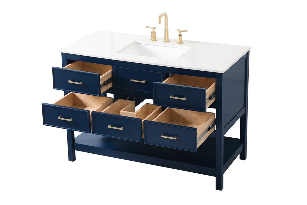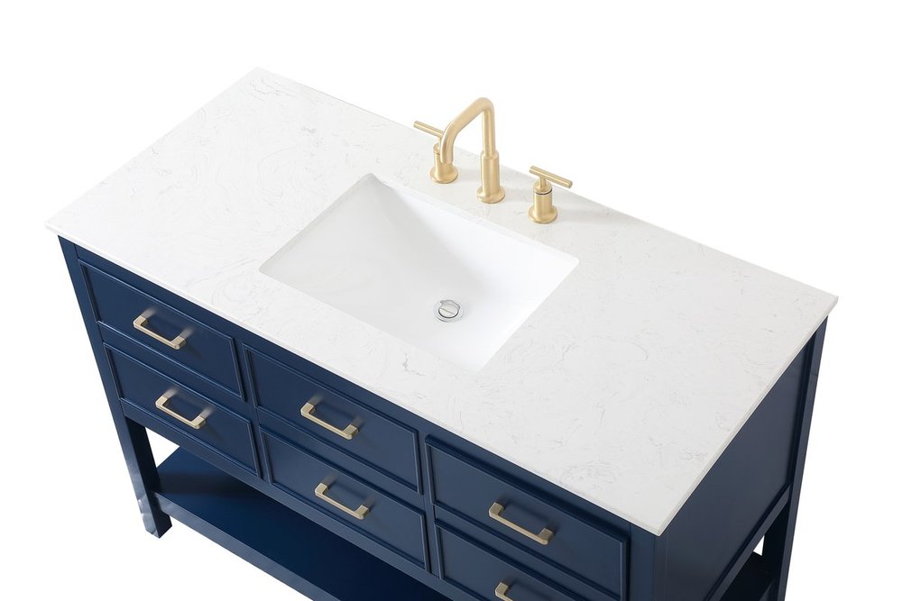 Make the most of your space with this traditional style bathroom vanity. Complements well with many aesthetics with its beautiful finish, calacatta engineered marble countertop, and the contemporary slender handle bar that sits on one false drawer and five functional drawers with soft closing mechanism, allowing you to store an assortment of bathroom essentials. The lower shelf makes it the perfect space to hold new towels for your guests. This compact vanity ensures both form and function in your bathroom or powder room for you and your guests.