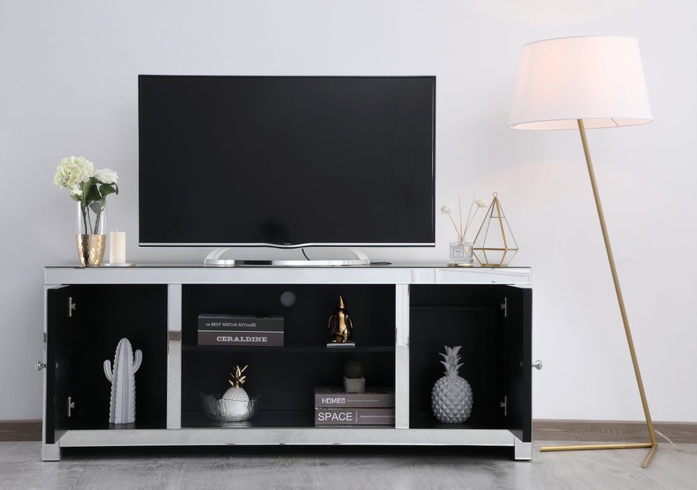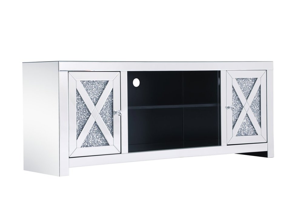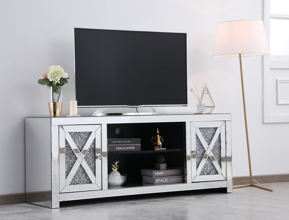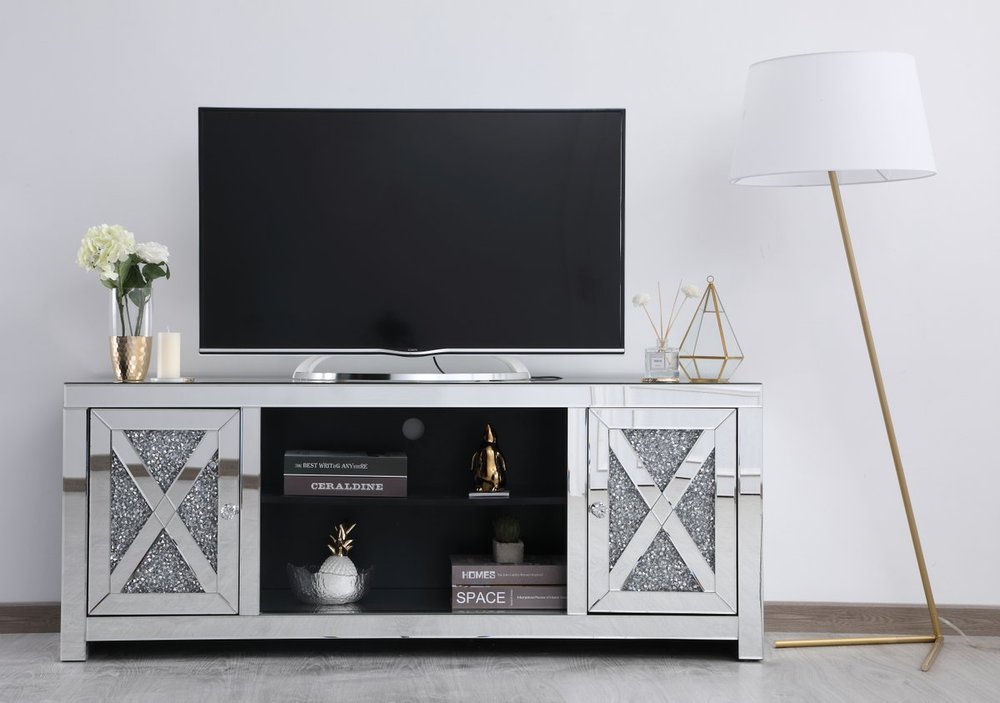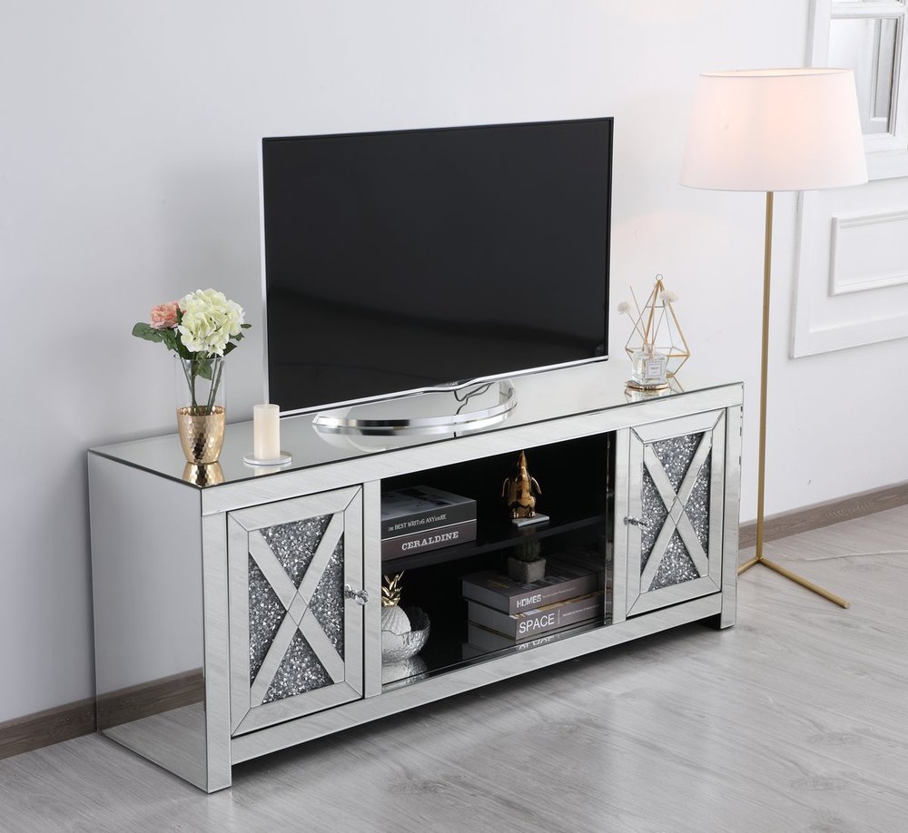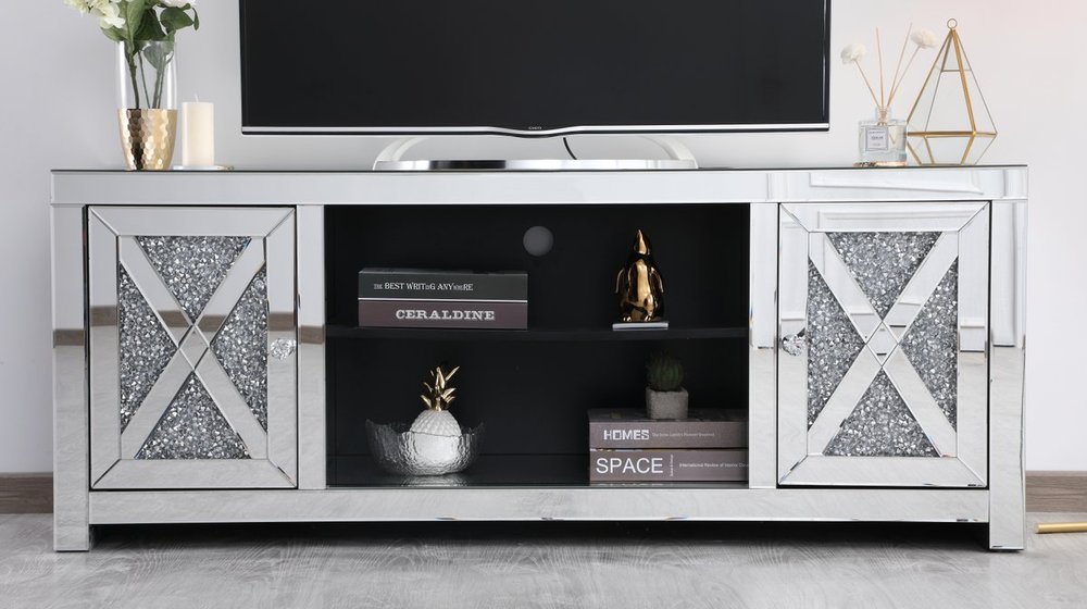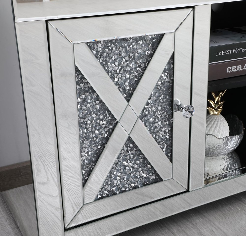 This mirror paneled tv stand is the perfect complement to your entertainment spaces. You can enjoy watching endless movies, host premier nights, or play video games until the stars are sparkling just as bright as the silver crystals that embellish the panels within the X-shaped details of the cabinet doors, which opens to reveal a storage area that is the perfect place to put away board games and various trinkets. Video game consoles and players can find a cozy spot in the middle storage area, or you can place books to read for when the tv is off. The perfect home for your tv, movies, and board games, this stand combines sparkling beauty with function.