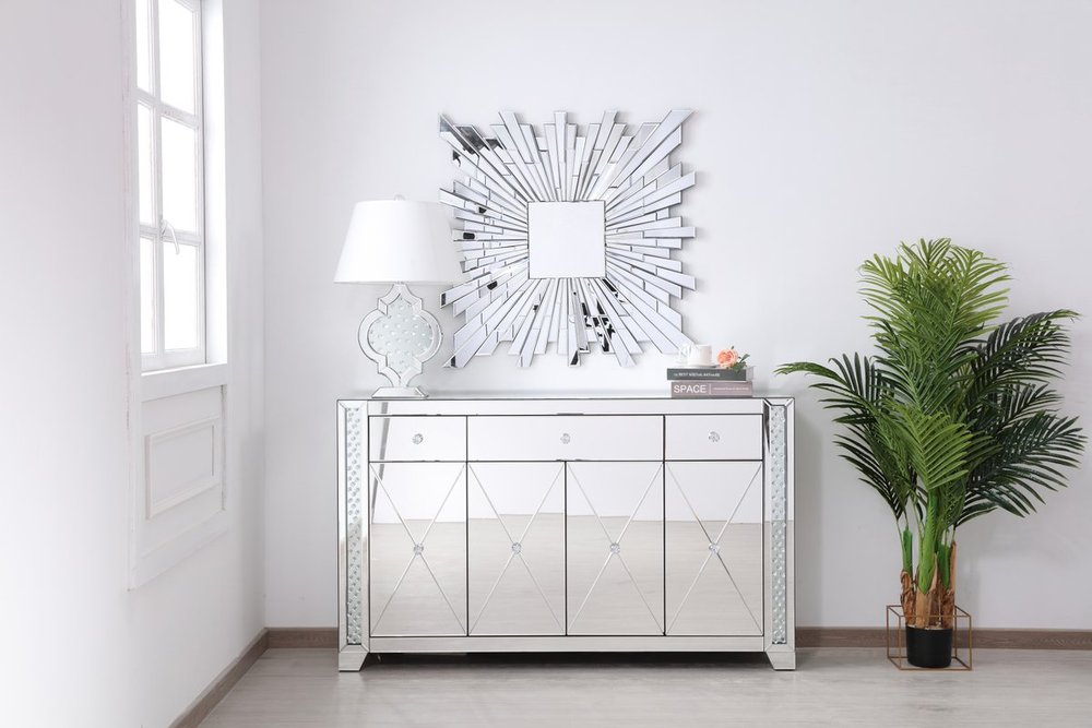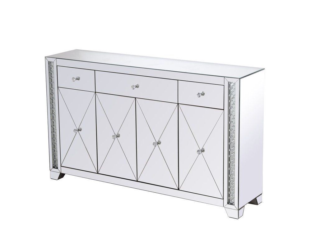 With 4 doors in bold criss-cross symmetry, measuring W60"xD14"xH36”, this modern credenza can decorate any dining room or narrow hallway and still yield plenty of storage space. With the gleaming beveled mirror surfaces and crushed diamond-like clear crystal inlay border, it opens up the visual space in the room while imbuing it with glamour. The jewel-like crystal door knobs exude sheer luxury. Fully assembled.