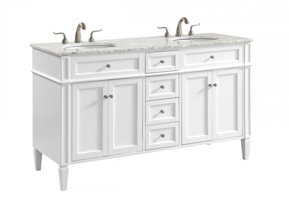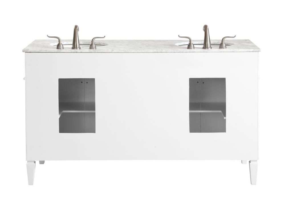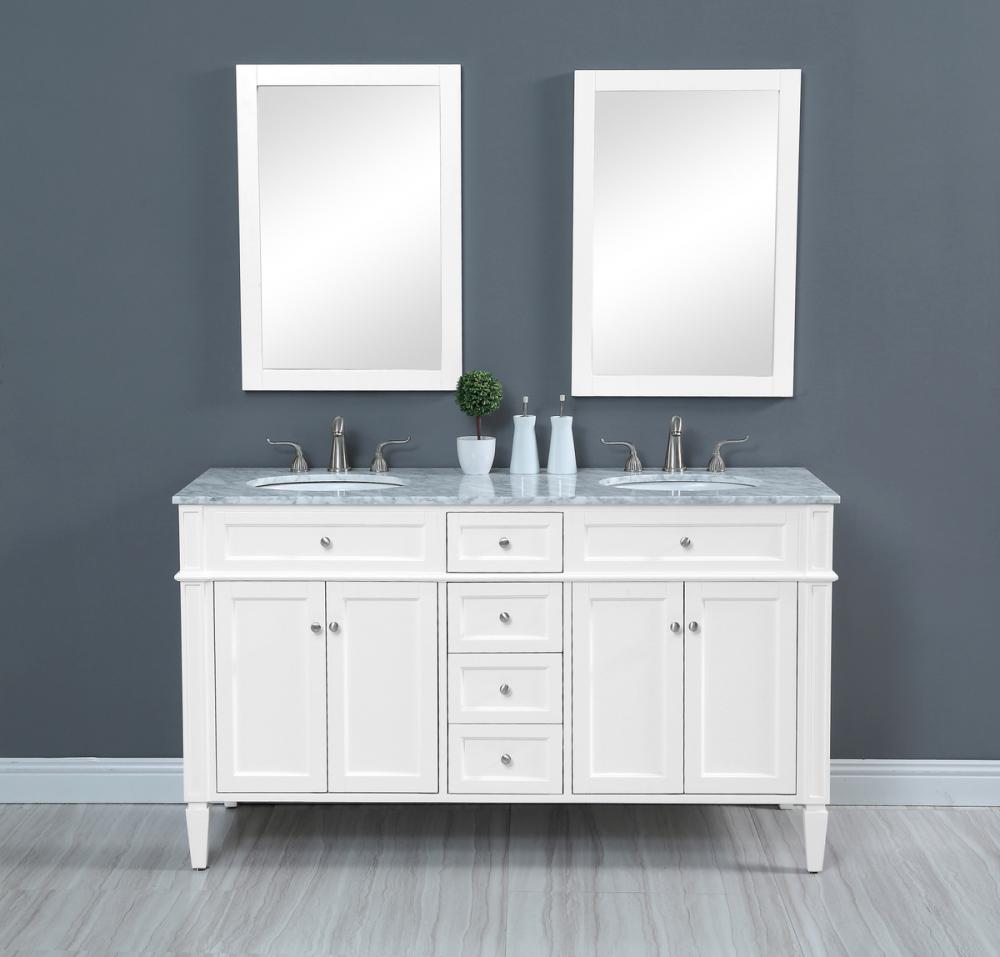 This classic, contemporary marble top vanity console from our “Park Avenue” collection is roomy enough to keep all your bath essentials close at hand. Fitted with a spacious Italian Carrara white marble counter top and 2 oval porcelain sink, you will naturally enhance your home or office bathroom with both its beauty and practicality. Featuring a hand painted white cabinet, 4 drawers in the middle, a set of recessed door with shelf inside on each side, brushed steel knob and tapered leg. measurements: W60”xD21.5”Xh35”
