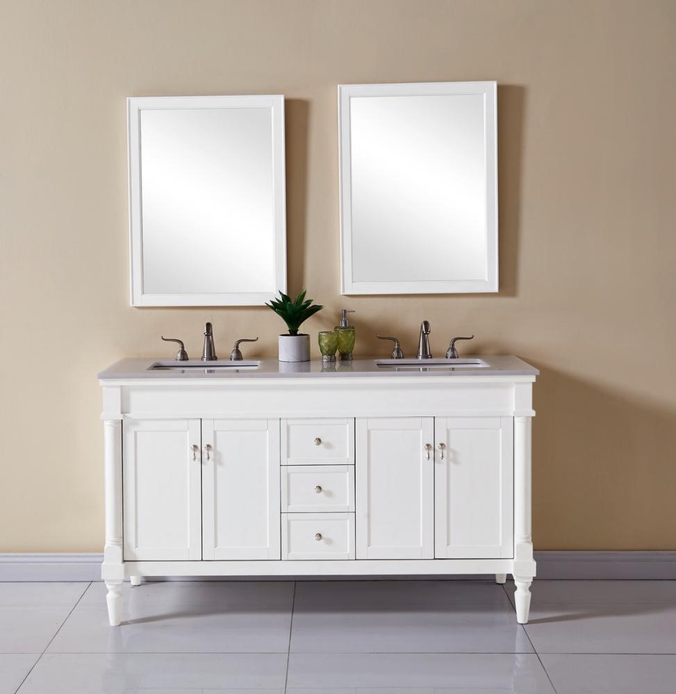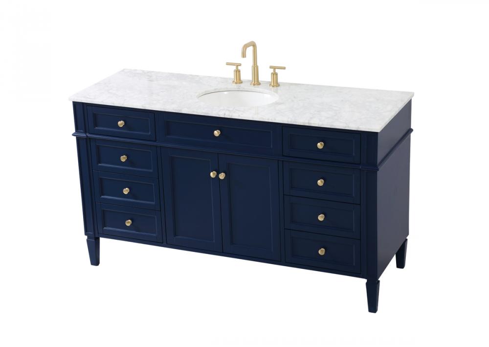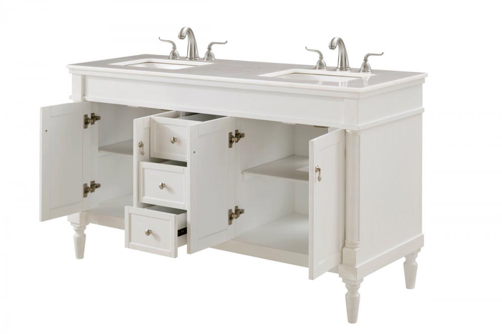 This traditionally styled, yet fashionably designed vanity can add distinction and grace to your home or office bathroom. Beautifully combining a lustrous natural white marble countertop with 2 large rectangular white porcelain under mount sink, and a hand painted antique white cabinet with 3 full extension drawers and 4 doors with shelf inside, brushed steel door pulls, standing on turned, tapering legs. You’ll enjoy its charming allure for many years to come. Measurements: W60” x D21” x H35”
