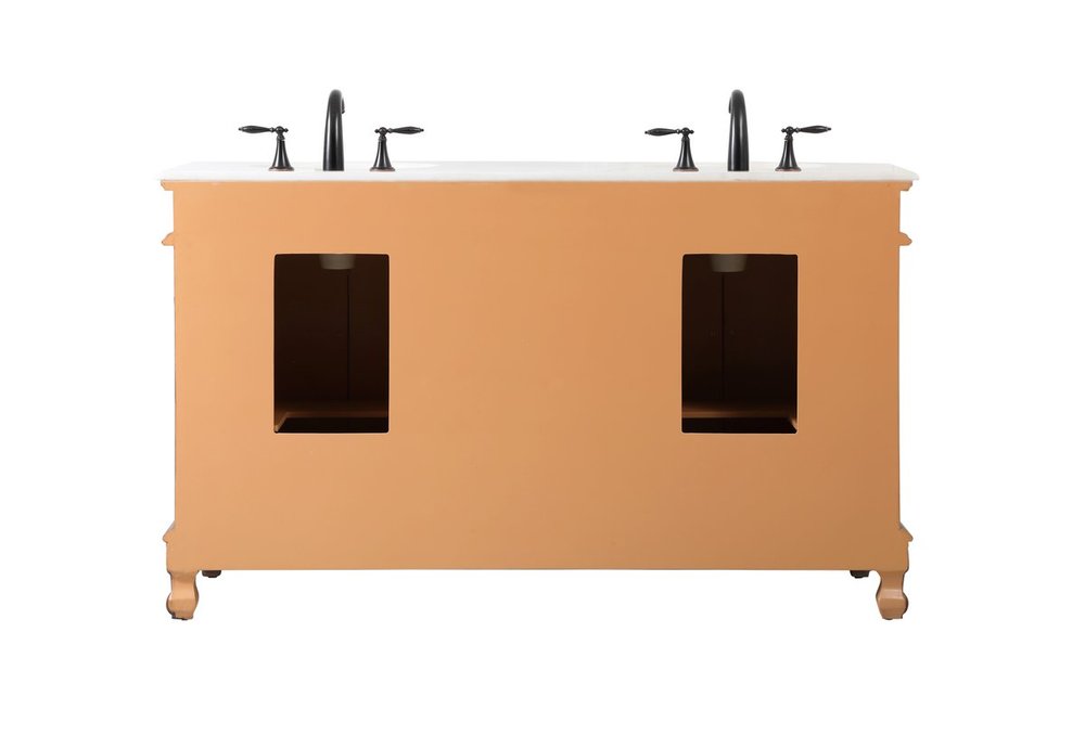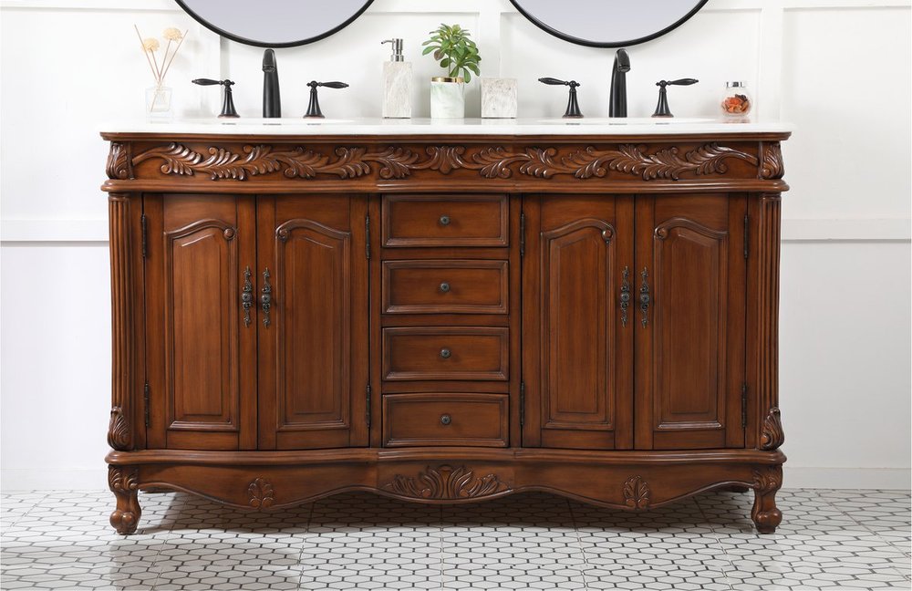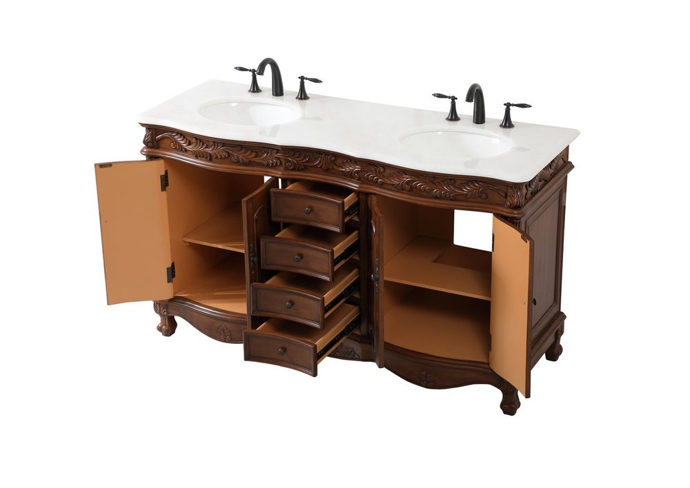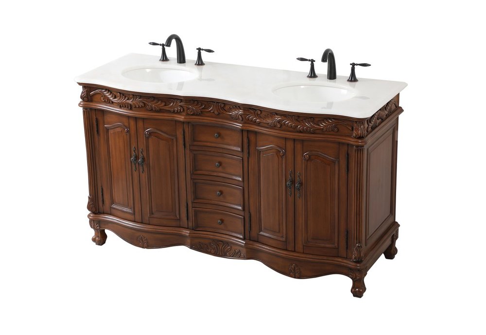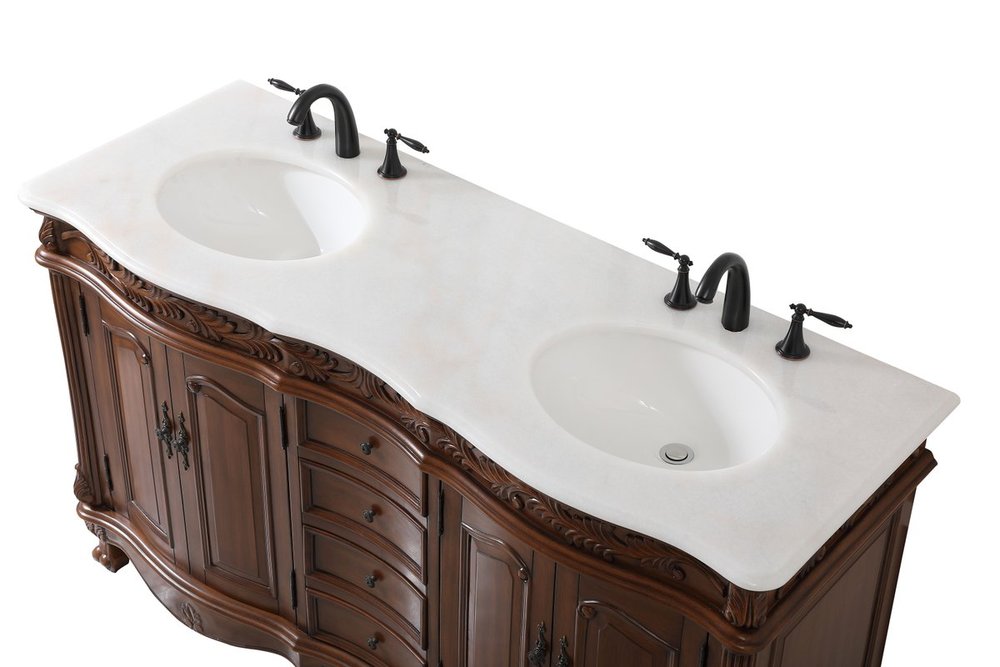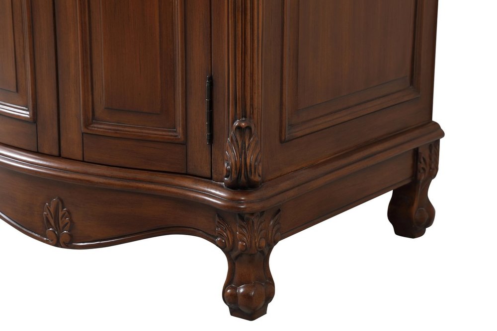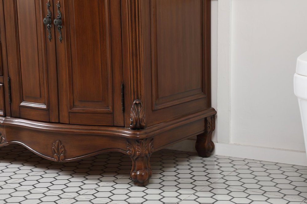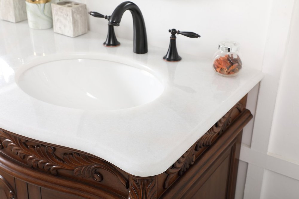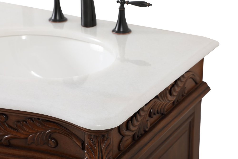Create a refined and relaxing bath space with this traditional design vanity, presenting its ornate lines. This vanity, crafted of solid poplar wood and engineered wood panels, provides ample storage within its soft-close cabinet door, accentuated with metal hardware. Rounding out the design is an off-white marble with some brown veining in the stone. Comes with a white porcelain under-mount oval sink. Ships fully assembled.