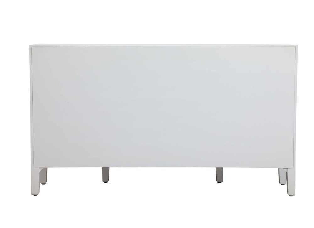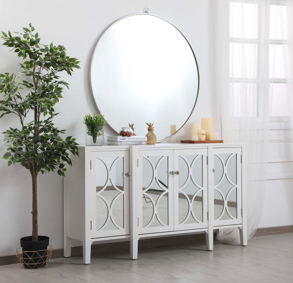 This white finish cabinet is demure luxury mixed with subtle charm. Delicate crystal knobs adorn the 4 cabinet doors, while the clear mirror panels, and the overlapping semi-circle design, adds a touch of glam and modern luxe. Whether a table lamp rests on the top, or you hide away trinkets within the storage space, this is the perfect accent to any room.