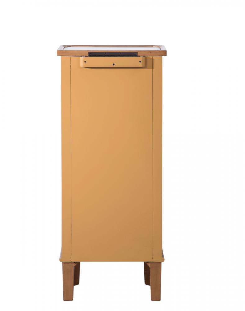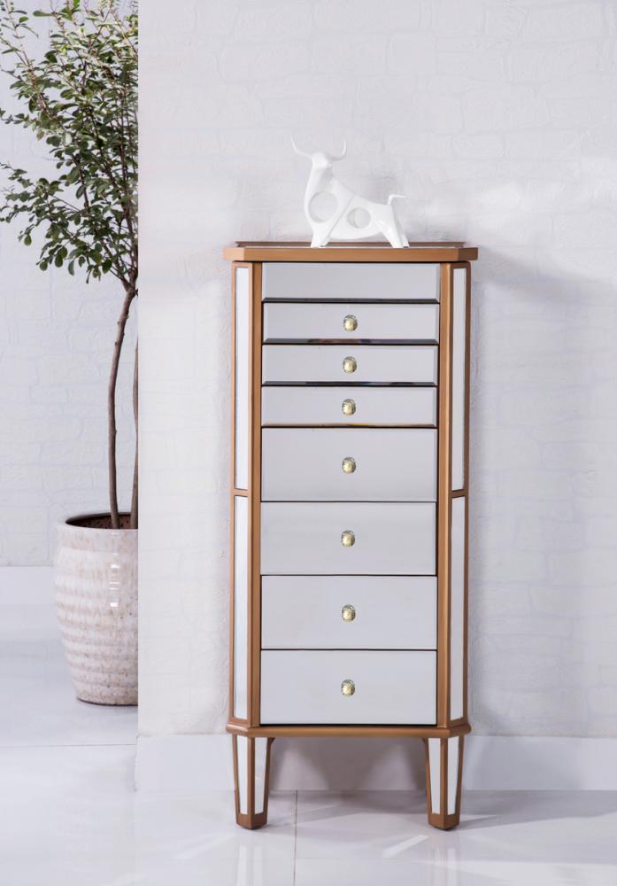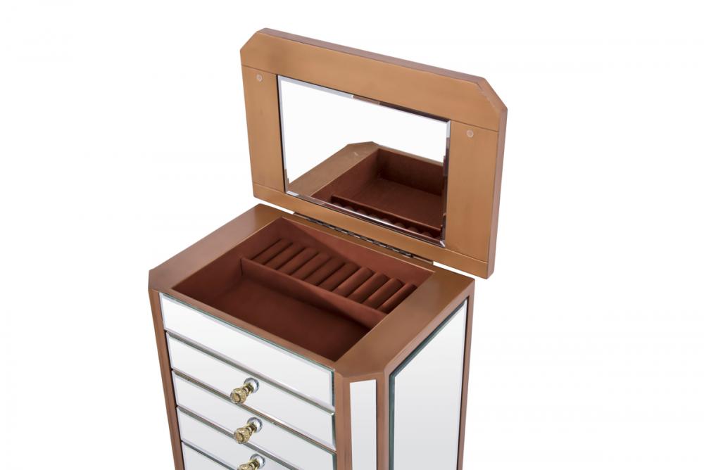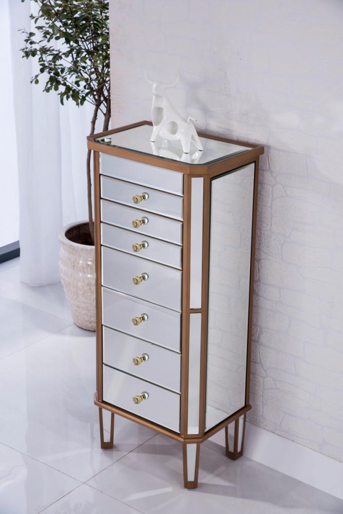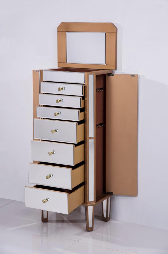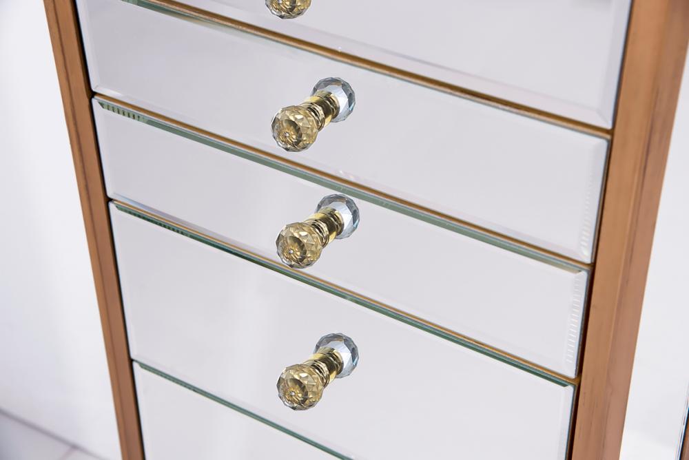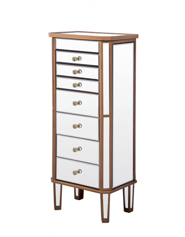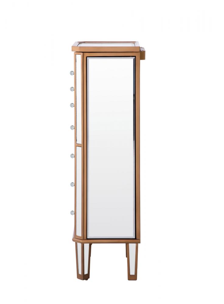 Decorated in handed-rubbed gold finish, crystal knobs and mirror inlaid tapered legs, this truly chic jewelry armoire, which features a flip-top clear mirror, will add opulence and beauty to the bedroom, bathroom or walk-in closet.