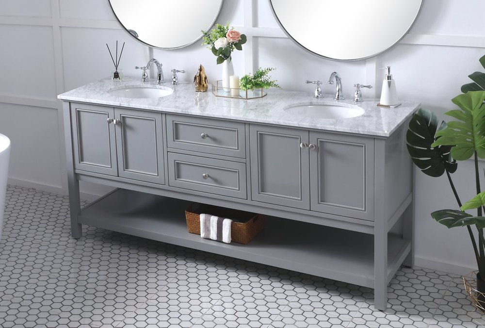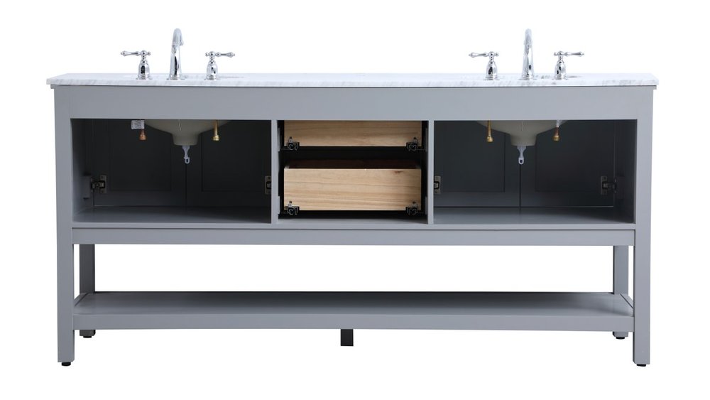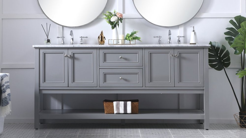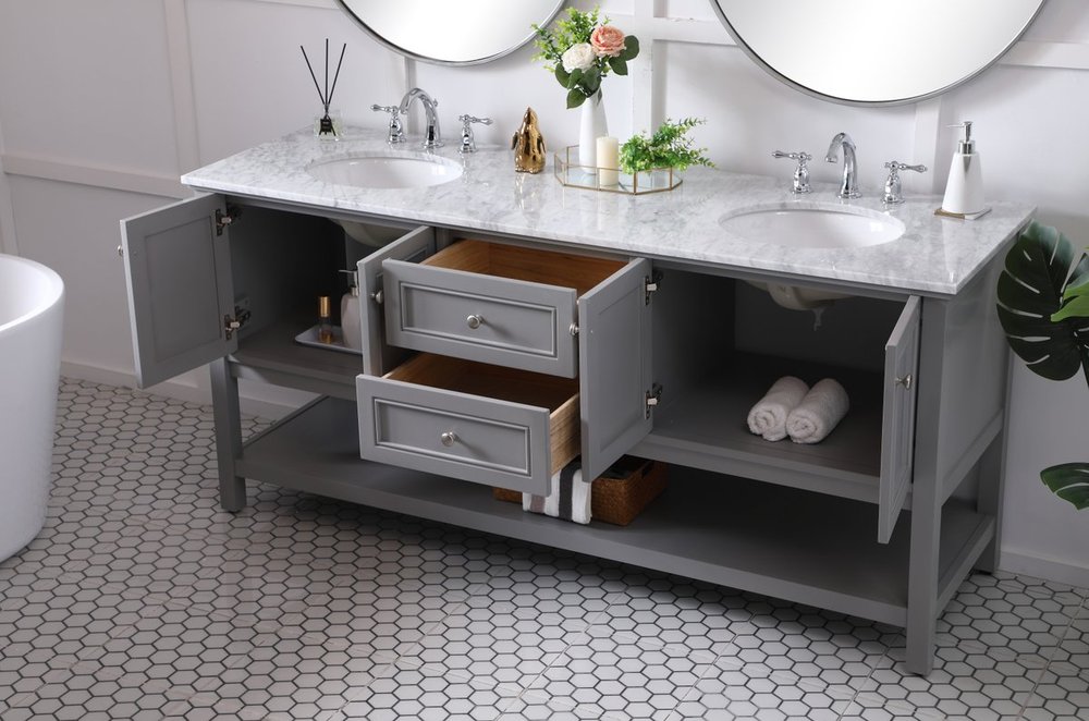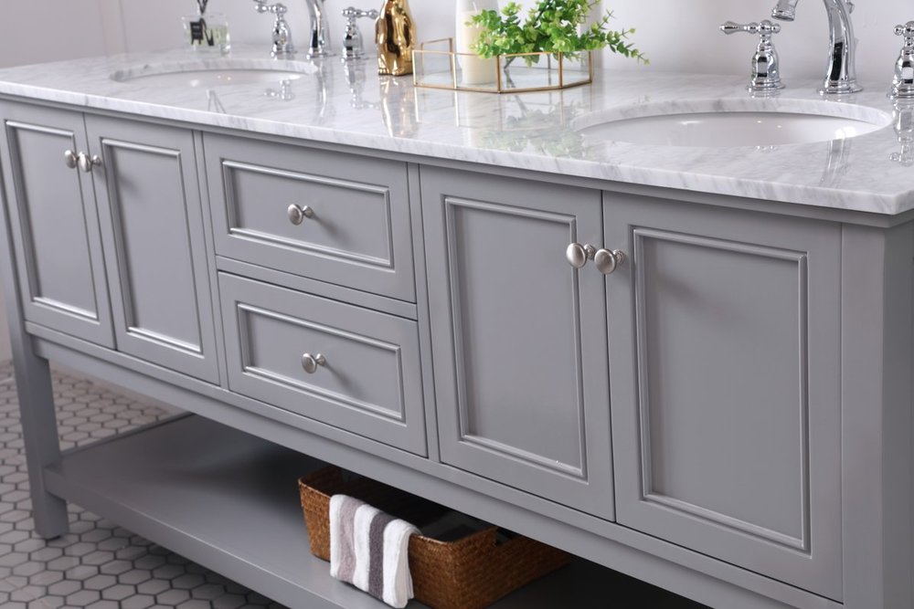 Create a refined and relaxing bath space with this contemporary design vanity, presenting its simplicity and clean straight lines in a minimalist appeal. This 60" freestanding vanity, crafted of solid poplar wood in soft-grey finish, provides ample storage within its double center drawers and 4 side doors, all equipped with soft closing mechanism and accentuated with gleaming chrome hardware. Rounding out the design is a luxurious Itallian Carrara white marble countertop and double white porcelain under-mount oval sink.